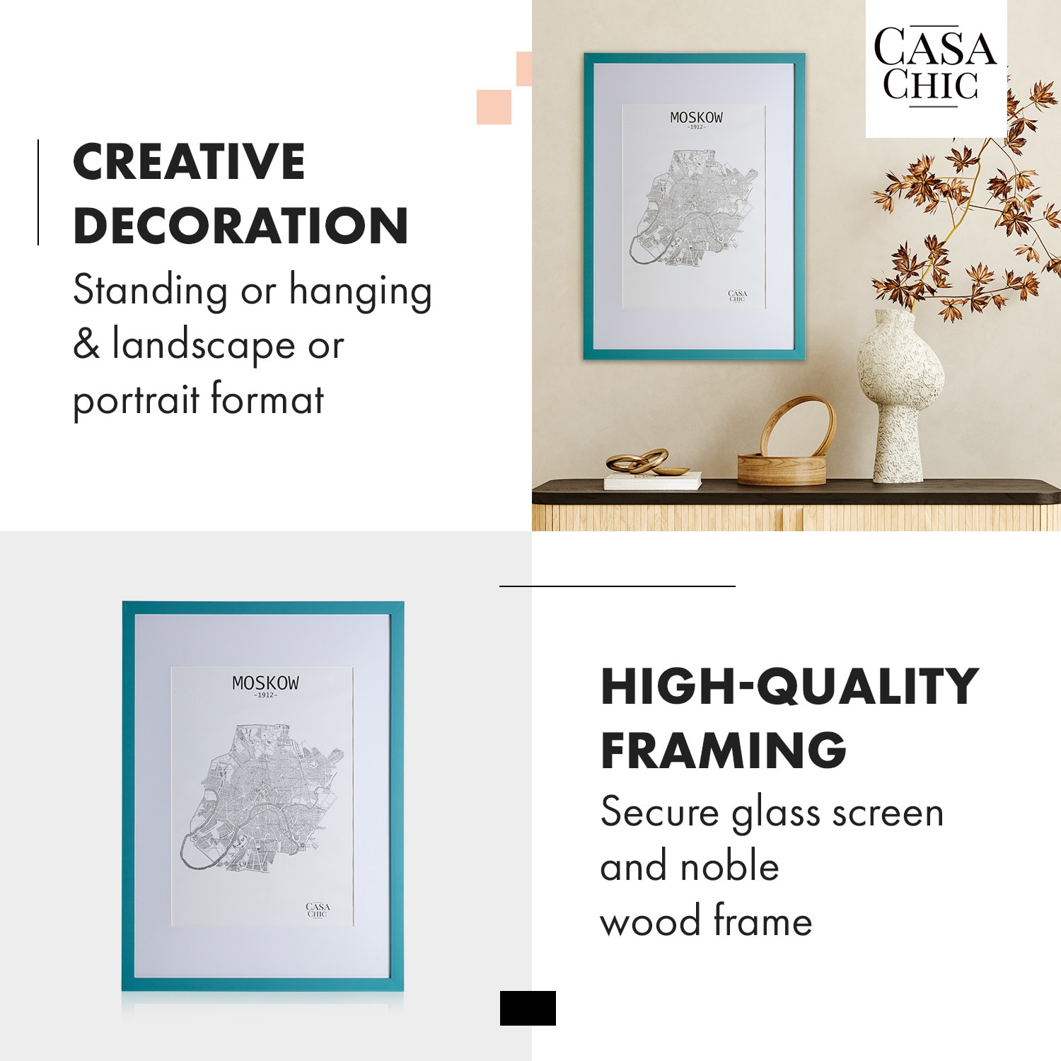 Vystavte pútavo vaše obľúbené fotky a obrazy s rámami na obrazy od Casa Chic by blumfeldt. Vysokokvalitné rámy z pravého dreva svojou jednoduchou eleganciou skrášlia steny vašej izby. Vďaka priloženej pasparte si zvolíte vhodný výrez pre obraz na šírku alebo na výšku. Za plexisklom, odolným voči rozbitiu, budú vaše umelecké diela dokonale chránené pred prachom a nečistotami. S fotorámikmi Kenton bude každá fotografia pastvou pre oči.