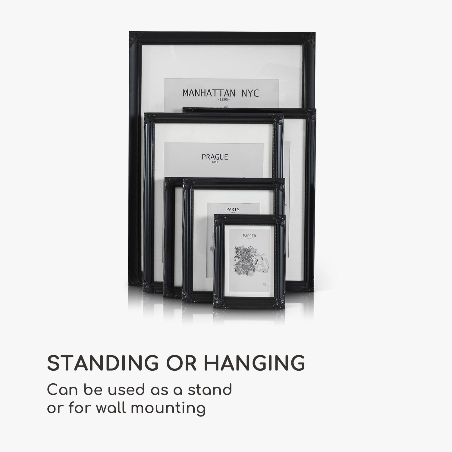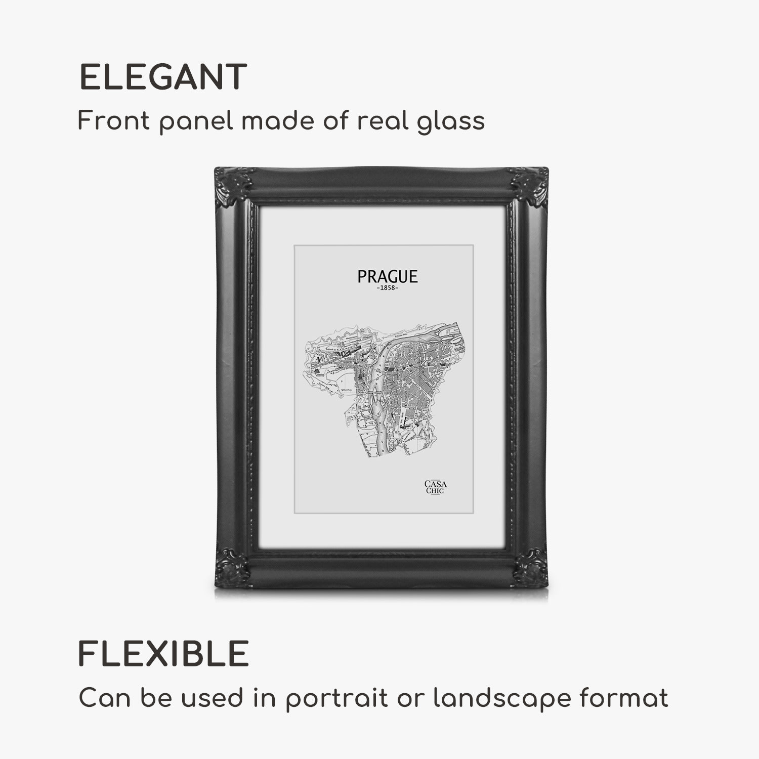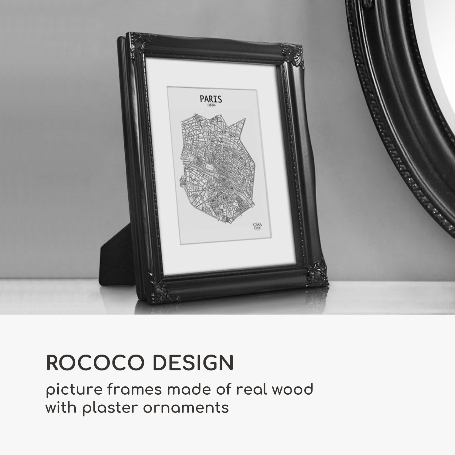 Rámy na obrazy Regent od Casa Chic by blumfeldt sú vyrobené z pravého dreva a zdobené sadrovými ornamentmi. Dokonale prezentujú tvoje fotografie a obrazy vo formáte na výšku aj na šírku. Dômyselne navrhnutý profil rámu v rokokovom dizajne tvorí nádherný kontrast k modernému zariadeniu. Vytvor nástenné koláže alebo rozmiestni svoje obľúbené fotografie na príborník či na poličku. Priložená pasparta ponecháva výber vhodnej časti obrázku na teba. Sklenená tabuľa chráni pred prachom aj nečistotami a zároveň dotvára elegantný vzhľad rámov Regent.Vždy stredobodom pozornosti: fotorámčeky Regent od Casa Chic by blumfeldt.