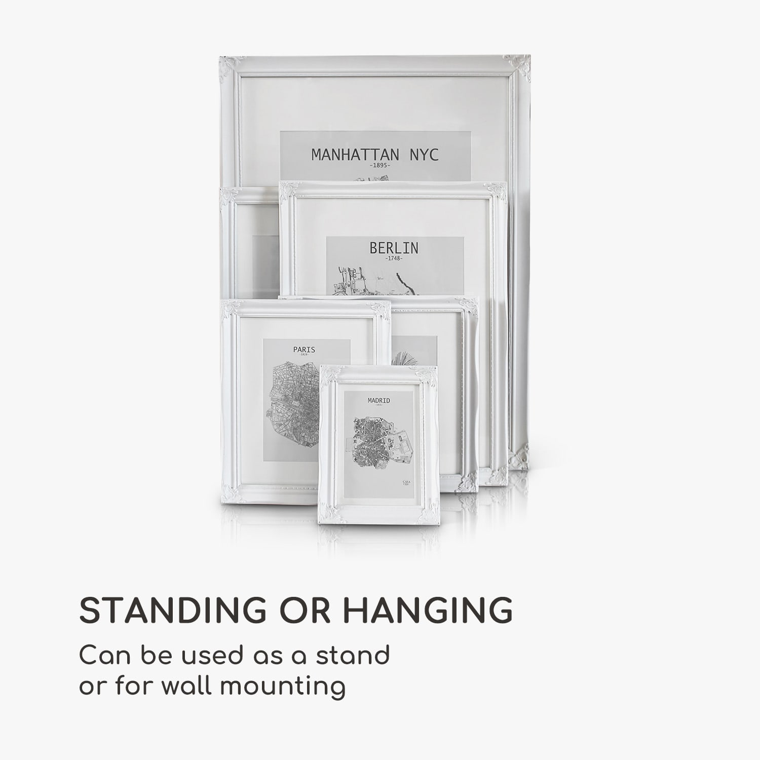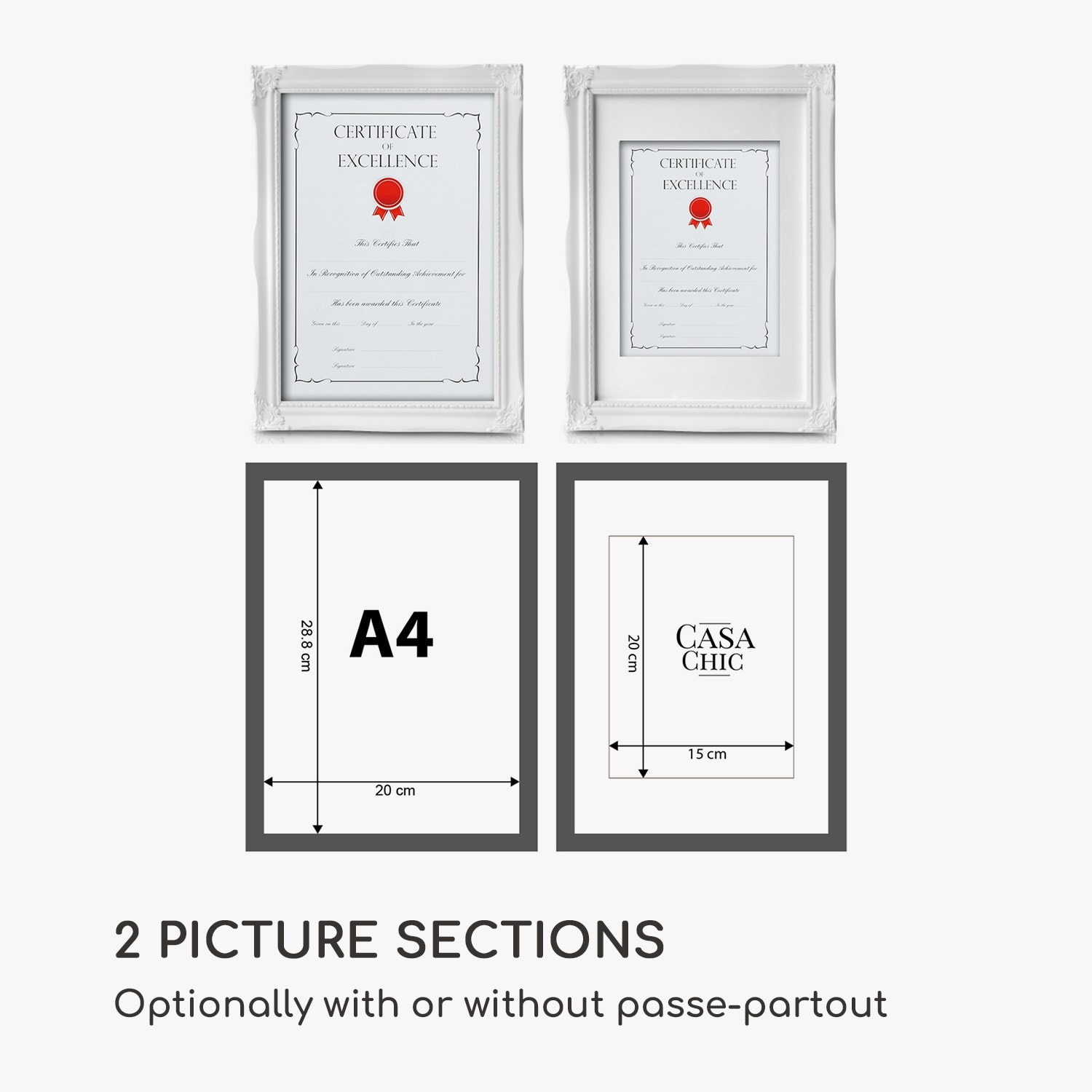 Rámy na obrazy Regent od Casa Chic by blumfeldt sú vyrobené z pravého dreva a zdobené ornamentmi zo syntetickej živice. Dokonale prezentujú tvoje fotografie a obrazy vo formáte na výšku aj na šírku. Dômyselne navrhnutý profil rámu v rokokovom dizajne tvorí nádherný kontrast k modernému zariadeniu. Vytvor nástenné koláže alebo rozmiestni svoje obľúbené fotografie na príborník či na poličku. Priložená pasparta ponecháva výber vhodnej časti obrázku na teba. Sklenená tabuľa chráni pred prachom aj nečistotami a zároveň dotvára elegantný vzhľad rámov Regent.Vždy stredobodom pozornosti: fotorámčeky Regent od Casa Chic by blumfeldt.
