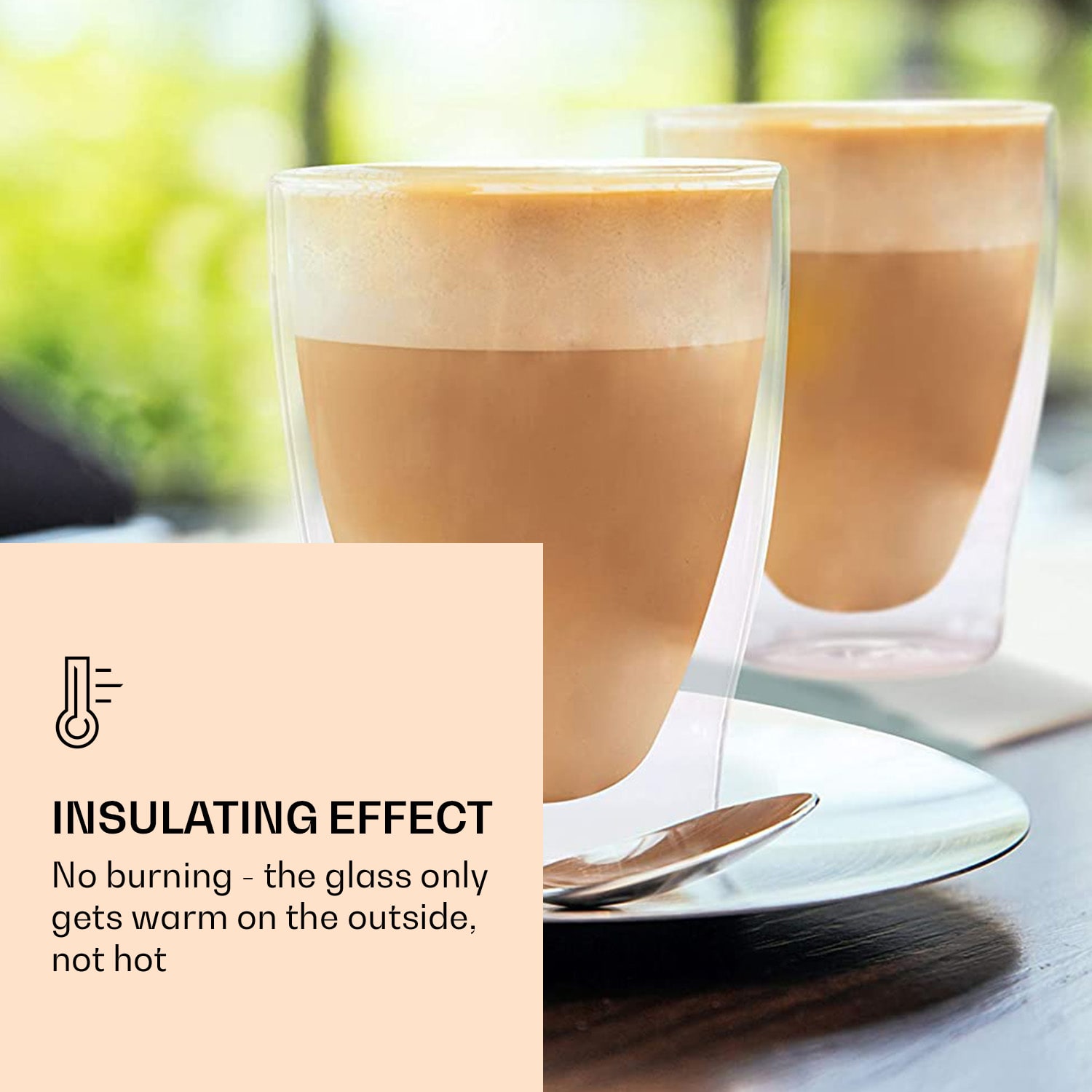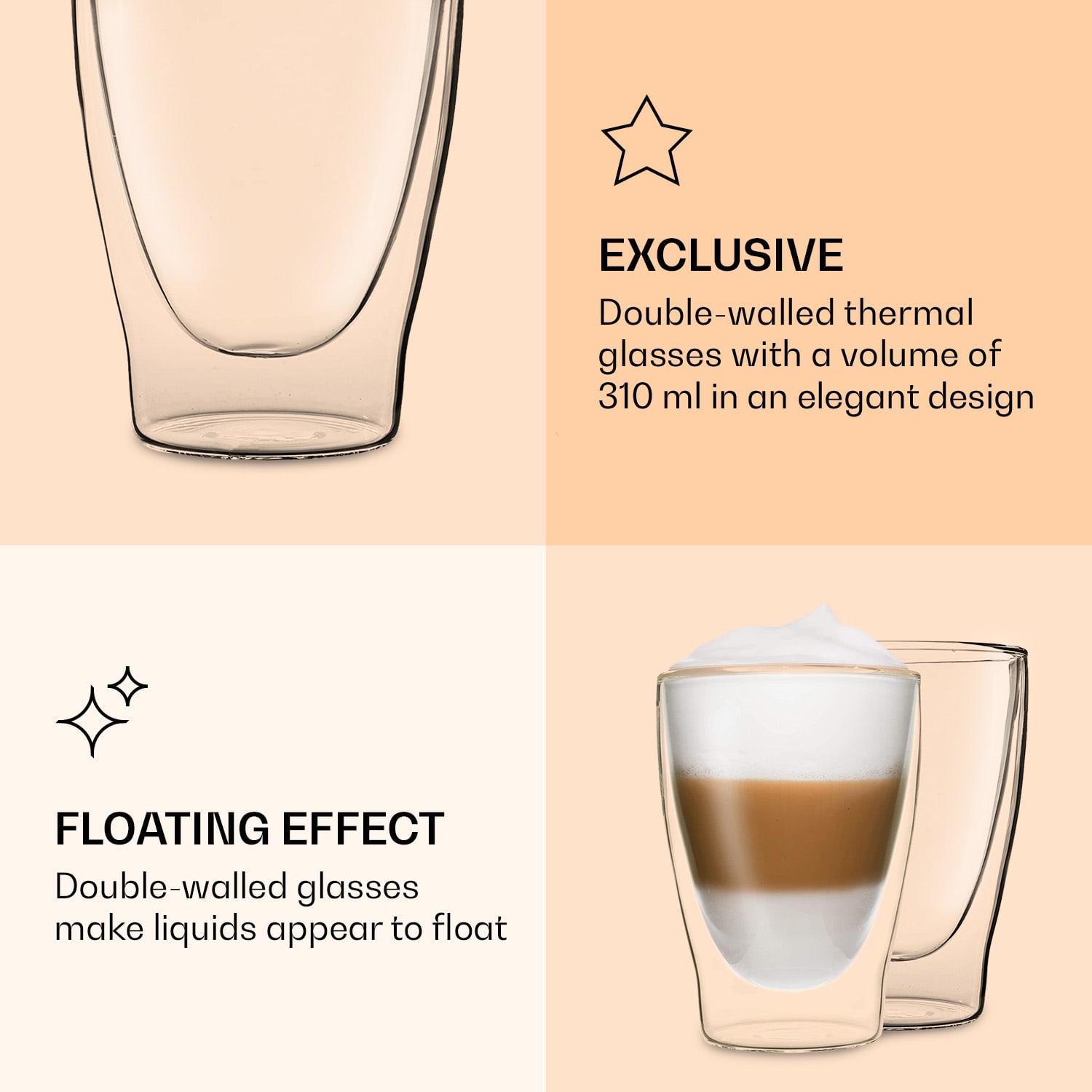 Luxusný pohár DUOS od Feelino by Klarstein je vyrobený ručne a svojím elegantným dizajnom obohatí vaše obytné prostredie. Dvojitá sklenená vrstva udrží studené nápoje dlhšie studené a teplé nápoje dlhšie teplé. Tento atraktívny pohár na espresso, čaj, panáky, aperitívy alebo dezerty je vyrobená z borosilikátového skla a je mimoriadne odolný a žiaruvzdorný: Je odolný proti poškriabaniu, veľmi ľahký a samozrejme vhodný do umývačky riadu. Systém dvojitých stien poskytuje aj úžasný optický efekt, vďaka ktorému sa zdá, že sa kvapaliny vznášajú. Štýlové, robustné a ručne vyrobené – dvojstenné termo poháre DUOS od spoločnosti Feelino by Klarstein.