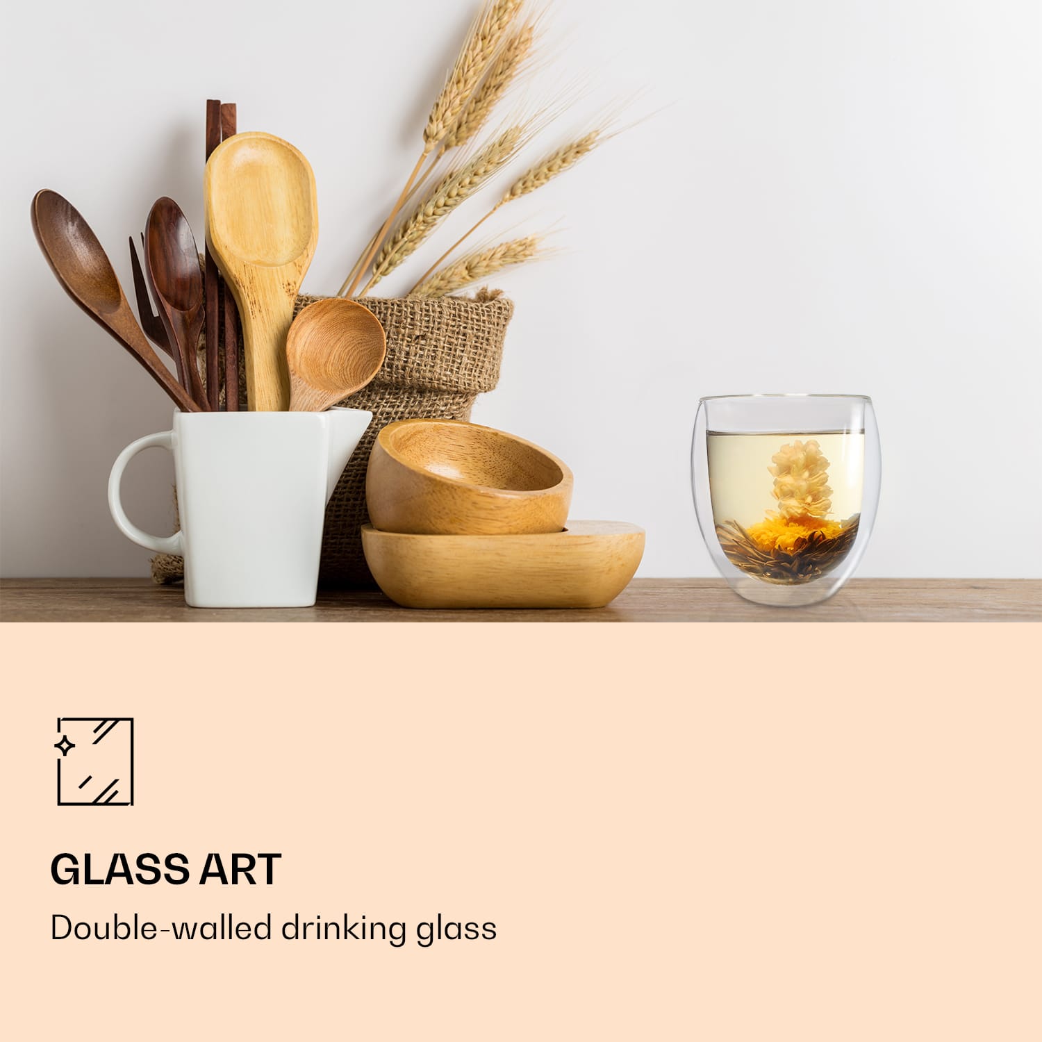 Oblé sklárske umenie: Vychutnanie si čaju z exkluzívneho pohára Ice od Feelino by Klarstein je prekrásnym prírodným divadlom, keď sa v baňatom pohári rozvinie prirodzená farba čaju. Pohľad je dychberúci, pretože váš nápoj akoby sa v baňatom pohári zázračne vznášal. Tento dekoratívny vzhľad je dosiahnutý vďaka výrobe z dvojstenného borosilikátového skla.Popritom zažijete s čajovým pohárom Ice od Feelino by Klarstein aj ideálny komfort pri pití čaju. Dvojitá vrstva skla mení uzavretý vzduch na izolačnú vrstvu, takže horúce ostane dlhšie horúcim a studené studeným. Pohár na čaj Ice je ručne fúkaný, s jedinečnou, veľmi odolnou kvalitou, vďaka ktorej je každý pohár unikátny. Vzhľad s vysokým leskom a harmonický zaoblený dizajn pôsobia exkluzívne – pohár je veľmi ľahký, odolný proti poškriabaniu a vhodný do umývačky riaduČarovné chvíle s plávajúcim čajom: V fúkanom pohári na čaj Ice od Feelino by Klarstein sa luhovanie čaju stáva farebným pôžitkom a navodzuje dojem, že sa v pohári vznáša.