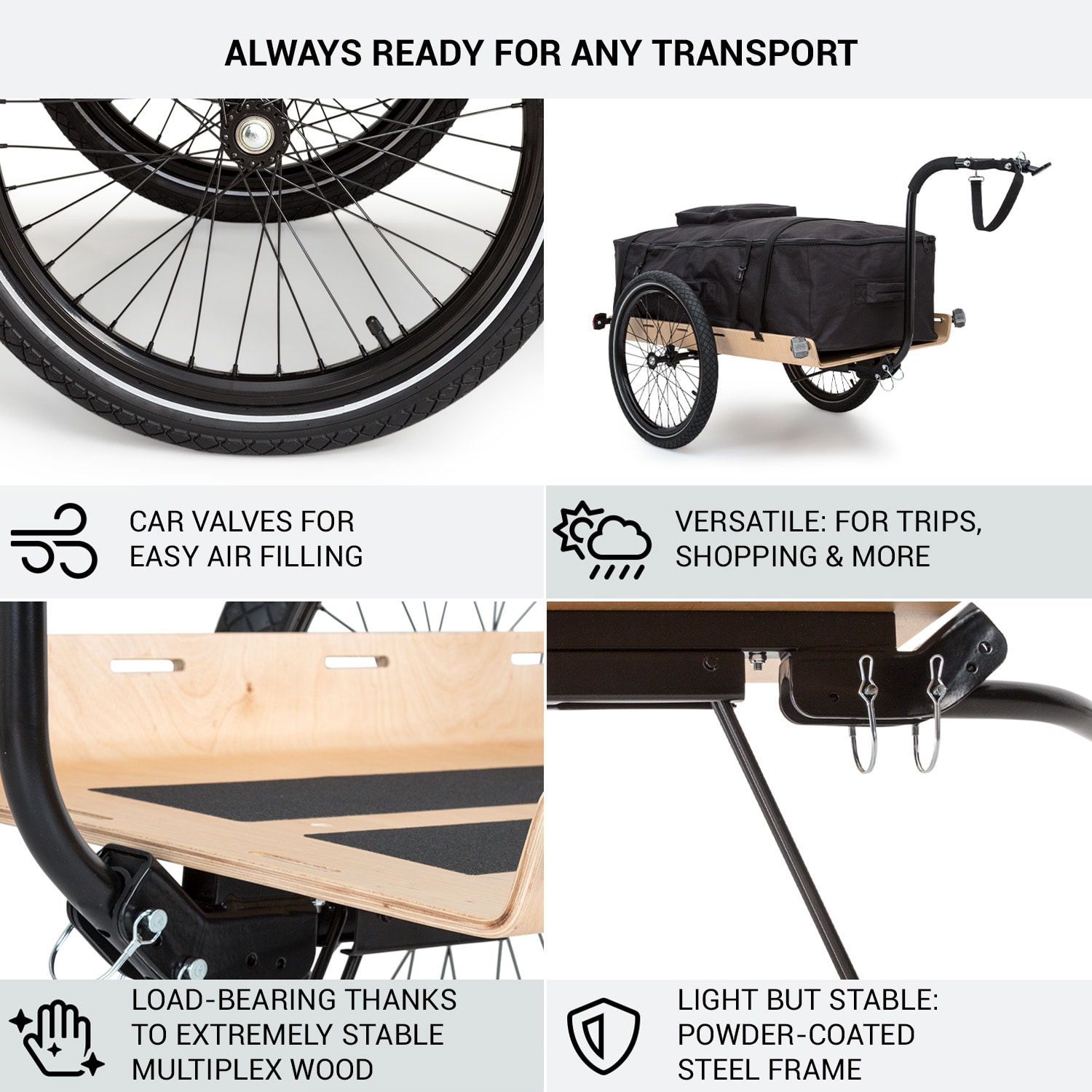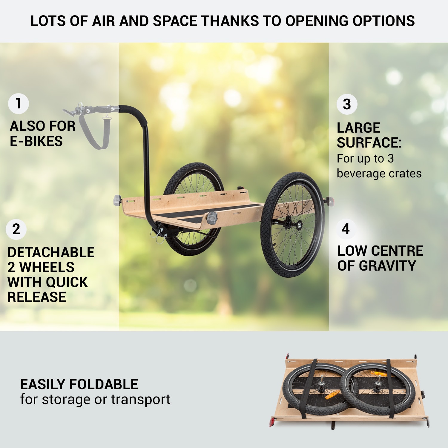 Dobíjajte a prepravujte ekologicky! Nákladný príves Companion Travel L od Klarfit je špecialistom, pokiaľ ide o jednoduchú prepravu na bicykli alebo pešo – na nákupy, záhradkárčenie, pikniky, športové vybavenie na tréning v prírode alebo dokonca na trekingové túry na bicykli. Do veľkého nákladného priestoru prívesu na bicykel Companion Travel L od Klarfit sa ľahko zmestí batožina, ako aj tri prepravky na nápoje, vrecia so zeminou alebo kompletné kempingové vybavenie. Príves so stabilnou konštrukciou z 1 cm hrubého multiplexového dreva má nosnosť až 40 kg. Dodávané napínacie popruhy odolné proti roztrhnutiu sú upevnené na oboch stranách v piatich úchytoch a istia náklad. Používanie ručne alebo na bicykli je určené výlučne upevnením oje. S dvoma bezpečnostnými čapmi ju môžete umiestniť ako vysoko alebo nízke oje. Rozkladací stojan zabezpečuje pevné postavenie vozíka s jednou nápravou. Vysoký komfort pri rolovaní zabezpečujú 16″ pneumatiky s bezskrutkovým zásuvným systémom a hrubými 1,95″ dušami. Dve biele a dve červené odrazové sklíčka sú už namontované pre dobrú viditeľnosť v cestnej premávke.Na dlhšie trekingové túry alebo na všeobecnú ochranu pred poveternostnými vplyvmi a nečistotami sú k dispozícii objednateľné nepremokavé prepravné tašky.Zdravé, ekologické a veľmi jednoduché: s prívesom na bicykel a ručným vozíkom Companion Travel L od Klarfit sa môžete vydať na trekking alebo dokonca na ťažkú prepravu bez auta.Upozorňujeme, že sa pre úplnú bezpečnosť prívesu na ceste vyžaduje červené zadné svetlo.