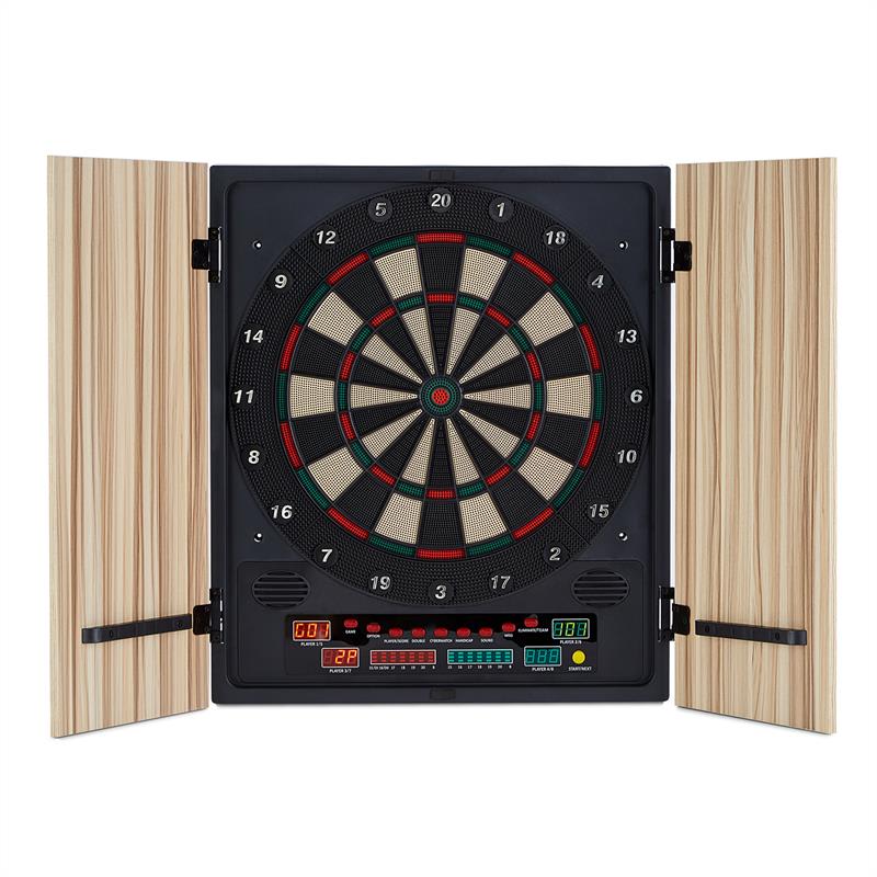 S terčom oneConcept Dartmaster 180 získate zábavu zo šípok priamo vo Vašej obývačke.Skladací set pre hru šípok od spoločnosti oneConcept obsahuje terč na šípky s elektronickým LED displejom a dvanástimi šípkami a tiež sieťový zdroj. Elegantný terč je zostavený v pár krokoch a hádzanie šípok môže hneď začať. Začiatočníci môžu so zariadením Dartmaster 180 v pokoji trénovať. Skutoční profesionáli súperia navzájom alebo čelia počítačovému súperovi, ktorého možno nastaviť v rôznych úrovniach obťažnosti. Zvlášť praktické je kvalitné LED zobrazovanie. Na viacerých displejoch sú zobrazené výsledky spoluhráčov. Lístok, pero a zložité počítanie z hlavy sú odteraz minulosťou. Počítane a značenie preberá počítač. Vy sa môžete plne sústrediť na dokonalý hod. Nič nie je zábavnejšie ako vydarený večer pri šípkach so Vašimi najlepšími priateľmi. O to lepšie, ak si pri tom netreba robiť starosti o obľúbený nábytok. Dodávané plastové šípky majú mäkkú, ohybnú špičku, a teda nezanechávajú žiadne škrabance. Najmä keď raz miniete cieľ. Celkovo dostanete v produktovej sade štyrikrát tri šípky v rozličných prevedeniach.Terč oneConcept Dartmaster 180 zaručuje nielen veľa zábavy, ale tiež presvedčí svojím dizajnom. Ak je sa terč na šípky nepoužíva, môže sa ukryť za dvomi elegantnými drevenými dvierkami. Biele logo na prednej strane je dekoratívnym stredobodom v každej hobby miestnosti.