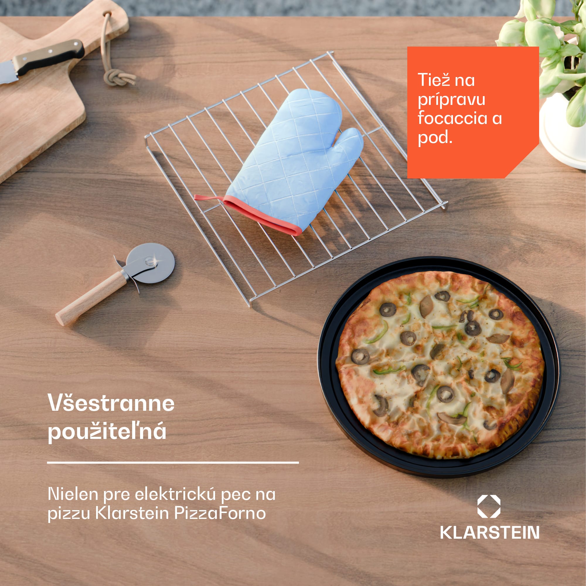 Pečte pizzu ako profesionáli: Súprava príslušenstva Klarstein PizzaForno je absolútnou nevyhnutnosťou pre pec na pizzu vo vašej kuchyni. Či už špeciálne navrhnuté pre elektrickú pec na pizzu Klarstein PizzaForno (číslo produktu 10046146), rúru alebo gril – s praktickou sadou príslušenstva môžete piecť pizzu ako Taliani hneď za rohom.Štvordielna súprava príslušenstva Klarstein PizzaForno premení amatérskych kuchárov na profesionálov na pizzu. Ostrým nožom môžete vykrajovať aj plátky pizze. Dokonca aj extra syr, salámu a zeleninu nakrájate ľahko vďaka jemnej čepeli krájača. Tepelná rukavica chráni aj pred popálením, keď sa pizza vyberá priamo z horúcej pece. To znamená, že nie je potrebné čakať, kým puzdro vychladne. Čerstvý pôžitok z pizze je preto zaručený aj vo vašej kuchyni.Pizzu môžete pripravovať aj s priateľmi a celou rodinou vďaka súprave príslušenstva Klarstein PizzaForno . Dodávaný stojan na pizzu poskytuje miesto na pizzu pripravenú na konzumáciu, ktorú stačí len vložiť do rúry. Pracovná plocha tak zostane voľná na miesenie cesta alebo na zdobenie inej pizze.Hoci elektrická pec na pizzu Klarstein PizzaForno (číslo produktu 10046146) už obsahuje kameň na pizzu, 4-dielna súprava príslušenstva Klarstein PizzaForno obsahuje aj vlastnú panvicu na pizzu. Obľúbenú „deep-dish pizzu“ si môžete vyskúšať aj vo vlastnej kuchyni.