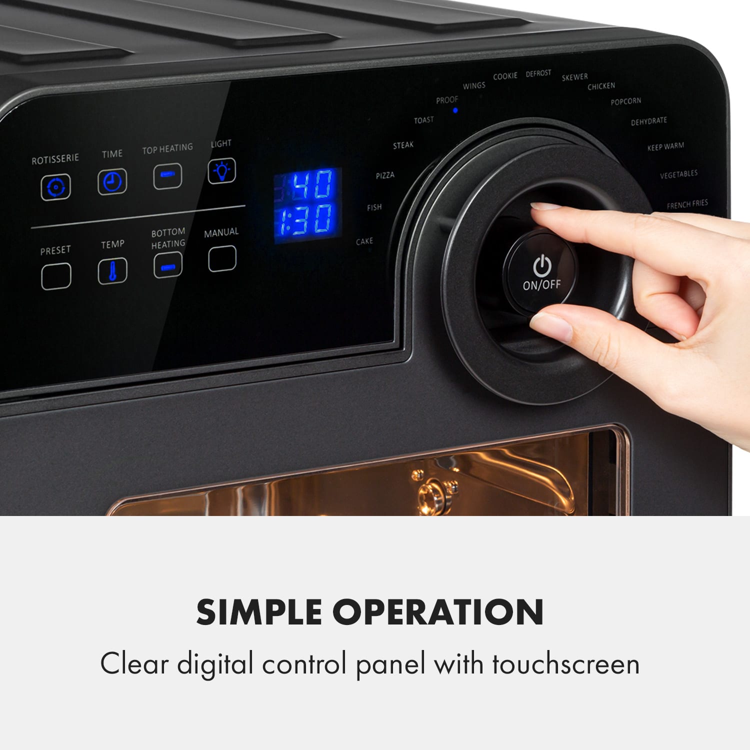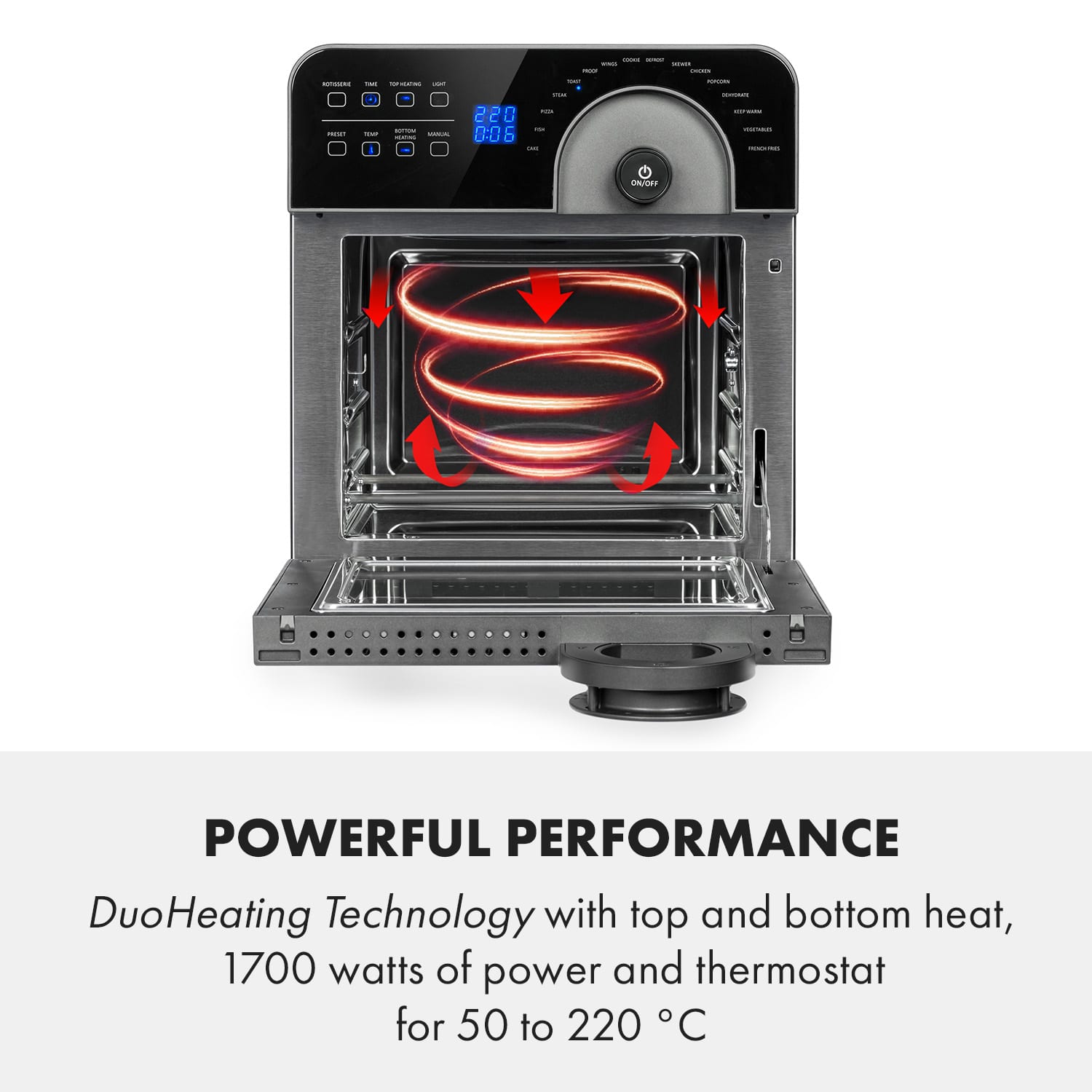 S teplovzdušnou fritézou Klarstein AeroVital Cube Chef pripravíte vďaka výkonnej technológii ohrevu a mnohým funkciám nespočetné množstvo pochúťok za veľmi krátky čas. Vďaka dvom výhrevným telesám (horné a dolné ohrevné teleso) môžete dokonale vyprážať, piecť, grilovať alebo opekať všetky možné potraviny. AeroVital Cube Chef sa tiež veľmi ľahko obsluhuje, má 16 prednastavených programov, ktoré si môžete vybrať priamo na digitálnom ovládacom paneli s dotykovým displejom. Individuálni používatelia môžu samozrejme nastaviť teplotu a čas prevádzky aj manuálne. Jeho veľkorysý objem 14 litrov a rozsiahla súprava príslušenstva splnia každé vaše prianie. Pripraviť rôzne pokrmy šetrne horúcim vzduchom a bez pridania oleja: s teplovzdušnou fritézou Klarstein AeroVital Cube Chef je to možné.