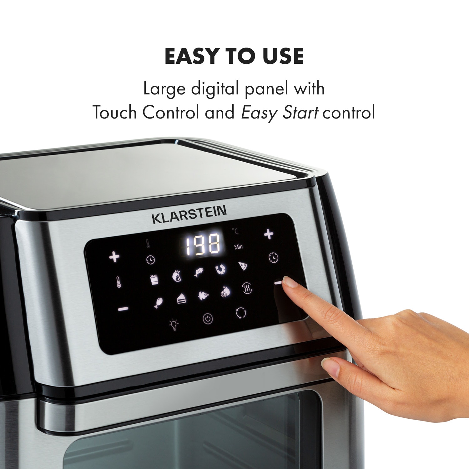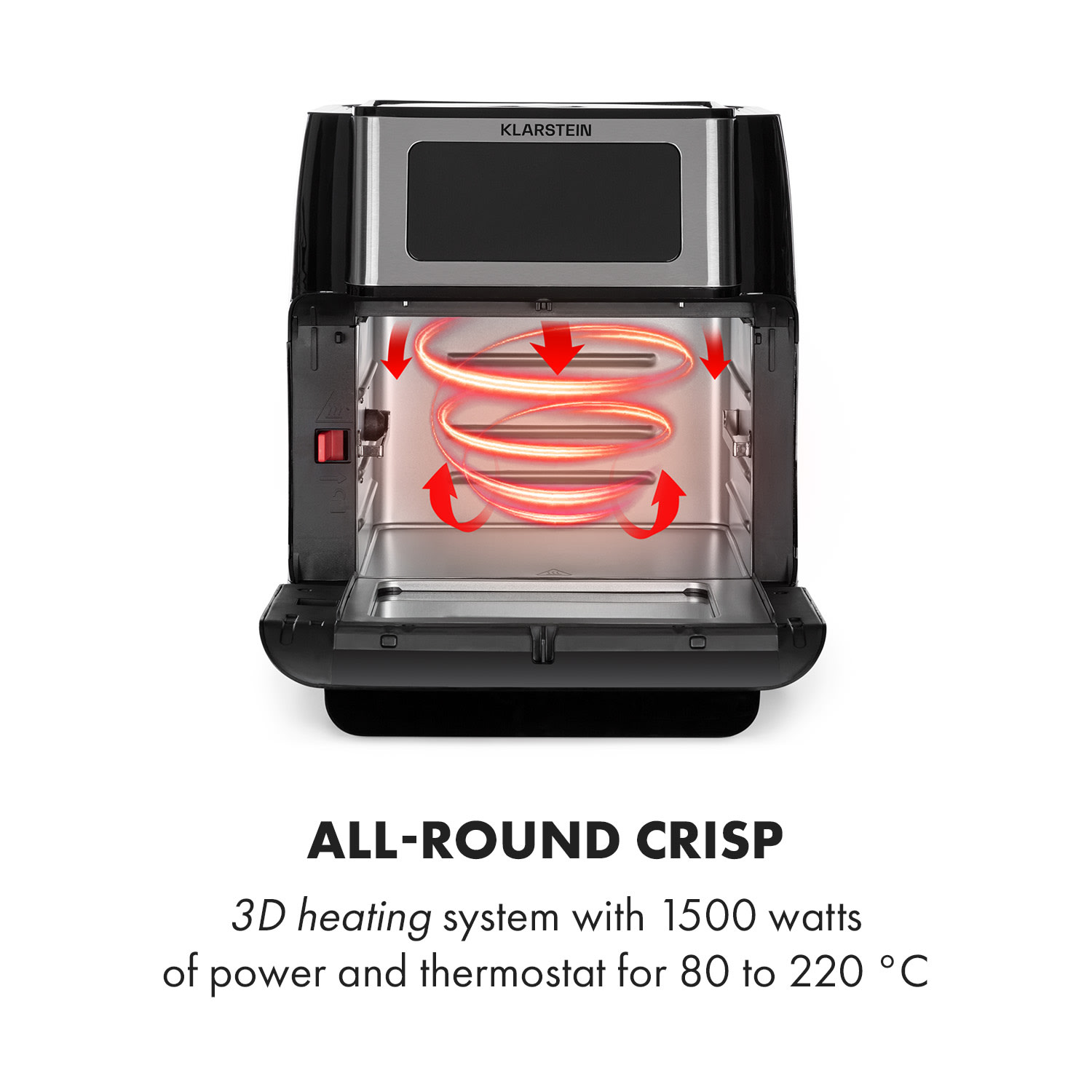 Fritovať zdravo a chutne nejde? Ale áno, s teplovzdušnou fritézou Klarstein AeroVital Fry bude nízkotučné varenie potravín rýchle a super jednoduché. Vynikajúcej chuti sa pritom nikto nemusí vzdať: samotné hranolčeky budú pekne chrumkavé.Tajomstvom fritézy Klarstein AeroVital Fry je 3D Heating System, ktorý frituje, pečie, griluje a praží s výkonom 1500 W a s horúcim vzduchom, ktorý cirkuluje. Vďaka vykurovaciemu telesu z ušľachtilej ocele na hornej strane a zadnému ventilátoru s vnútornou cirkuláciou vzduchu sa teplo rozdelí rýchlo a optimálne a jedlo sa jemne a rýchlo varí zo všetkých strán, rozmrazovanie nie je potrebné. Ovládanie je tiež veľmi jednoduché, pretože AeroVital Fry ponúka priamo 9 programov, ktoré si vyberiete pomocou dotykového panela. Teplota a doba varenia sú prednastavené pre požadované jedlo. Programy zahŕňajú hranolky, rybu, pizzu, sušenie a dehydratáciu, celé kurča (rotiséria), kurča, steaky a pečenie. Individualisti si samozrejme môžu nastaviť teplotu a čas aj manuálne. Teplota môže byť nastavená v 5° C krokoch od 80 do 200°C a čas varenia v 1-minútových krokoch až do 60 minút. Veľký vnútorný XL priestor s kapacitou 10 litrov splní takmer každé želanie a dokonca pojme celé grilované kurča. Teplovzdušná fritéza Klarstein AeroVital Fry je obzvlášť kompaktná vďaka svojmu dizajnu mini rúry a nezaberá viac miesta na príborníku ako bežná fritéza! Rozsiahla súprava príslušenstva je optimálne nastavená na všetky účely použitia: odkvapkávacia miska na zachytávanie masti, fritovací košík na veľké a malé vyprážané jedlá, ako sú kuracie krídla alebo krokety, a špíz na ražniči s prislúchajúcim zdvihákom na špízy sú rovnako súčasťou ako aj 360 ° 3D grilovací bubon, v ktorom budú hranolčeky vďaka otáčaniu rovnomerne chrumkavé zo všetkých strán. A najlepšie na tom je, že môžete fritovať, ako si želáte, bez toho aby ste si robili starosti s kalóriami, pretože všetko sa varí horúcim vzduchom úplne bez pridania oleja.Samozrejme, mysleli sme aj na bezpečnosť: počas prevádzky zostávajú konštrukcia a rukoväť príjemne studené vďaka Cool touch housing.Pre zdravé, rýchle a pohodlne pripravené jedlo: teplovzdušná fritéza AeroVital Fry od spoločnosti Klarstein.