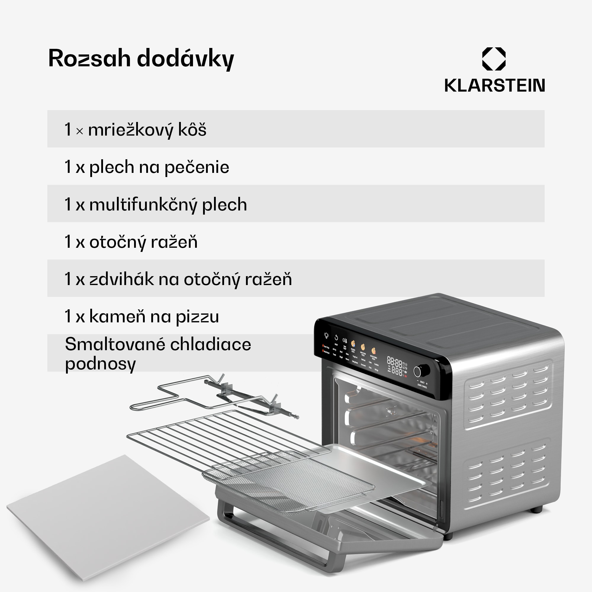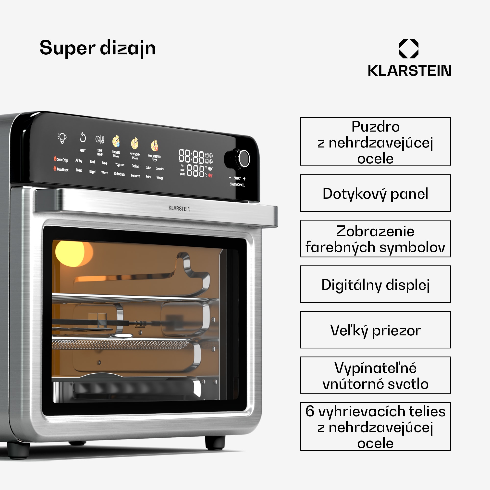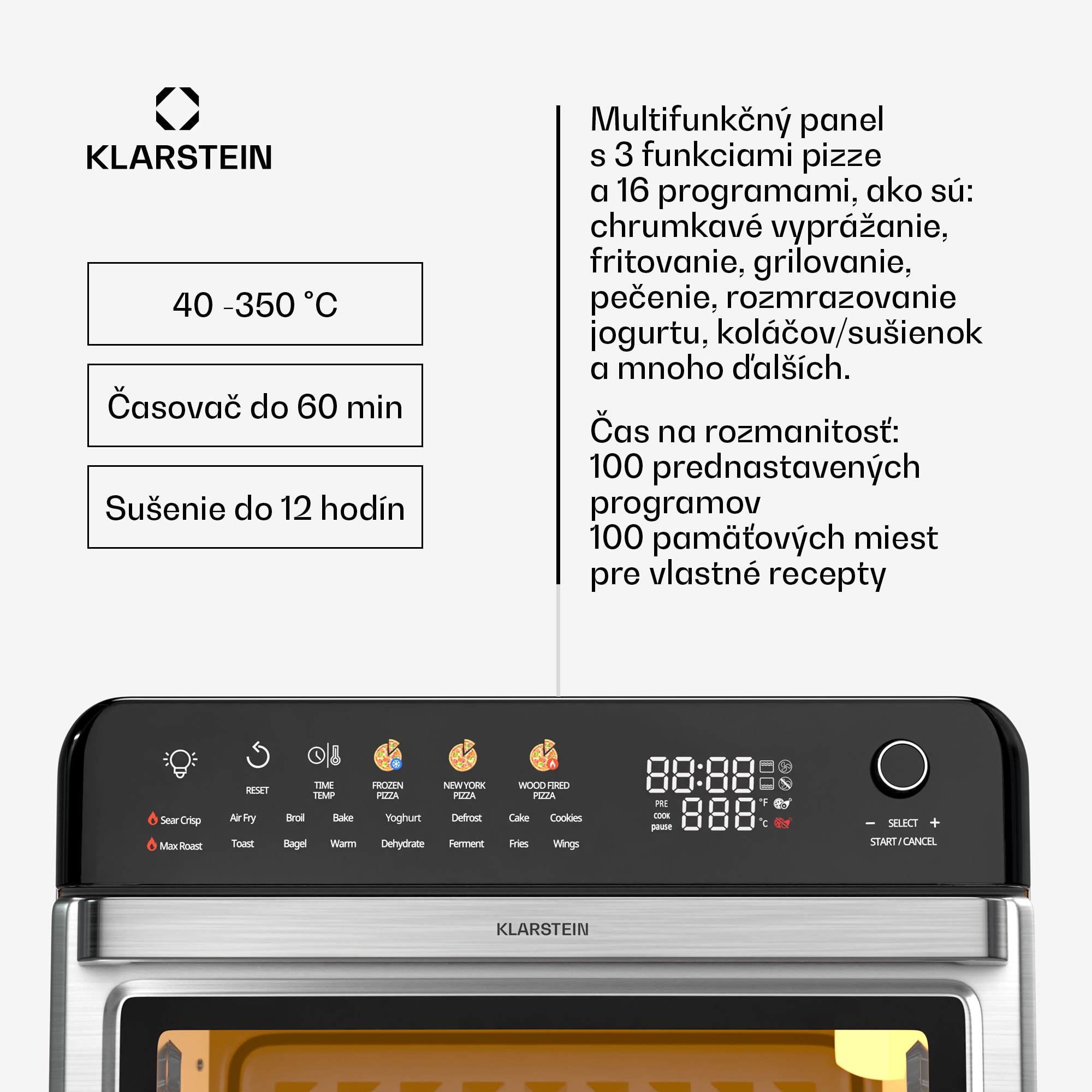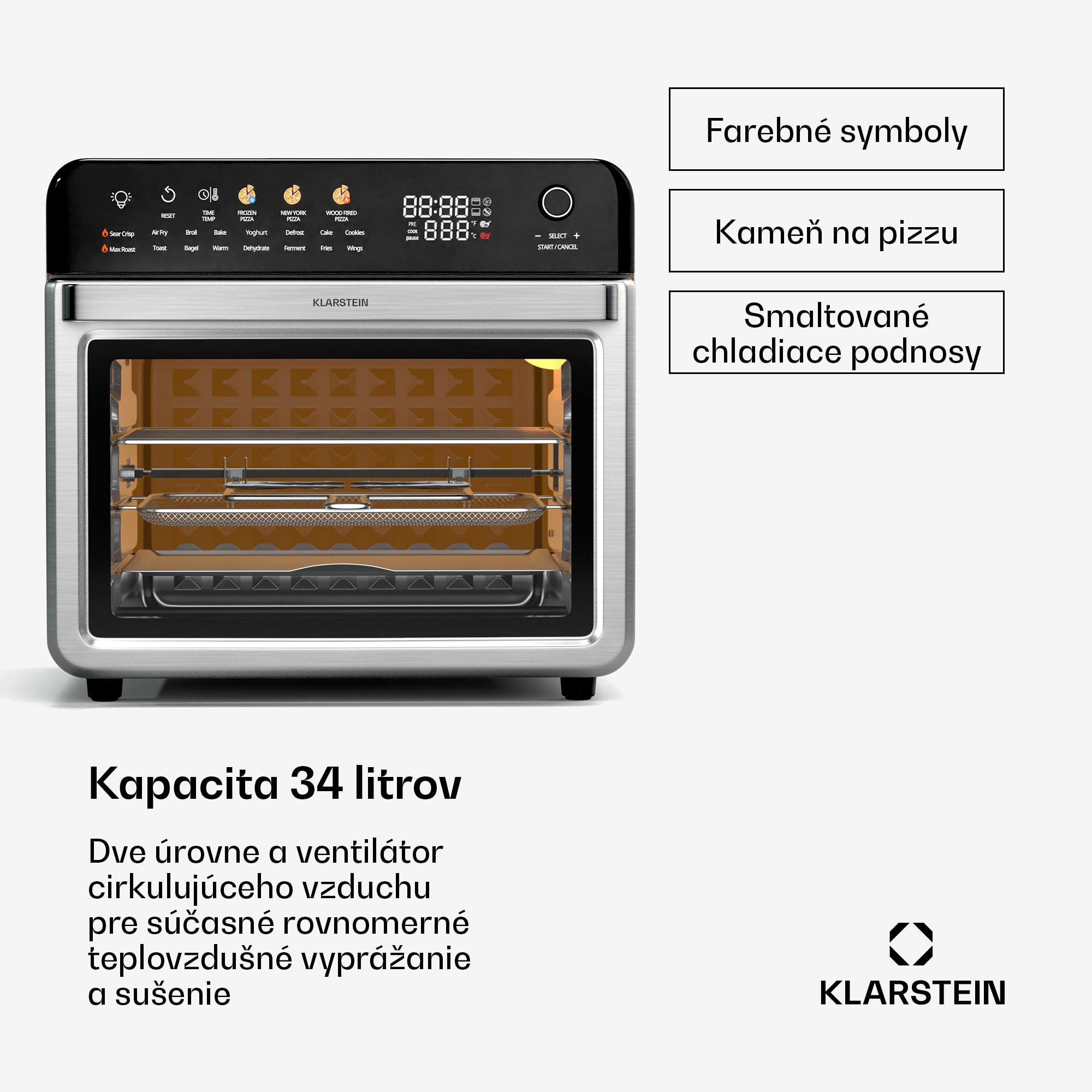Teplovzdušná fritéza Klarstein AirGlaze Digital je ideálnym kuchynským zariadením pre gurmánov, ktorí dbajú o svoje zdravie. Vďaka inovatívnej teplovzdušnej technológii si môžete vychutnať chrumkavé pokrmy s nízkym obsahom tuku, ktoré sú rovnako chutné ako vyprážané jedlá – ale bez zbytočných kalórií.Teplovzdušná fritéza AirGlaze Digital s veľkým objemom 34 litrov a 19 prednastavenými programami vrátane špeciálnych funkcií na prípravu pizze ponúka flexibilitu a pohodlie pri príprave každého jedla. Integrovaná funkcia rotisserie zabezpečuje rovnomerné prepečenie mäsa s menším množstvom tuku a moderný dizajn s farebným digitálnym displejom a dotykovým ovládaním umožňuje presnú reguláciu teploty. Šesť robustných výhrevných telies z nehrdzavejúcej ocele a dvojité sklo dvierok zaručujú odolnosť a dokonalé výsledky varenia. Okrem toho vám čistenie uľahčí odnímateľné príslušenstvo, ktoré možno umývať v umývačke riadu, ako napríklad kameň na pizzu a grilovacie rošty.Vyskúšajte všestrannosť a pohodlie teplovzdušnej fritézy Klarstein AirGlaze Digital a urobte revolúciu vo svojej kuchyni už teraz!