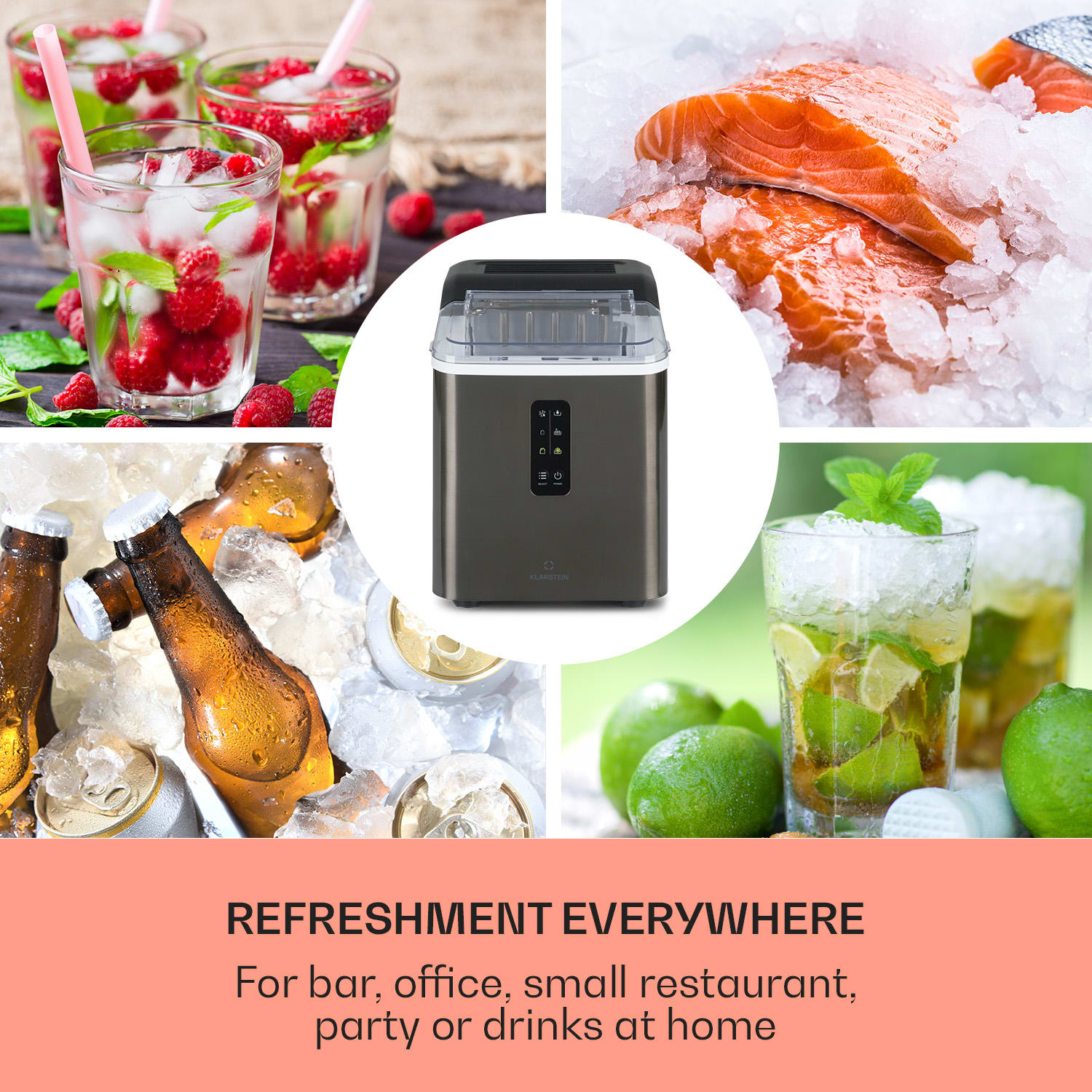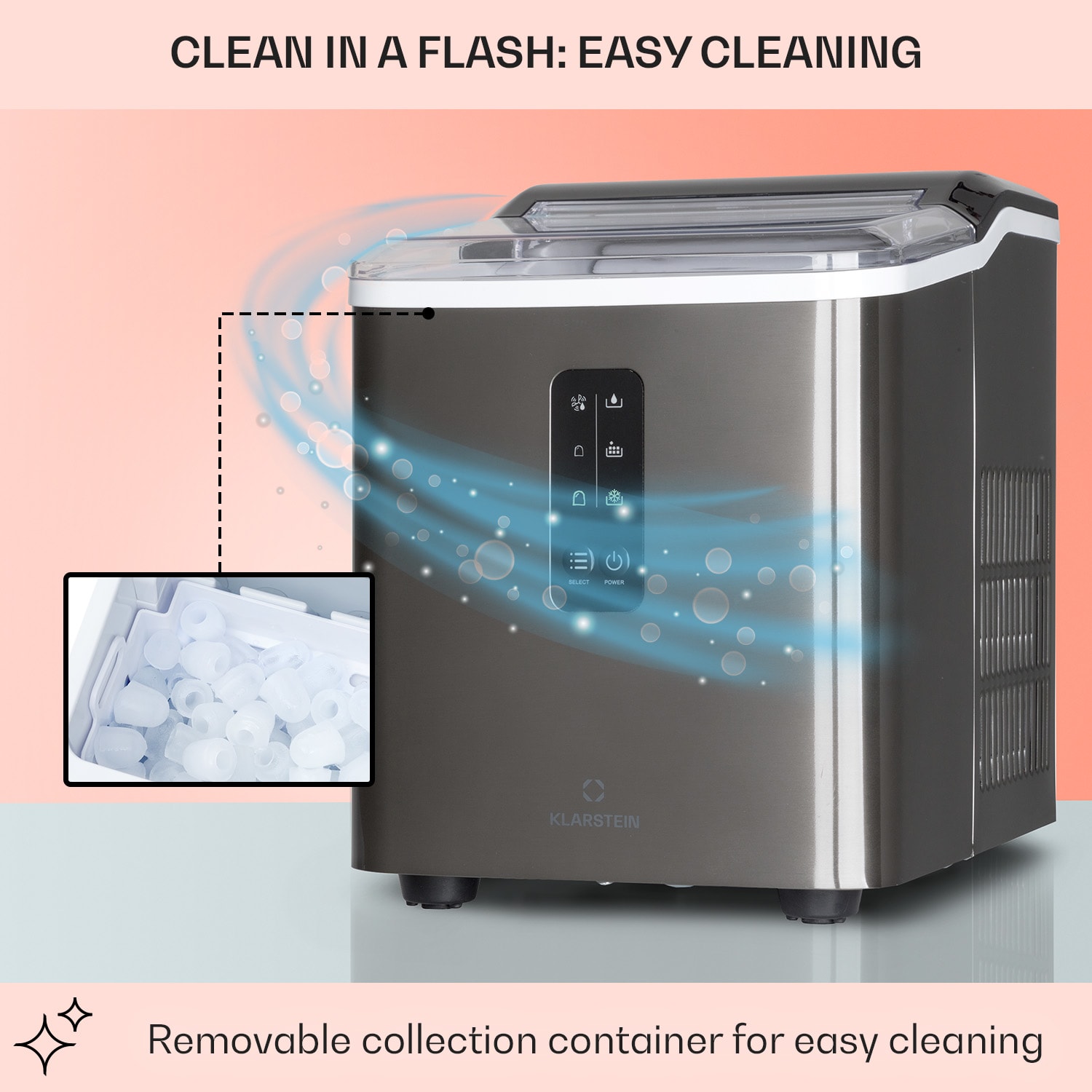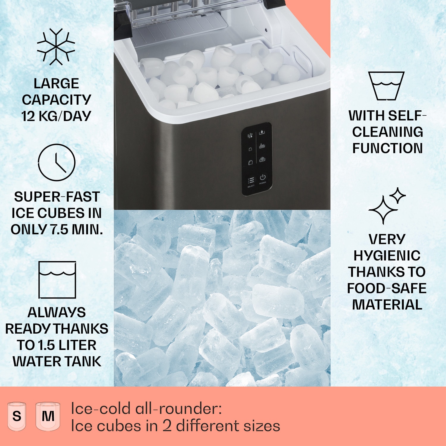 Studený ľad na horúce párty! S výrobníkom ľaduAlbaron Supreme od Klarstein budú vaše nápoje vždy osviežujúce a dobre vychladené. Za 24 hodín dokáže výrobník ľadu poskytnúť až 12 kg malých alebo veľkých ľadových kociek. Jednoducho naplňte 1,5 litra vody do nádržky, zapnite a už po 9 minútach – alebo 7,5 minútach pri malých kockách – padnú prvé kocky ľadu do vyberateľnej zbernej nádoby s objemom 600 g. Kontrolky na displeji uľahčujú obsluhu a informujú vás o potrebe doplniť vodu alebo vyprázdniť zbernú nádobu. Vďaka svojmu krytu z nehrdzavejúcej ocele je štýlovým pútačom pozornosti na každom pulte. Po skončení party bude výrobník ľadu Albaron Supreme od Klarstein opäť čistý bez akejkoľvek námahy vďaka samočistiacemu programu. Vnútro je samozrejme úplne bez BPA.