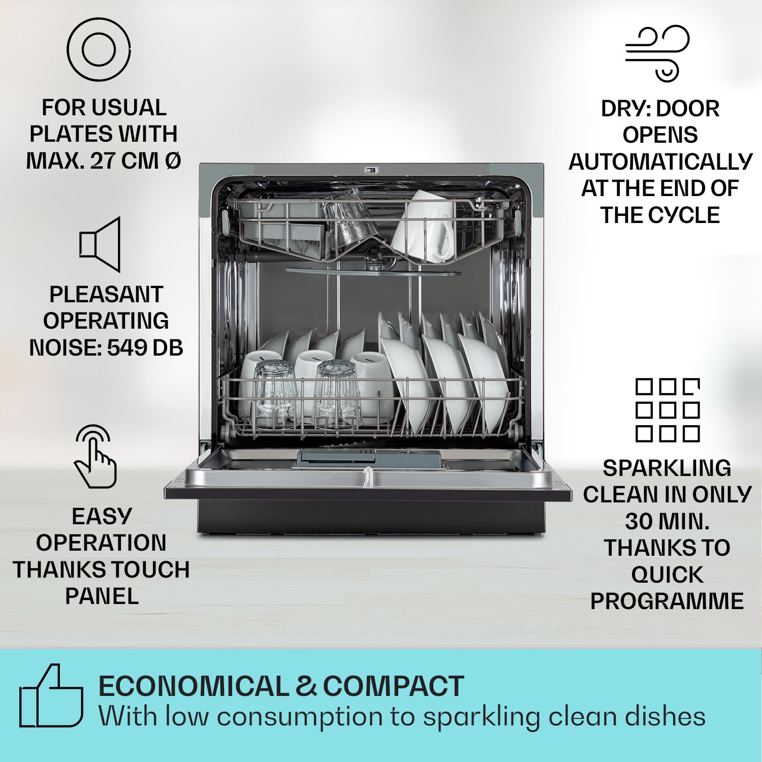 Číre sklo a riad: umývačka riadu Amazonia 8 od Klarstein spoľahlivo umýva aj napriek malému formátu Je ideálna do malých kuchýň, prázdninových bytov alebo víkendových domčekov Skoro neviditeľne, vďaka svojej veľkosti, preberá táto moderná mini umývačka umývanie, a pritom sa do nej vmestí až 8 súprav riadu. Pomocou 3 tlačidiel si môžete vybrať zo 6 programov – takto si Amazonia 8 poradí aj so silným znečistením, zatiaľ čo v kuchyni pôsobí ako skutočný pútač pohľadov.