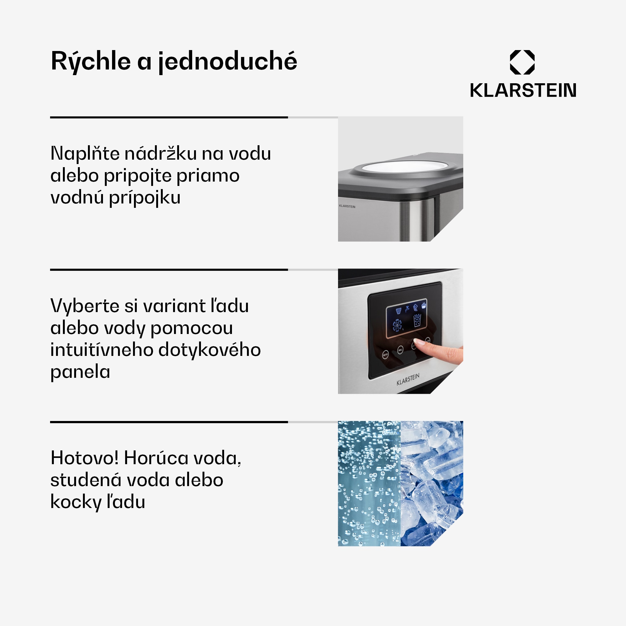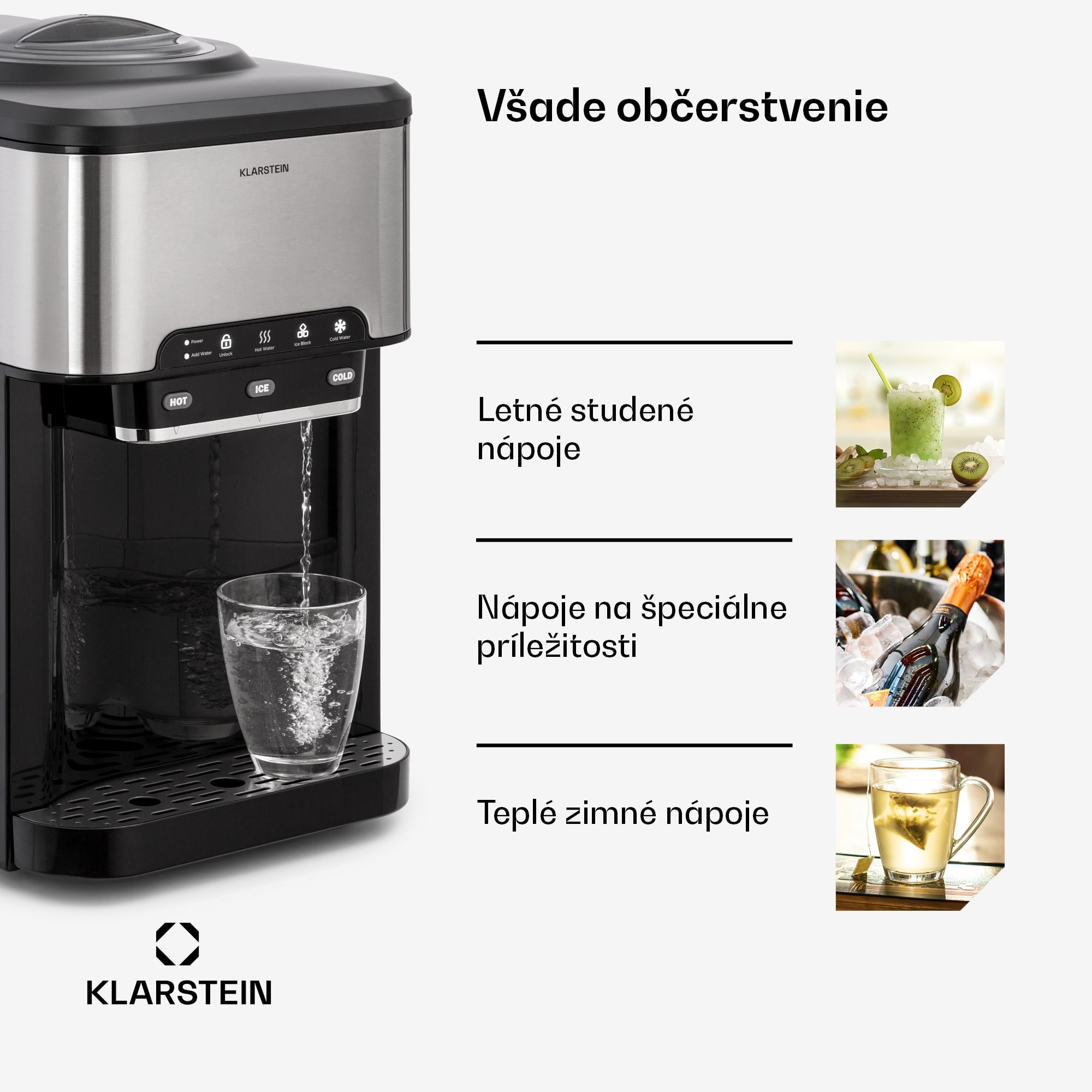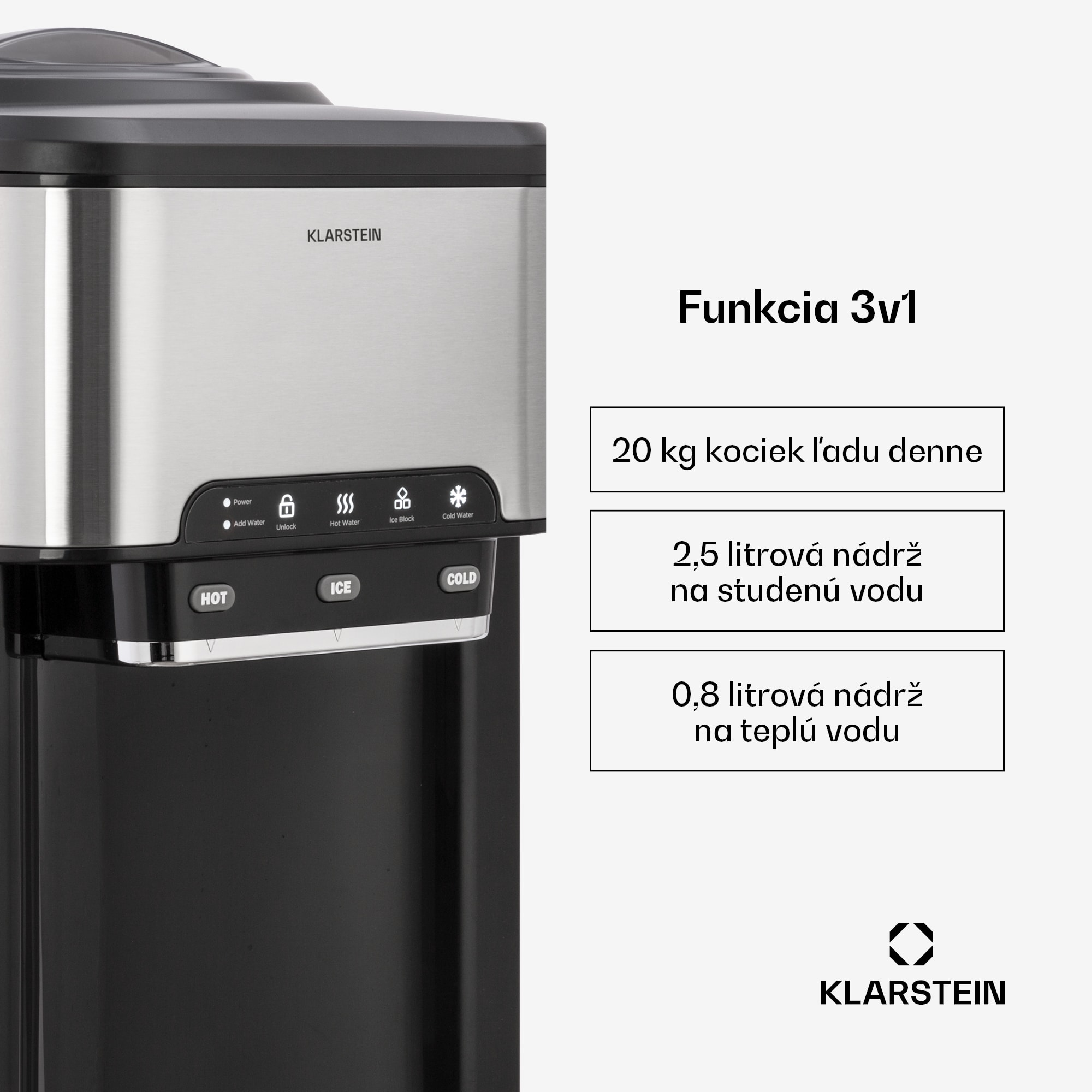 Vychutnajte si lahodné a ľadové nápoje po celý deň: Výrobník ľadu Klarstein Aqueous vyčaruje kocky ľadu za niekoľko sekúnd a zároveň vás môž každý deň zásobovať horúcimi nápojmi.Výkonný prístroj na výrobu kociek ľadu Aqueous vyrobí každý deň až 20 kg kociek ľadu. Vďaka tomu je ideálny na použitie doma, na večierkoch alebo záhradných párty. Obsluha výrobníka ľadu je veľmi jednoduchá a pohodlná pomocou jednoduchého ovládacieho panela s tlačidlami. Integrovaný displej vás okamžite informuje, keď je potrebné doplniť nádržku na vodu. Vďaka dvom veľkým nádržiam s 2,5 litrami studenej a 0,8 litrami teplej vody je dávkovač ľadu vždy pripravený – a navyše k nemu môžete pripojiť aj štandardnú nádrž na vodu. O čistotu a pohodlie sa stará aj vyberateľná odkvapkávacia miska s mriežkou z nehrdzavejúcej ocele, ktorej čistenie je rovnako jednoduché ako obsluha. Vďaka moderným prvkom z nehrdzavejúcej ocele a čistým líniám bude váš nový „Ice-Maker“ pútať pozornosť v každom bare alebo v kuchyni.Čas na mrazivú sviežosť: S výrobníkom ľadu Klarstein Aqueous si vychutnáte čerstvé nápoje vždy a všade!