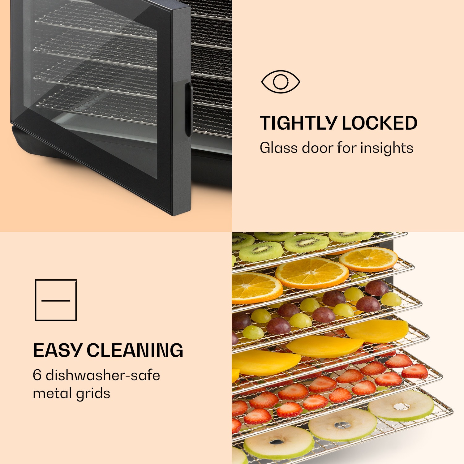 Výkonná sušička Klarstein Arizona Jerky suší ovocie, zeleninu, mäso a iné potraviny v rekordnom tempe a vyrába tak lahodné, trvanlivé pochúťky a suroviny. Či už sušené ovocie bohaté na vitamíny, ako napríklad jablkové a banánové lupienky, alebo zdravá zelenina ako sušené paradajky – Arizona Jerky má správnu teplotu pre každú pochúťku. S energeticky efektívnym vykurovacím výkonom 500 W a rovnomerným rozložením tepla sa sušička Arizona Jerky postará o to, že v potravinách neostane žiadna voda a že čas sušenia bude krátky. Pri flexibilnej príprave rôznych potravín je možné teplotu nastaviť plynule od 35 – 70 °C. Dôležité minerály a vitamíny ostanú zachované, chuť sa zintenzívni. Aj pre alergikov je sušička užitočnou kúpou. Táto sušička potravín je ideálna pre každého, kto chce zachovať kvalitu a chuť svojich surovín. Čistenie sušičky po ukončení procesu sušenia je celkom jednoduché. Mriežkové police a veko je možné bezproblémovo umyť alebo vyčistiť v umývačke riadu. Konštrukcia s ľahko čitateľným digitálnym dotykovým displejom.