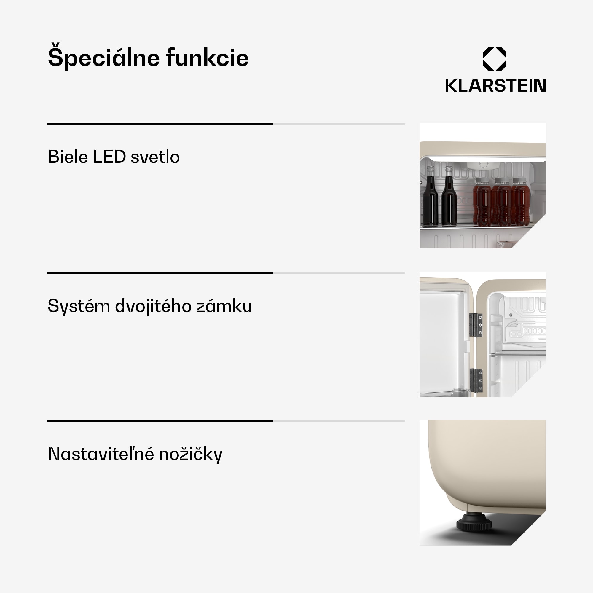 Mini chladnička Klarstein Audrey Evo kombinuje očarujúci retro dizajn s modernou technológiou. S objemom 43 litrov, nízkou hlučnosťou a flexibilnými možnosťami inštalácie je dokonalým doplnkom štýlových obytných a pracovných priestorov.Mini chladnička Audrey Evo od spoločnosti Klarstein ponúka napriek svojej kompaktnej veľkosti dostatok úložného priestoru. Odnímateľná polica a praktická priehradka vo dverách umožňujú prehľadné usporiadanie nápojov a občerstvenia. Vďaka nastaviteľným nožičkám a obojstranným dverám je chladnička mimoriadne prispôsobivá – ideálna do miestností s obmedzeným priestorom, ako sú hotelové izby, kancelárie alebo pivnice na párty.Vintage dizajn vnesie do každého prostredia nádych nostalgie. Chladnička pracuje s výkonným kompresorovým chladiacim systémom a vďaka mechanickému termostatu umožňuje presnú reguláciu teploty od 0 °C do 10 °C. S prevádzkovou hlučnosťou iba 40 dB je dostatočne tichá na to, aby nerušila ani pri odpočinku, ani pri práci.Kúpte si mini chladničku Klarstein Audrey Evo – kompaktná, tichá a štýlová do každého prostredia.