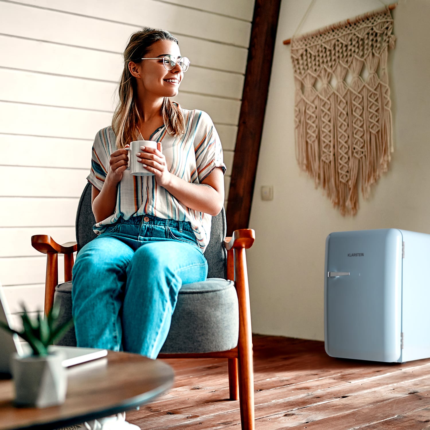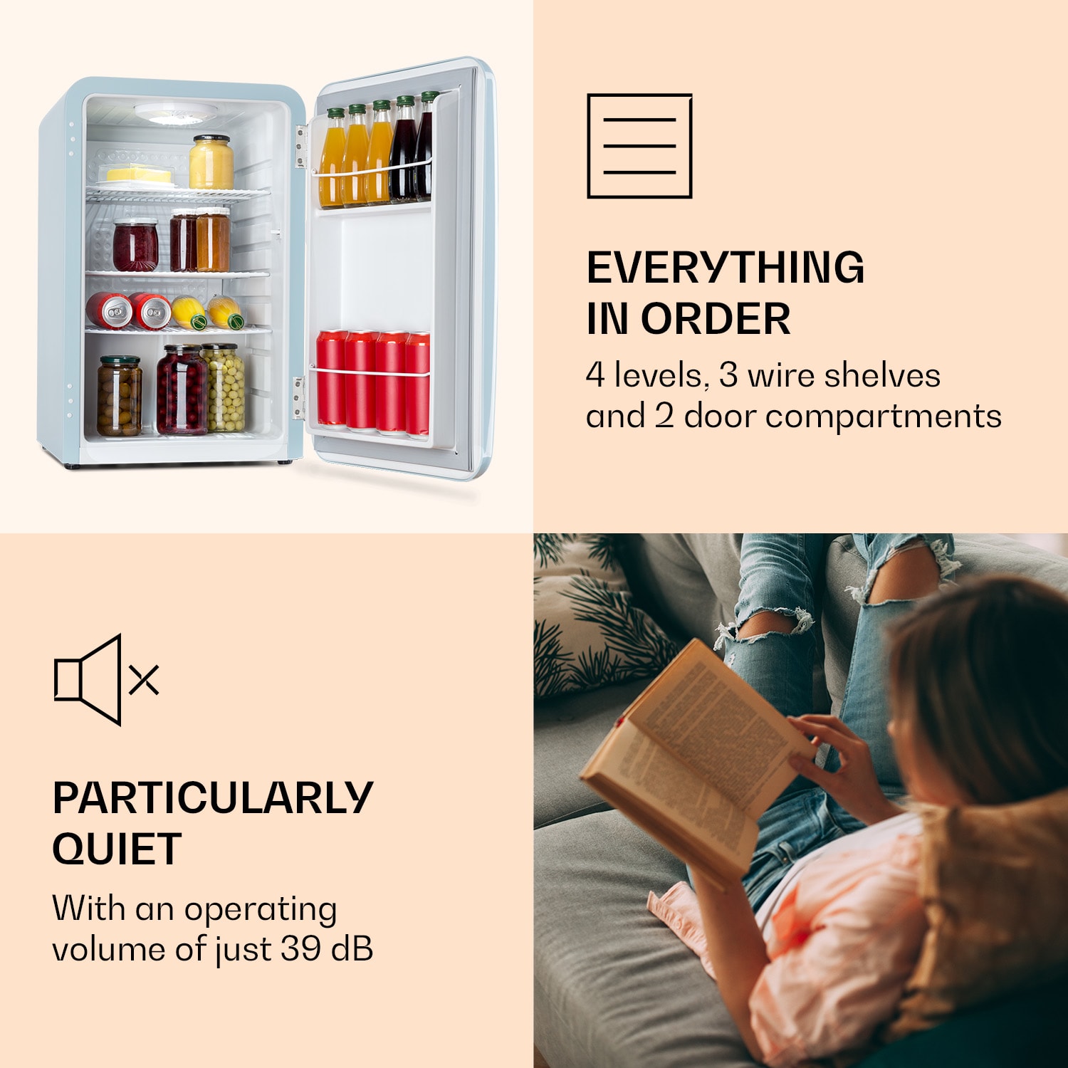 S farebnou a štýlovou chladničkou Audrey od Klarstein vytvoríte vo vašej domácnosti nový štýl. Či už v kuchyni, v kancelárii alebo v izbe pre hostí: priestrannú chladničku Audrey môžete vďaka jej kompaktným rozmerom použiť kdekoľvek. Táto mini chladnička s veľkou rukoväťou na prednej strane dotvára vzhľad 50. rokov. 70 litrov úložného priestoru ponúka dostatok miesta a poriadok zabezpečujú 4 poschodia s tromi nastaviteľnými mriežkovými policami, ako aj 2 priehradky vo dverách na fľaše, poháre a plechovky. Vďaka vnútornému osvetleniu máte vždy prehľad o svojich potravinách, nápojoch a občerstvení. Svieža a štýlovo verná: Chladnička Audrey od Klarstein je ako osviežujúca cesta späť v čase do 50. rokov.