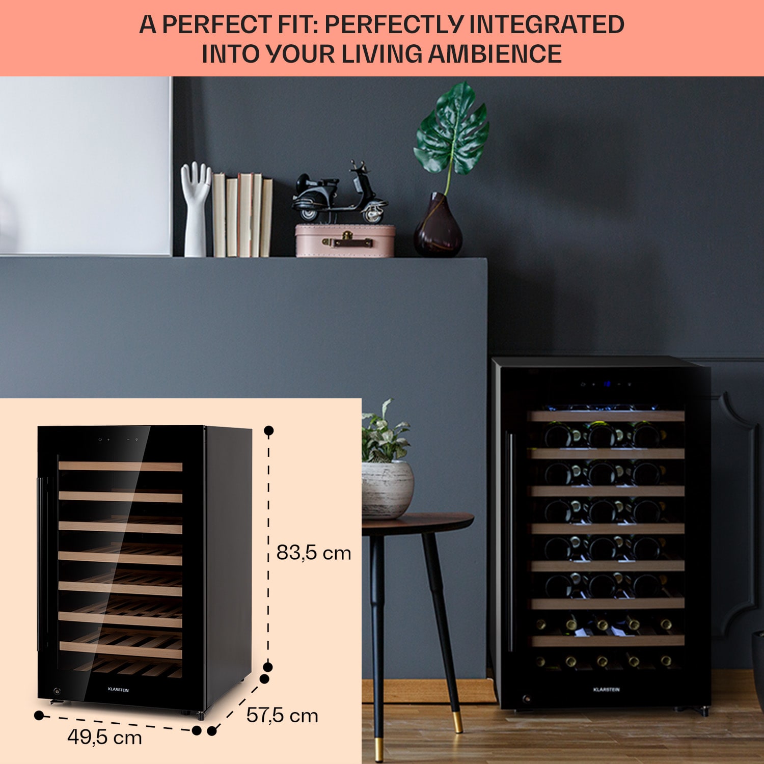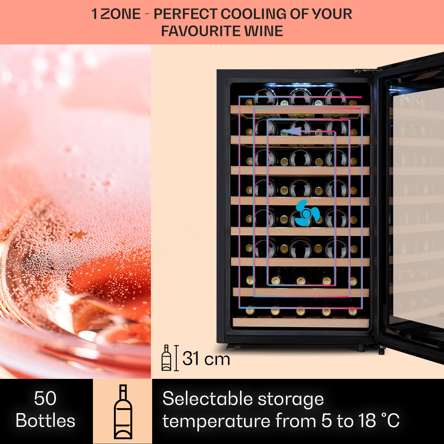 Z lásky k vínu: vinotéka Barossa 50 Uno od Klarstein zaisťuje ten najlepší pôžitok z vína tým, že fľašiam vína zabezpečí tú správnu teplotu na pitie. Sklenené predné dvierka sa postarajú o dômyselnú prezentáciu vínnych pokladov, zatiaľ čo zapínateľné vnútorné osvetlenie dodatočne dotvára atmosféru uložených fliaš. Vďaka tomu je vinotéka štýlovou ozdobou nielen v domácnosti, ale aj v baroch a reštauráciách.