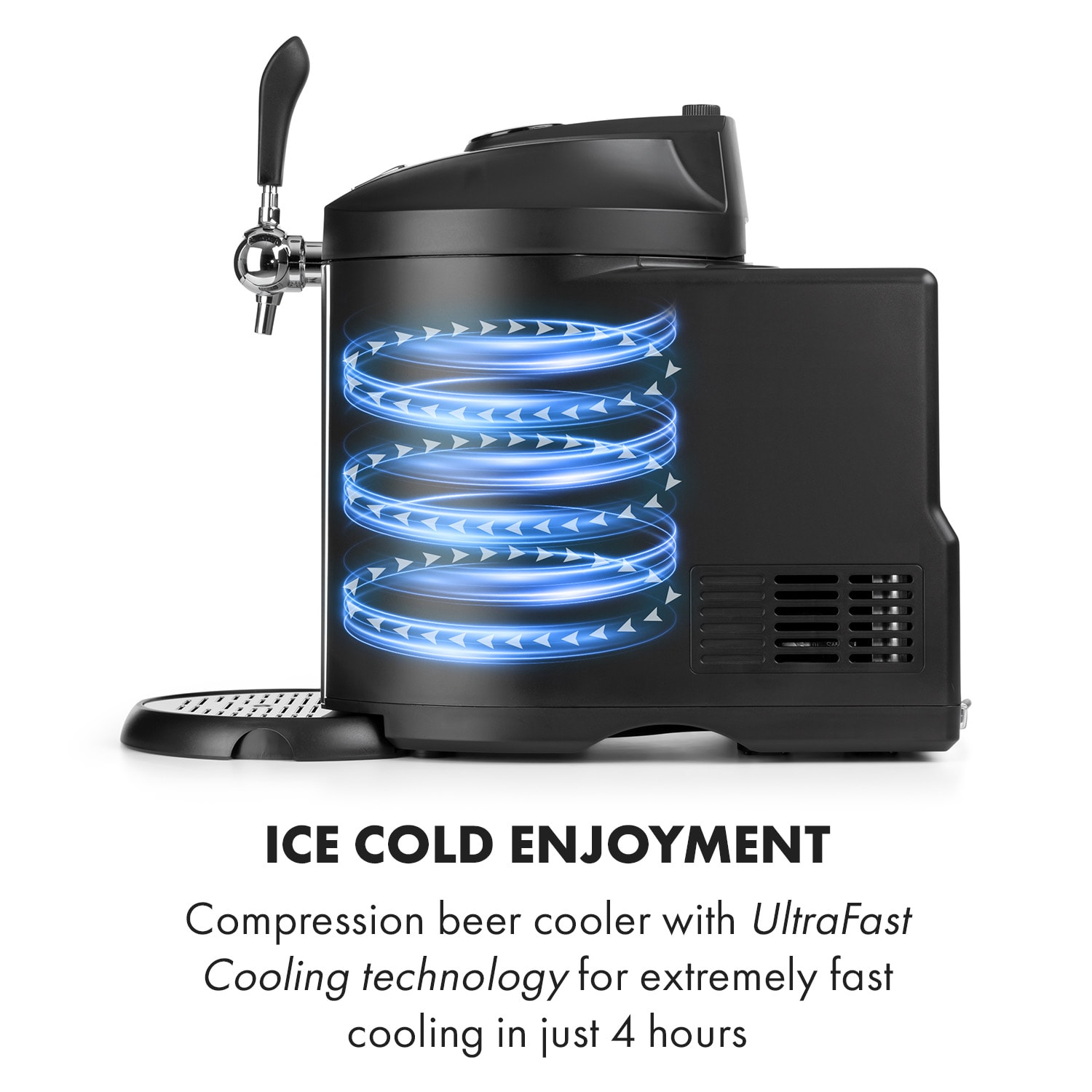 Pre extra studený a rýchly pôžitok z piva v domácom bare potrebujete len naše výčapné zariadenie Klarstein Beerkules – najsilnejší v chladení! S ním potečie jačmenné zlato dva krát tak čerstvo priamo do pohára.Čerstvo načapované, chutí najlepšie. Výčapné zariadenie Klarstein Beerkules sa postará o stály pôžitok z chmeľu zo všetkých 5l párty a súdkov so vstavaným výčapným systémom alebo bez meho. Jeho schopnosti rýchleho ochladzovania sú skutočne obrovské: vďaka jeho výkonnému chladiacemu kompresoru s technológiou UltraFast Cooling ochladí výčapné zariadenie súdky z pokojovej teploty len za 4 hodiny na studené teploty od 2 do 12°C – rýchlejší nie je nik! Požadovanú teplotu v nádrži je možné nastaviť pomocou 6 prednastavení alebo priamo v stupňoch na LED displeji. Vďaka tlakovému systému z CO2 kartušami si chmeľový džús so svojou krásnou penou nájde cestu do pivných pohárov, krčahov alebo džbánov. Tri plynové kartuše sú obsiahnuté v balení a starajú sa ihneď od zašiatku o správny tlak v obehu. S cieľom zabezpečiť ľahký prístup k súdkom s integrovaným výdajným systémom – pre ktorý nie je potrebný žiadny tlak CO2 – je zahrnutý zodpovedajúci pripojovací adaptér. Dômyselný indikátor hladiny poskytuje neustále informácie o zostávajúcich zásobách piva vo výčapnom zariadení, takže nikto nečakane nebude na suchu.Aj oko pije: s našim výčapným zariadením Klarstein Beerkules si neprídu na svoje len chuťové bunky. Barové zariadenie s výčapom je skutočne štýlové. Luxusné čierne plastové diely sa dopĺňajú s brúsenou ušľachtilou oceľou a starajú sa tak na baroch, servírovacích stoloch a v pivných stanoch o skutočnú pastvu pre oko. Ak sa pri čapovaní niečo pokazí, odkvapkávacia misa zachytí všetko rýchlo a spoľahlivo.Na Olymp pivného pôžitku, ľadové občerstvenie priamo zo súdku: výčapné zariadenie Klarstein Beerkules.