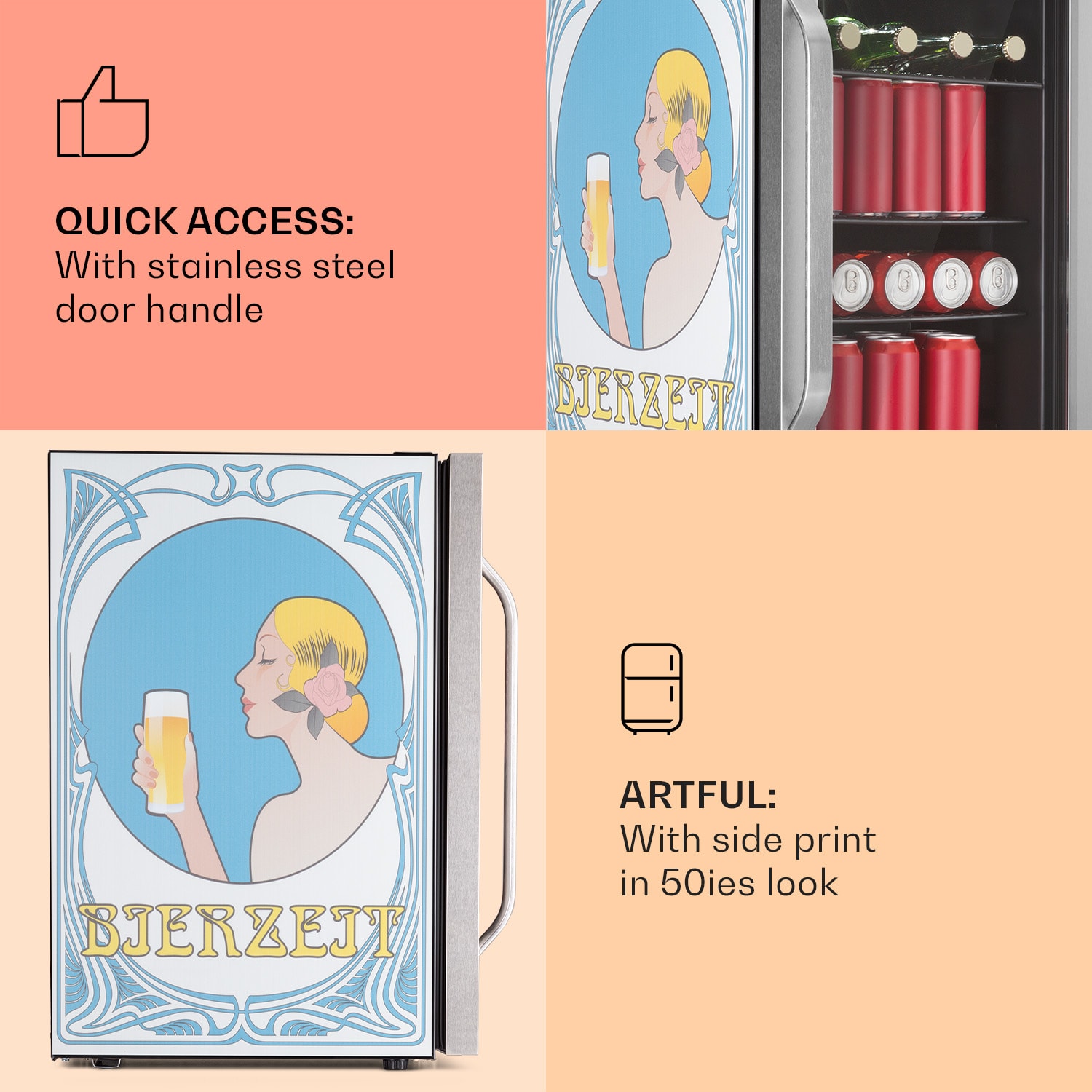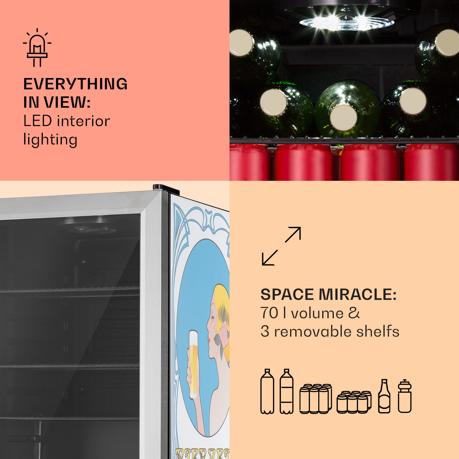 Klarstein Beersafe 70 Bierzeit Edition, chladnička, 70 litrov, 3 police, panoramatické sklenené dvere, nehrdzavejúca oceľ –Kúpiť