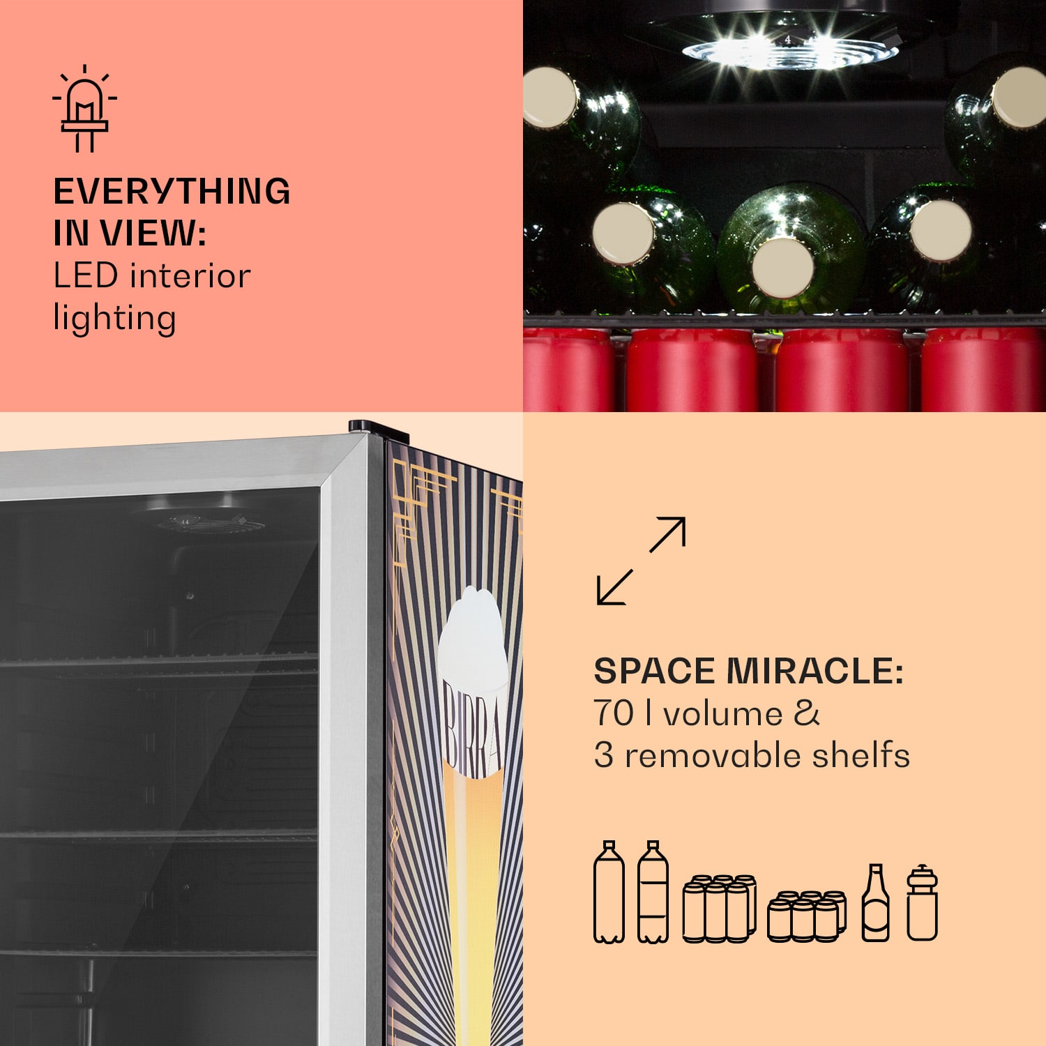 Klarstein Beersafe 70 Birra Edition, chladnička, 70 l, 3 police, panoramatické sklenené dvere, nehrdzavejúca oceľ –Kúpiť