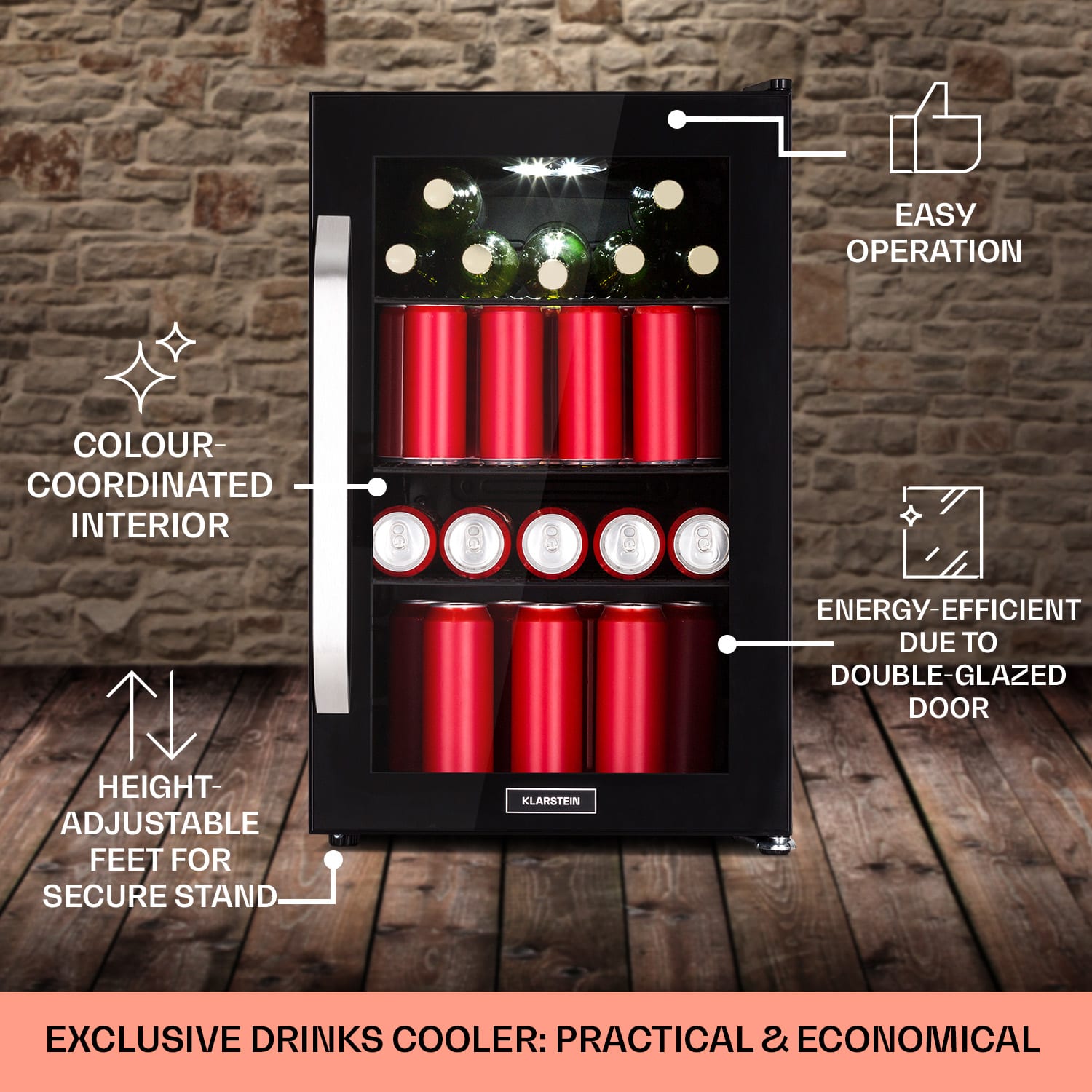 Dobre vychladené osvieženie je lepšie: Klarstein Beersafe 70 je kompaktná chladnička na nápoje s objemom 70 litrov. V trblietavej edícii Birra Milano osvieži svoje okolie štýlovou potlačou s motívom piva a dodá kuchyni alebo hobby miestnosti extra šmrnc.Tri pochrómované kovové police ponúkajú dostatok priestoru na potraviny a nápoje. Dvojitá izolácia panoramatických sklenených dvierok udržuje chlad vo vnútri a teplo vonku. Predná časť z brúsenej nehrdzavejúcej ocele vytvára dobrý kontrast k čiernemu interiéru. Ďalšou zaujímavosťou je vnútorné LED osvetlenie, ktoré dodáva Beersafe 70 ten správny šmrnc. Teplotu chladenia možno pohodlne nastaviť pomocou 5-stupňového otočného ovládača od 0 do 10°C. Chladnička Beersafe 70 od Klarstein schladí nápoje na osviežujúcu teplotu.