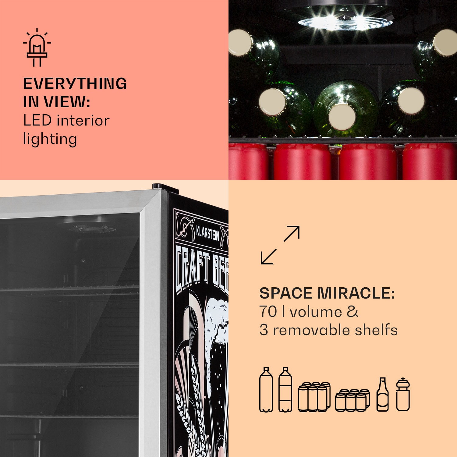 Dobre vychladené osvieženie chutí lepšie: Klarstein Beersafe 70 je kompaktná chladnička na nápoje s objemom 70 litrov. Vo sviežej Craft Beer Edition osvieži svoje okolie s potlačou Craft Beer Edition a dodá kuchyni alebo hobby miestnosti extra nádych.Tri pochrómované kovové police ponúkajú dostatok priestoru na potraviny a nápoje. Dvojitá izolácia panoramatických sklenených dvierok udržuje chlad vo vnútri a teplo vonku. Predná časť z brúsenej nehrdzavejúcej ocele vytvára dobrý kontrast k čiernemu interiéru. Ďalšou zaujímavosťou je vnútorné LED osvetlenie, ktoré dodáva Beersafe 70 ten správny šmrnc. Teplotu chladenia možno pohodlne nastaviť pomocou 5-stupňového otočného ovládača od 0 do 10°C. Chladnička Beersafe 70 od Klarstein vychladí nápoje na osviežujúcu teplotu.