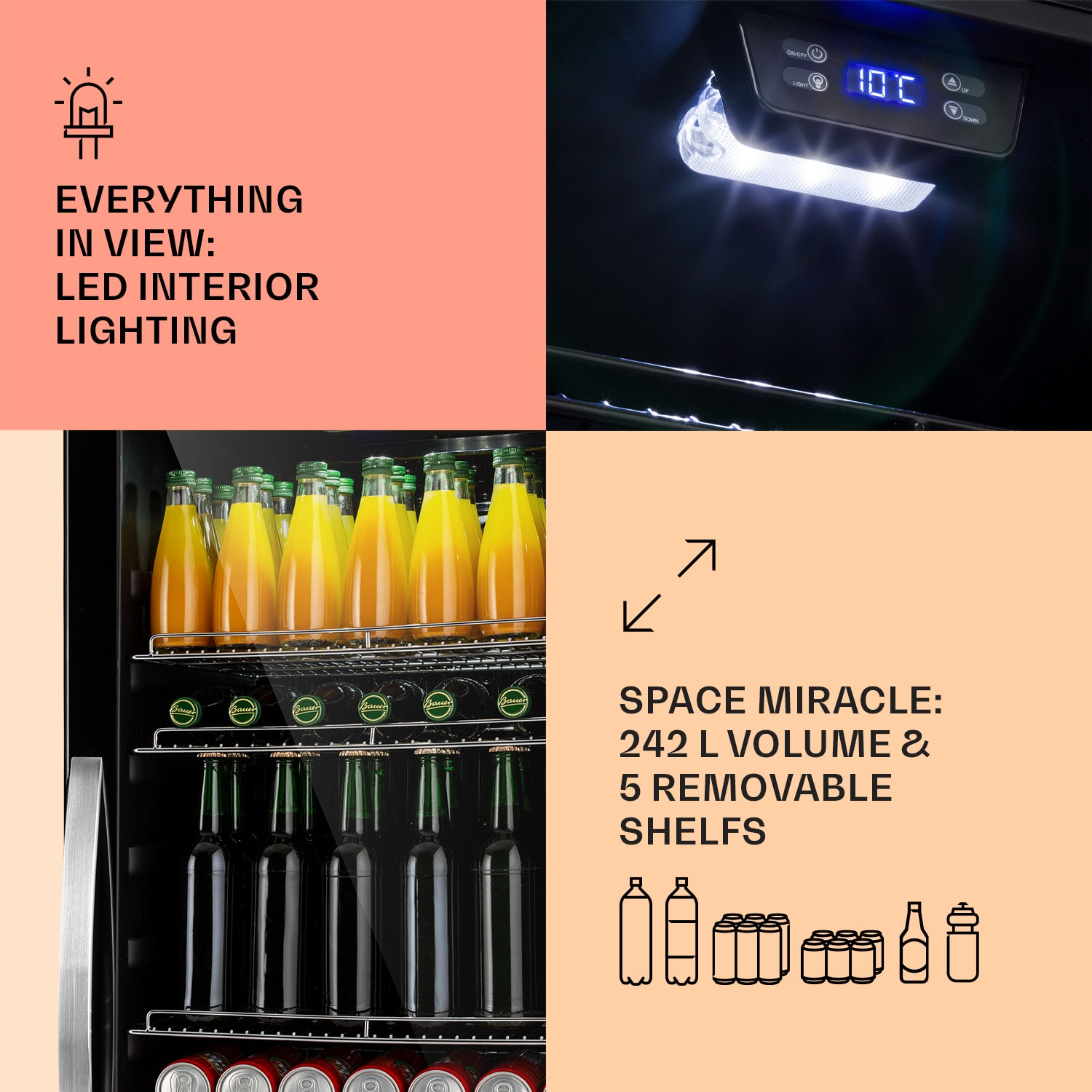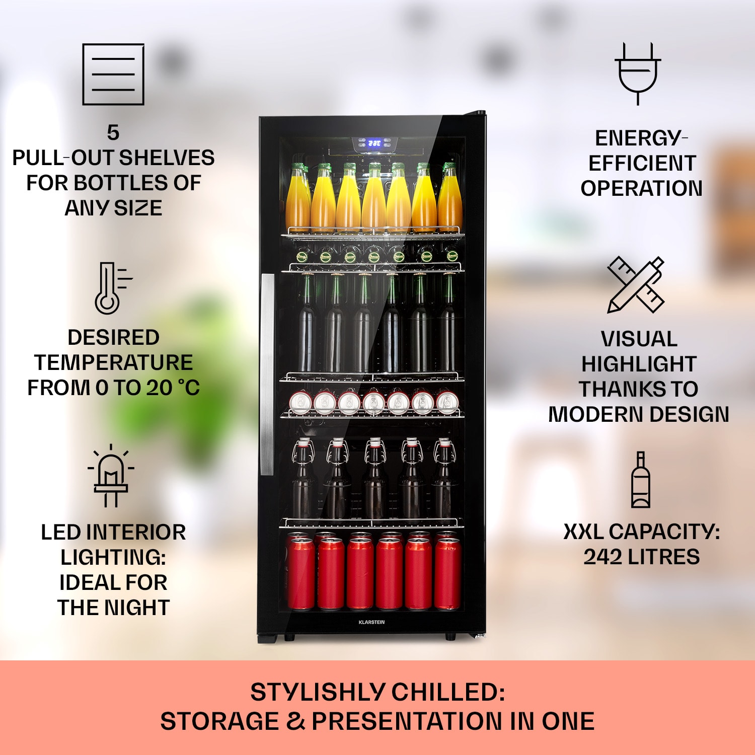 Dobre vychladené osvieženie chutí lepšie: Klarstein Beersafe 7XL je kompaktná chladnička na nápoje s objemom 242 litrov.Päť kovových mriežkových políc ponúka dostatok priestoru na potraviny a nápoje. Dvojitá izolácia panoramatických sklenených dvierok udržuje chlad bezpečne vo vnútri a teplo vonku. Predná časť z brúsenej nehrdzavejúcej ocele vytvára výrazný kontrast k čiernemu interiéru. Ďalšou zaujímavosťou je vnútorné LED osvetlenie, ktoré dodáva chladničke Beersafe 7XL ten správny šmrnc. Teplotu chladenia možno pohodlne nastaviť pomocou ovládacej plochy s digitálnym displejom. Chladnička Beersafe 7XL od Klarstein vychladí nápoje na osviežujúcu teplotu.