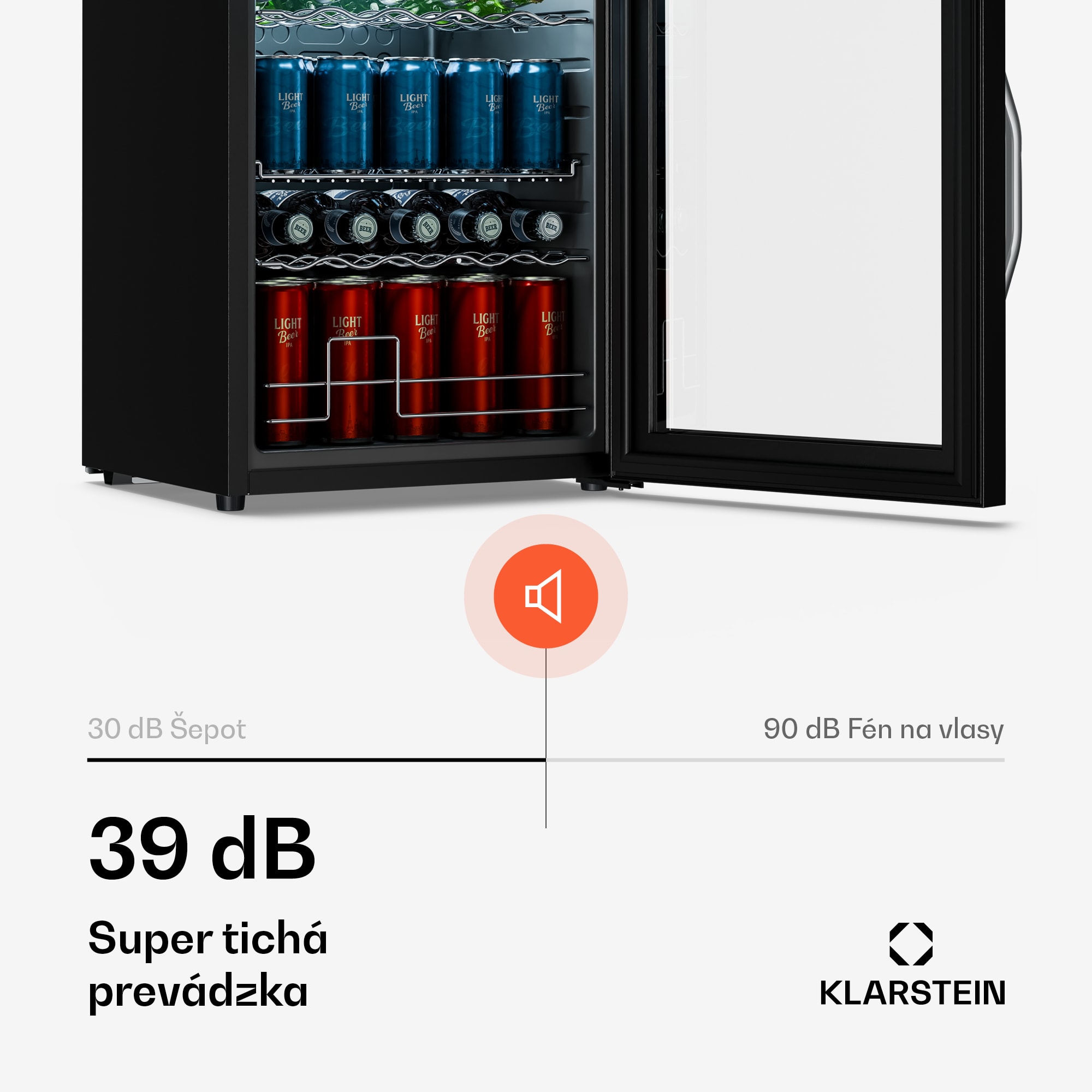 Chladnička na nápoje so zrkadlovými sklenenými dverami Klarstein Beersafe kombinuje minimalistický, no zároveň elegantný dizajn s vysokým výkonom. Vďaka svojmu atraktívnemu vzhľadu sa bez problémov hodí do moderných priestorov.Vďaka presnej regulácii teploty sú nápoje vždy skladované pri optimálne nastavenej teplote medzi 0 a 13 °C. Nastavenie je veľmi jednoduché pomocou 5-stupňového otočného ovládača.Štyri kvalitné a odnímateľné kovové police ponúkajú dostatok miesta na plechovky a fľaše, ktoré sú prezentované vďaka vnútornému LED osvetleniu a panoramatickým zrkadlovým skleneným dverám.