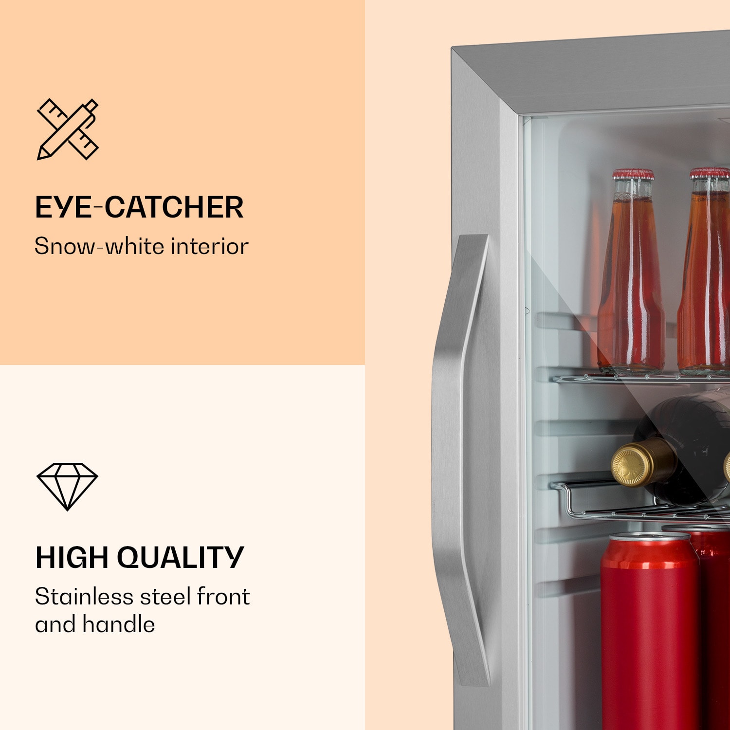 Dobre vychladené osvieženie chutí lepšie: Klarstein Beersafe M Crystal White je kompaktná chladnička na nápoje s objemom 33 litrov.Dve kovové mriežkované police ponúkajú dostatok priestoru na potraviny a nápoje. Dvojitá izolácia panoramatických sklenených dvierok udržuje chlad bezpečne vo vnútri a teplo vonku. Predná časť z brúsenej nehrdzavejúcej ocele ideálne ladí s bielym interiérom. Ďalšou zaujímavosťou je vnútorné LED osvetlenie, ktoré dodáva Beersafe M Crystal White ten správny šmrnc. Teplotu chladenia možno pohodlne nastaviť pomocou 5-stupňového otočného ovládača. Chladnička Beersafe M Crystal White od Klarstein vychladí nápoje na osviežujúcu teplotu.