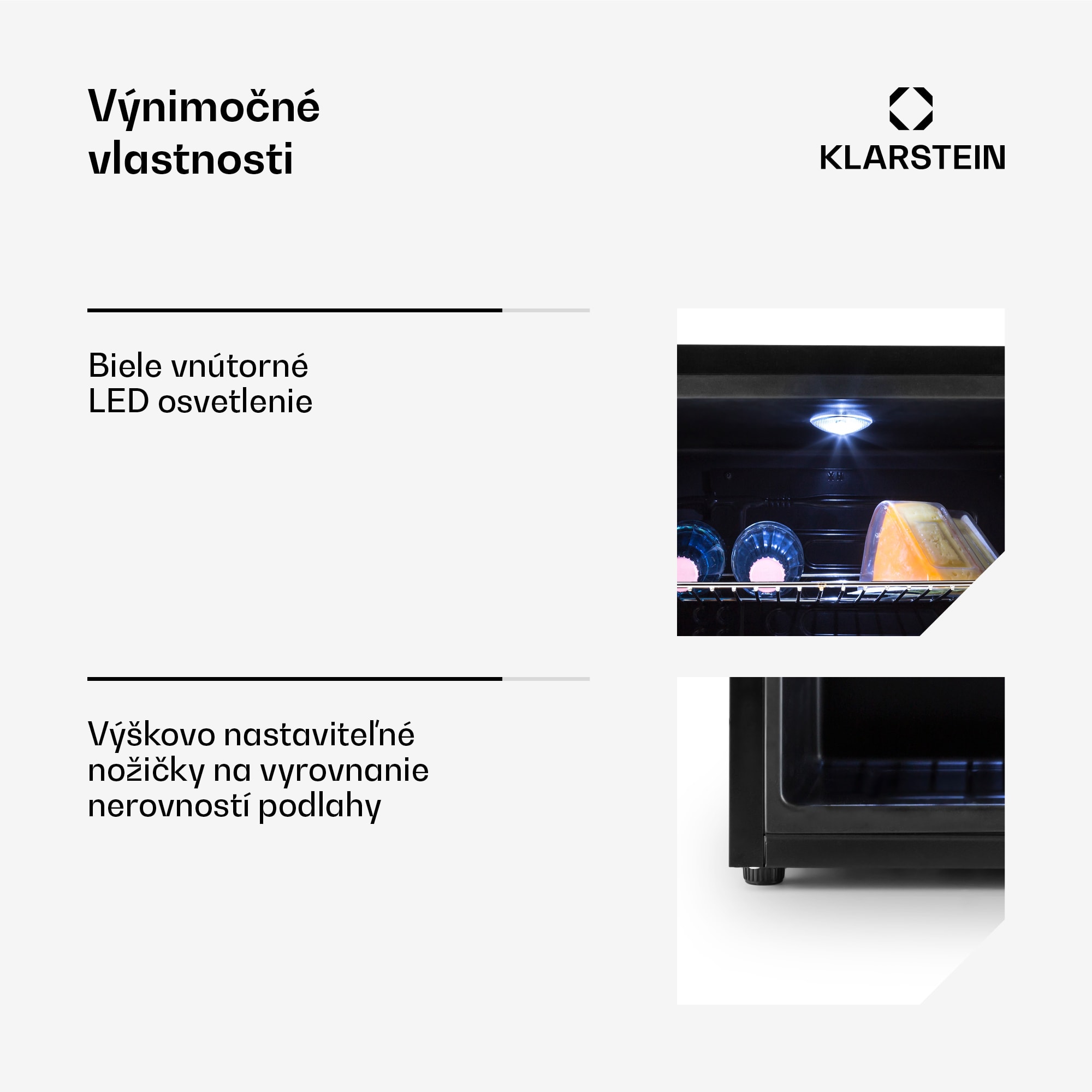 Klarstein Beersafe XL je kompaktná chladnička s objemom 60 litrov.Vybavená dvomi pochrómovanými, vysúvateľnými policami z kovu ponúka chladnička dostatok miesta na fľaše a plechovky.Klarstein Beersafe poskytuje vychladenie občerstvenia a nápojov, pričom nevyžaduje toľko miesta na vystavenie ako obyčajná chladnička. Pri potrebe môžete túto chladničku – vďaka jej nízkej hmotnosti – jednoducho premiestniť na iné miesto, napr. na bar, do záhrady a všade tam, kde je dopyt po chladených nápojoch a malom občerstvení. Táto chladnička na nápoje je ideálna pre každú príležitosť.Kompaktná konštrukcia zapadne do rozličných obyvacích miestností a do každého štýlu zariadenia. Nezáleží na tom, či do kuchyne alebo obývačky – chladnička Klarstein Beersafe XL ponúka vysoké prezentačné schopnosti na základe zapínateľného vnútorného osvetlenia.Chladiaci výkon chladničky Klarstein Beersafe XL je doplnený energetickou triedou účinnosti D a mimoriadne nízkou prevádzkovou hlučnosťou, čo šetrí nielen peňaženku, ale aj nervy.