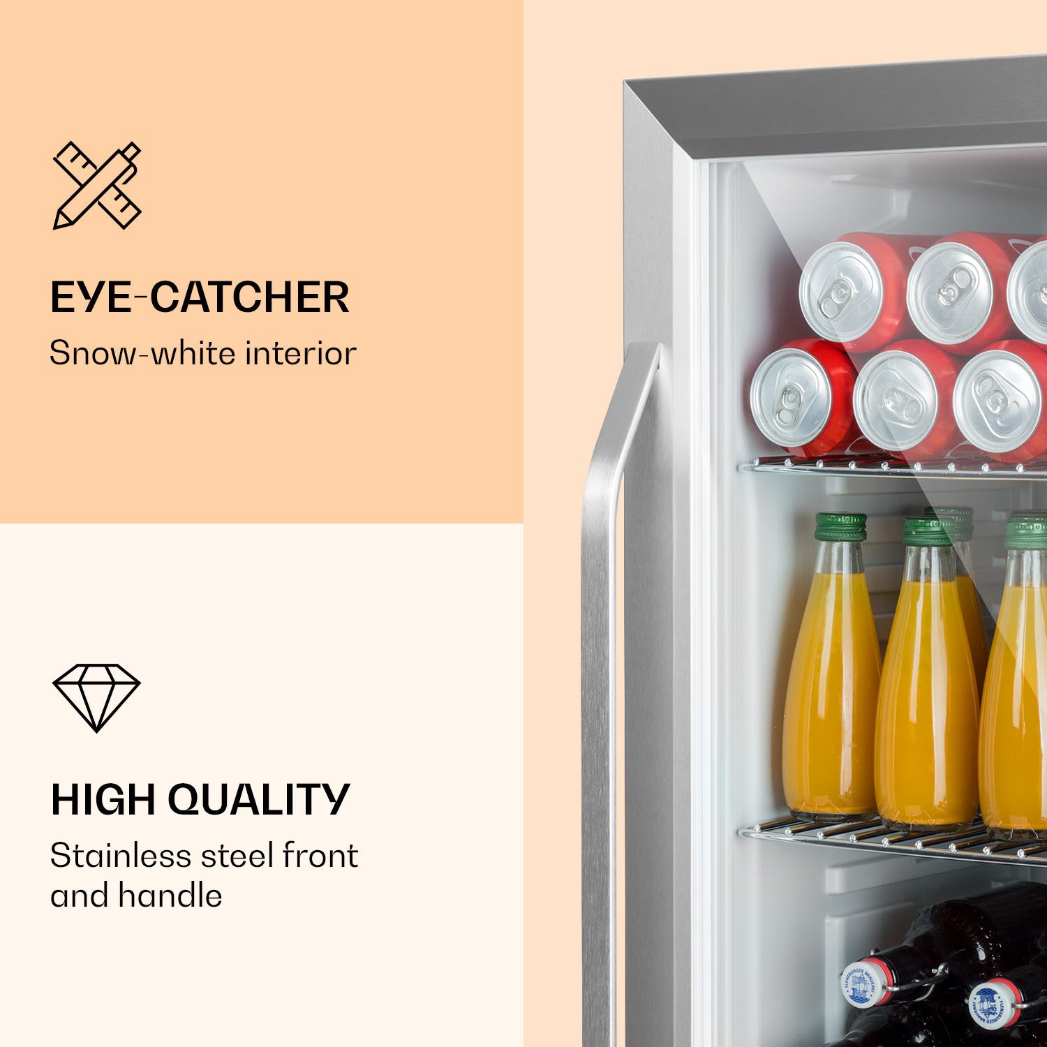 Dobre vychladené osvieženie chutí lepšie: Klarstein Beersafe XXL Quartz je kompaktná chladnička na nápoje s objemom 80 litrov.Tri pochrómované kovové police ponúkajú dostatok priestoru na potraviny a nápoje. Dvojitá izolácia panoramatických sklenených dvierok udržuje chlad bezpečne vo vnútri a teplo vonku. Sklenené dvere s bielym rámom nádherne ladia s bielym interiérom. Ďalšou zaujímavosťou je vnútorné LED osvetlenie, ktoré dodáva Beersafe XXL Quartz ten správny šmrnc. Teplotu chladenia možno pohodlne nastaviť pomocou 5-stupňového otočného ovládača. Chladnička Beersafe XXL Quartz od Klarstein chladí nápoje na osviežujúcu teplotu.