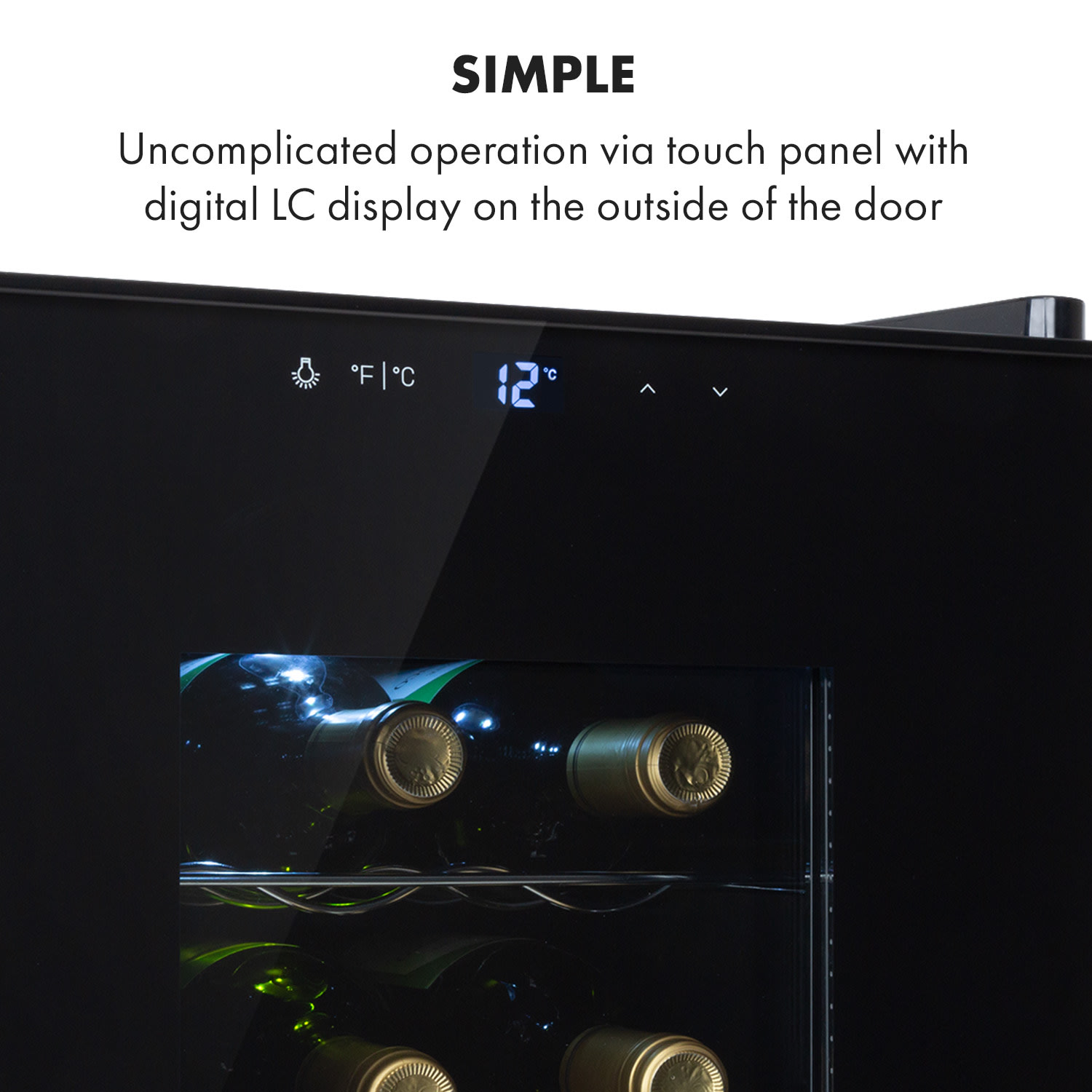 Vynikajúce vína chutia mimoriadne dobre zo štýlovej vinotéky Klarstein Bellevin 18 Uno, pretože sú vždy vychladené na tú správnu teplotu pre okamžitý pôžitok.Či už jemné červené víno, šumivé biele alebo svieže ružové: do štýlovej vinotéky Bellevin 18 Uno sa zmestí v jednej 52 litrovej chladiacej zóne až do 18 fliaš vína. Všetky fľaše sú prehľadne uložené na šiestich skladovacích úrovniach s piatimi výsuvnými kovovými policami. Pomocou dotykového ovládacieho panela a LCD displeja vo vonkajšej strane dvier sa dá teplota nastaviť individuálne a pohodlne na hodnotu medzi 11 a 18 °C. Zapínateľné jasné biele LED svetlo vo vnútri poskytuje potrebný prehľad a dokonalo uvádza obsah vinotéky na scénu.Dvere s dvojitým sklom nielen dobre vyzerajú, ale tiež poskytujú kedykoľvek rýchly prehľad o obsahu chladničky na nápoje Klarstein Bellevin 18 Uno. Interiér má štýlovú čiernu farbu, čo umocňuje luxusný efekt zariadenia. Kombinácia skla, ušľachtilej ocele a svetla robí z vinotéky dekoratívny doplnok každej miestnosti. Vďaka svojim kompaktným rozmerom je okrem toho mini vinotéka Bellevin 18 Uno ideálna aj do malých priestorov. Vďaka sotva počuteľnému prevádzkovému hluku s hodnotou iba 26 dB sa dá bez problémov umiestniť aj v spálňach alebo hosťovských izbách.Praktická, s krásnym tvarom a výrazná: vinotéka Bellevin 18 Uno od spoločnosti Klarstein.