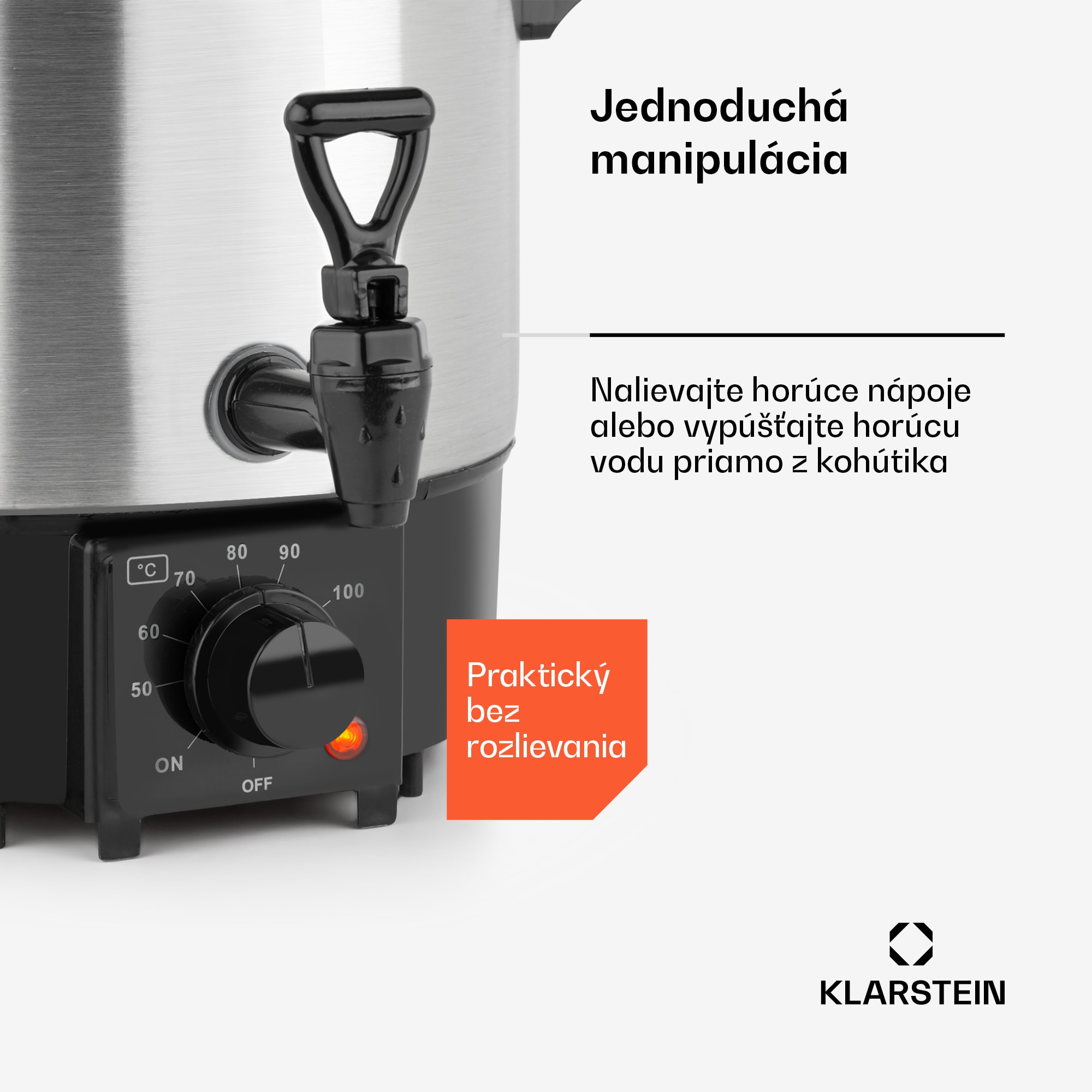 Zavárací hrniec Klarstein Biggie Eco je náš odborník na zaváranie, zohrievanie a udržiavanie teploty.Dnes sa bude zavárať: so zaváracím hrncom Klarstein Biggie Eco prichádza do jedálnička zmena s dlhodobým efektom. Zavárací hrniec s objemom 9 litrov poskytuje dostatok priestoru na to, aby zmenil obsah až 3 zaváracích pohárov s objemom 1 liter na trvanlivé konzervované potraviny. Či je to ovocie, zelenina alebo mäso: v zariadení Biggie Eco sa stanú trvanlivými.Ovládanie je extrémne jednoduché: naplnené poháre umiestnite do zaváracieho hrnca, hrniec naplňte vodou, potom zvoľte potrebnú teplotu zavárania od 30 do 100 °C a zaváranie sa môže začať. Hrniec si sám udržuje zvolenú teplotu, ochrana pred prehriatím sa postará o bezpečnosť pri zaváraní a vypne hrniec, ak je príliš horúci alebo by šiel na sucho.Možnosti zariadenia Biggie Eco však ešte nie sú vyčerpané. Vďaka svojmu chuťovo neutrálnemu a hygienickému materiálu, ktorým je ušľachtilá oceľ, a tiež vďaka výčapnému kohútiku a integrovanej funkcii udržiavania teploty je zariadenie ideálne aj ako dávkovač horúcich nápojov na horúci čaj, polievky alebo varené víno, ktoré obohatia večierky, bufety alebo konferenčné miestnosti.Doplnenie každej domácnosti: zavárací hrniec & dávkovač nápojov Biggie Eco od spoločnosti Klarstein.