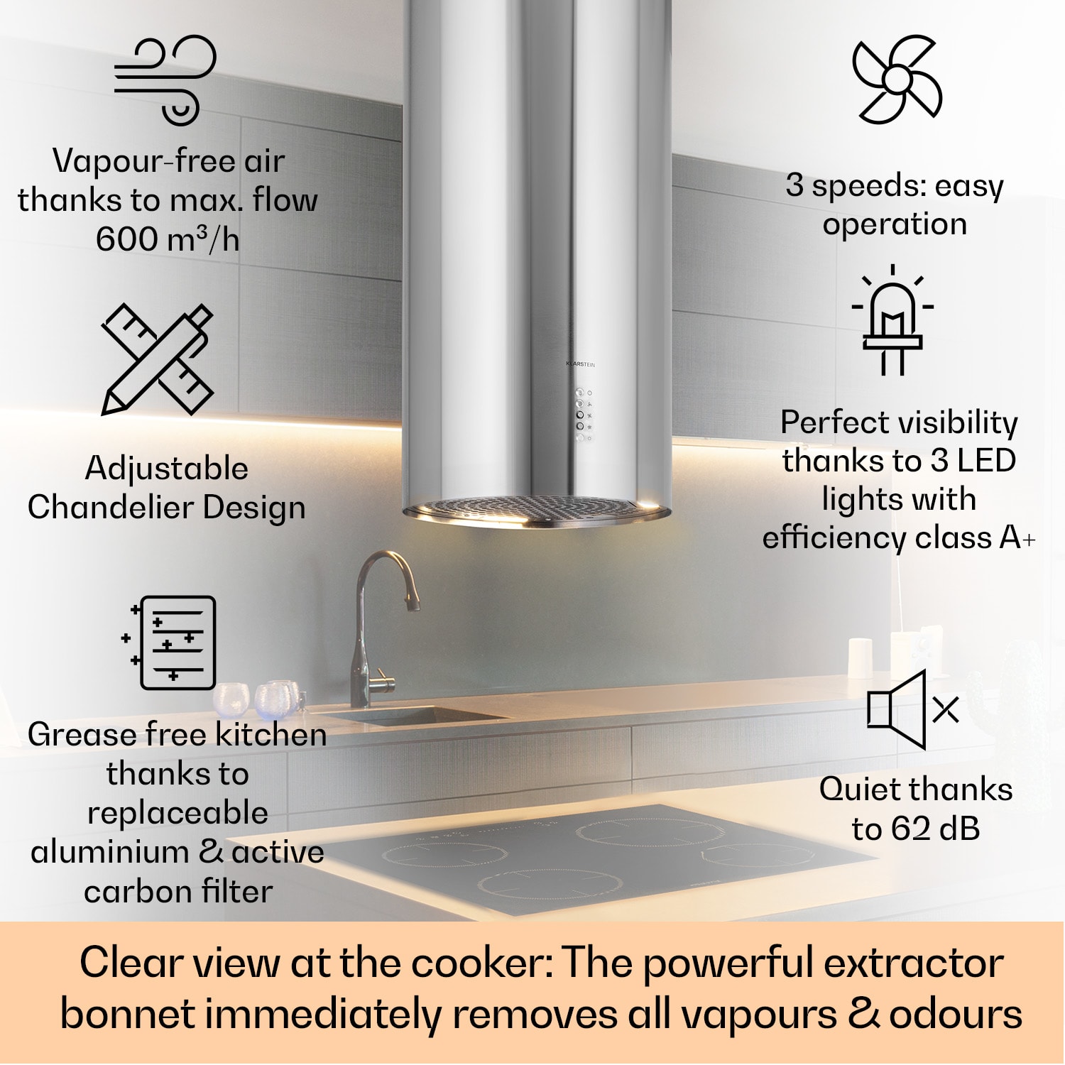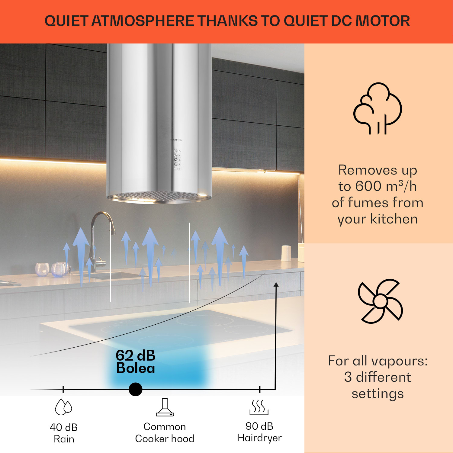 Elegancia pre čistý vzduch: Ostrovčekový digestor Bolea od Klarstein prináša do kuchyne nový lesk a vyčistí pri tom vzduch od zápachov a pary.Dokonalosť pre váš kuchynský ostrovček. S digestorom Bolea od Klarstein získajú voľne stojace varné plochy záverečný luxusný doplnok. Stĺpový digestor je pevne a bezpečne upevnený na strope a pohodlne sa postará o vznikajúce výpary v kuchyni. V troch odsávacích stupňoch odstráni až 600 m³/h vzduchu a očistí tak kuchyňu od tukov a zápachov. Týmto je ideálny do väčších priestorov americkej kuchyne s ostrovčekom. Zabudované LED osvetlenie kuchynskej plochy poskytuje vo všetkých výkonnostných stupňoch jasné, teplé svetlo. Výkon a svetlo sa dajú jednoducho zapínať pomocou predného ovládacieho panelu. Ostrovčekový digestor sa dá používať v recirkulačnom režime ale aj s odsávaním vzduchu. Aby odsávaciu hadicu nebolo vidieť, je k dispozícii kryt, ktorý je bezpečne uchytený s nosnou konštrukciou. Na prestavbu na recirkulačný režim sa hodia filtre s aktívnym uhlím, ktoré sú priamo dostupné v balení.Ostrovčekový digestor Bolea od Klarstein zaujme aj svojim vonkajškom. Zaoblené, čierne telo z nehrdzavejúcej ocele dodáva vášmu ostrovčeku štýlový lesk.