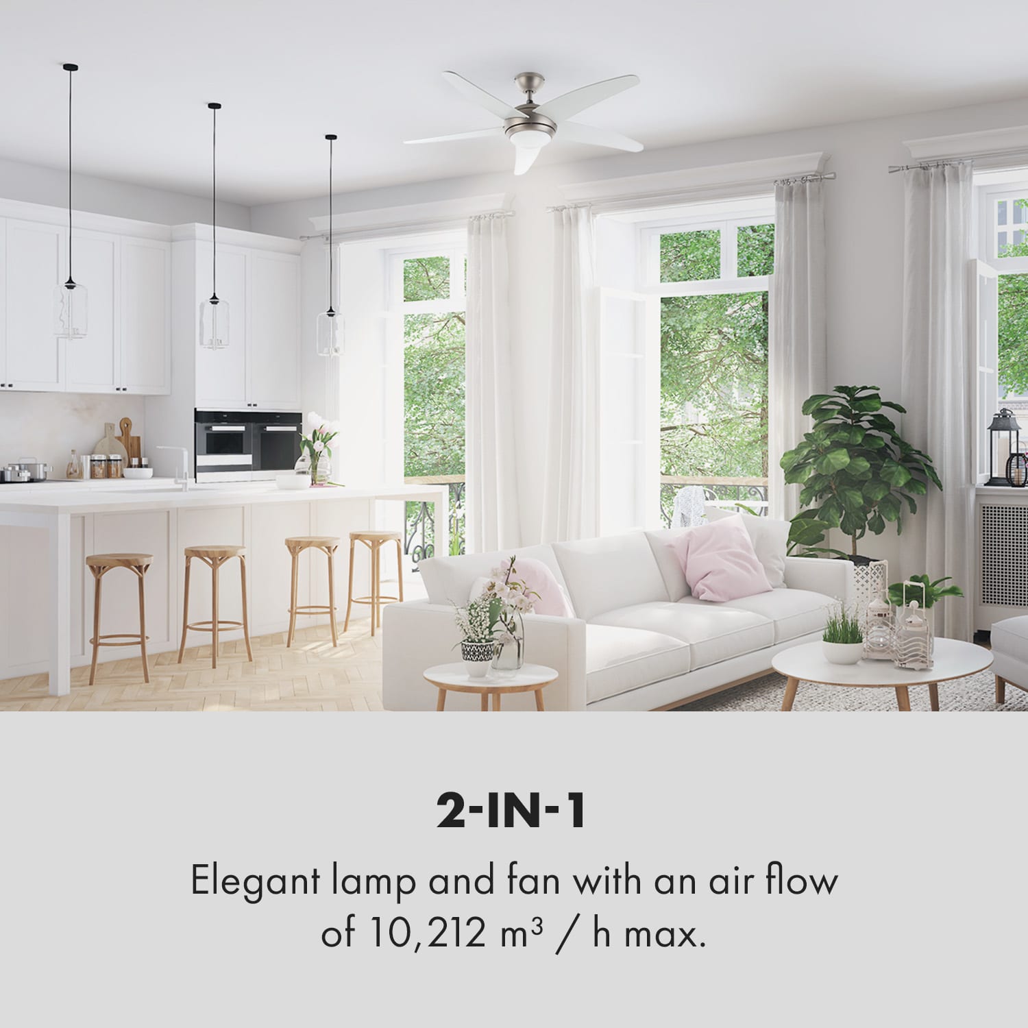 Klarstein prináša do každej miestnosti pomocou stropného ventilátora 2 v 1 Bolero svetlo a čerstvý vzduch. V kombinácii, ktorá je praktická a luxusná zároveň, zjednocuje stropný ventilátor so stropnou lampou. Toto spojenie sa ukázalo ako mimoriadne šikovné, pretože väčšina miestností má obvykle na strope iba jedno elektrické pripojenie na lampu – nehovoriac o tom, že aj lampa, aj ventilátor majú byť ideálne umiestnené uprostred stropu. Zariadenie Bolero eliminuje všetky zložité stavebné práce, pretože jednoducho používa dostupné pripojenie pre obidve zariadenia.Vo vnútri ozdobného tela sa nachádza motor pre ventilátor a tiež integrované stropné svetlo z mliečneho skla. Obidve zariadenia môžu byť prevádzkované spoločne alebo samostatne. Na ovládanie je k dispozícii pohodlný diaľkový ovládač, ktorý ti dokonca ušetrí cestu k vypínaču svetla. Ako svietidlo môžu byť podľa potreby použité všetky žiarovky s objímkou E14 do 60 W, takže aj veľké miestnosti budú optimálne osvetlené.Pri spotrebe energie 55 W zaujme stropný ventilátor Klarstein Bolero príjemne nízkou spotrebou aj pri nepretržitej prevádzke. Dva smery otáčania ventilátora zabezpečujú, že päť lopatiek rotora s priemerom 134 cm smeruje prúd vzduchu k stropu alebo k podlahe. V dôsledku toho podporuje stropný ventilátor vnútornú klímu počas chladných aj teplých dní. Pri prúdení vzduchu smerom k stropu rozvádza stúpajúci teplý vzduch v miestnosti a pomáha tak rovnomernému zohrievaniu miestnosti v chladnom období. Ak je naopak prúd vzduchu nasmerovaný k zemi, vytvára príjemne svieži vánok, ktorý sa postará o ochladenie v horúcich dňoch alebo nociach. Intenzita prúdenia vzduchu sa dá prispôsobiť individuálnym požiadavkám pomocou troch rýchlostí otáčania.Stropný ventilátor Bolero od spoločnosti Klarstein je skutočným vizuálnym zdokonalením každej miestnosti. Telo s kartáčovaným niklovým povrchom vyžaruje luxus, ktorý bude ladiť s moderným aj klasickým obytným a pracovným prostredím. Biele lopatky rotora z MDF tento efekt zosilňujú a zdôrazňujú. Matný sklenený kryt lampy príjemným spôsobom tlmí ostré svetlo žiarovky bez toho, aby priestor ukrátil o svetlosť.Upozorňujeme, že elektroinštalácie smú byť vykonávané iba vyškoleným odborným personálom. Na pripájanie ventilátora preto privolajte elektrikára.