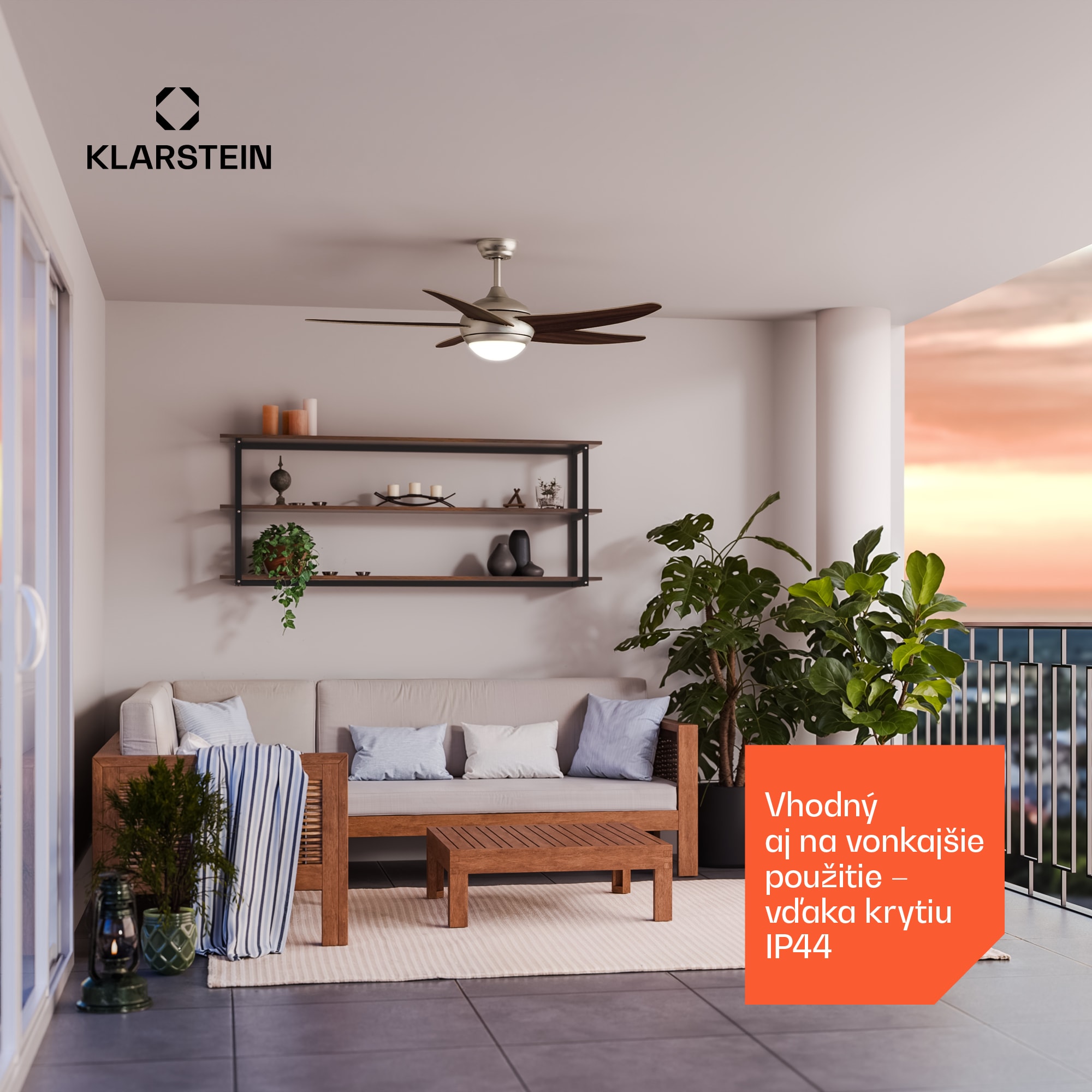 Stropný ventilátor so svetlom Klarstein Bolero sa vyznačuje vysokou kvalitou materiálov a príťažlivým dizajnom.S piatimi lopatkami rotora a maximálnym prietokom vzduchu 10 260 m³ za hodinu zabezpečuje príjemnú vnútornú klímu v miestnostiach s rozlohou do 25 m².Obsluhuje sa diaľkovým ovládaním a možno si vybrať šesť rôznych úrovní výkonu a dva rôzne smery otáčania. V lete ventilátor fúka vzduch smerom nadol a vytvára chladný vánok, zatiaľ čo v zime v opačnom režime nasáva vzduch smerom nahor a jemne rozvádza teplý vzduch po miestnosti.Integrovanú lampu s výkonom 60 W a svietivosťou 800 lúmenov možno ľahko použiť ako stropné svietidlo. Užívatelia si môžu vybrať z troch farieb a intenzity svetla, čo im umožňuje prispôsobiť osvetlenie svojej nálade a požiadavkám.Môže sa používať v interiéri aj exteriéri, napríklad na terasách a balkónoch. To znamená, že stropný ventilátor možno kedykoľvek použiť individuálne a podľa potreby.