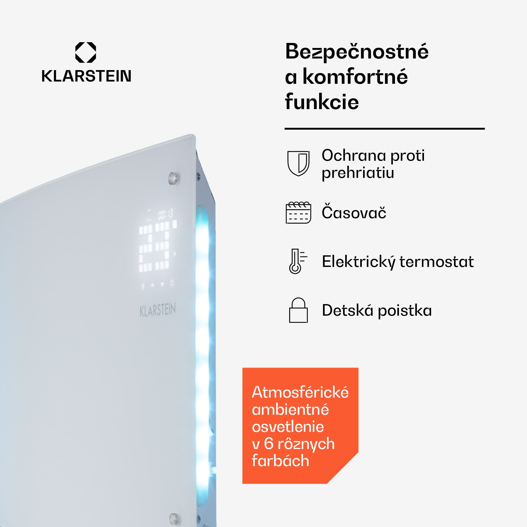 Konvekčný ohrievač Klarstein Bornholm Curved Ambient poskytuje zdroj rovnomerného tepla až do 45 °C pre miestnosti s výmerou do 20m². Vďaka dvom stupňom výkonu 1000 a 2000 W vykúri tento výkonný konvektor každú miestnosť rýchlo a spoľahlivo. Požadovaná teplota je udržiavaná na stupeň presne vďaka termostatu. Režim ECO znižuje spotrebu energie na minimum: takto šetrí životné prostredie i vašu peňaženku. Vďaka ochrane proti striekajúcej vode môžete tento kvalitný ohrievač umiestniť aj vo vlhkých miestnostiach, naprogramovať ho na minútu presne pomocou funkcie časovača alebo pohodlne ovládať diaľkovým ovládačom.Ohrievač Bornholm Curved Ambient od spoločnosti Klarstein váš domov vyhreje a príjemne ho rozžiari – bez ohľadu na to, aká je vonku zima.