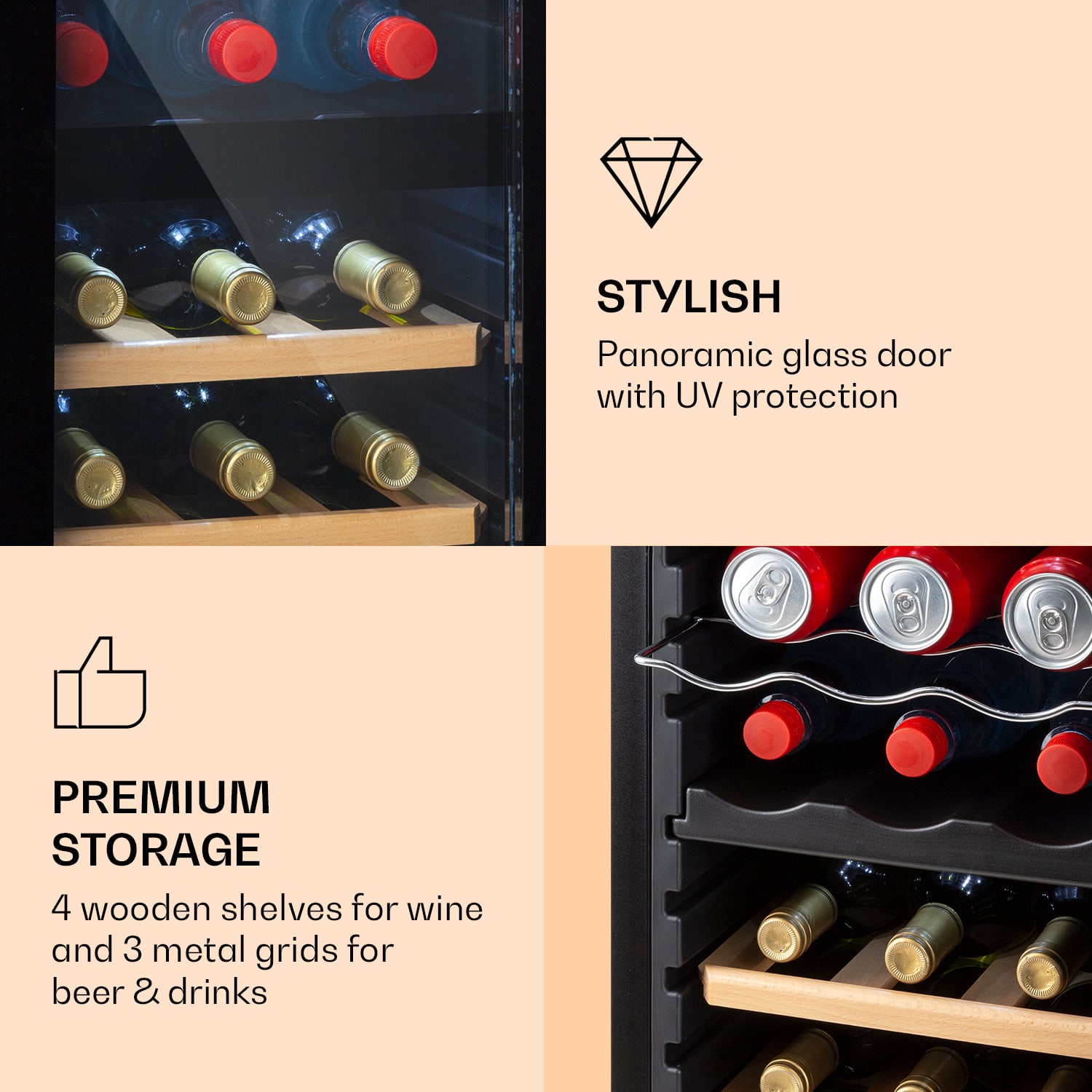 Dve zóny pre každú chuť. Vinotéka Klarstein Bovella 27 Duo+ so svojimi dvoma chladiacimi zónami spĺňa požiadavky na vinotéku a chladničku na nápoje jednoduchým a kompaktným spôsobom. Táto dvojzónová vinotéka umožňuje, aby boli na spodných 4 drevených zásuvných policiach uskladnené vínové fľaše, zatiaľ čo pivo, džúsy alebo nápoje sa chladia na oboch horných policiach s jednou kovovou zásuvnou policou. Obe zóny môžete nastaviť oddelene na teploty od 5 do 18 °C. O štýlový pohľad sa starajú panoramatické sklenené dvierka.Jednoducho plus k pôžitku: Vinotéka Klarstein Bovella 27 Duo+.