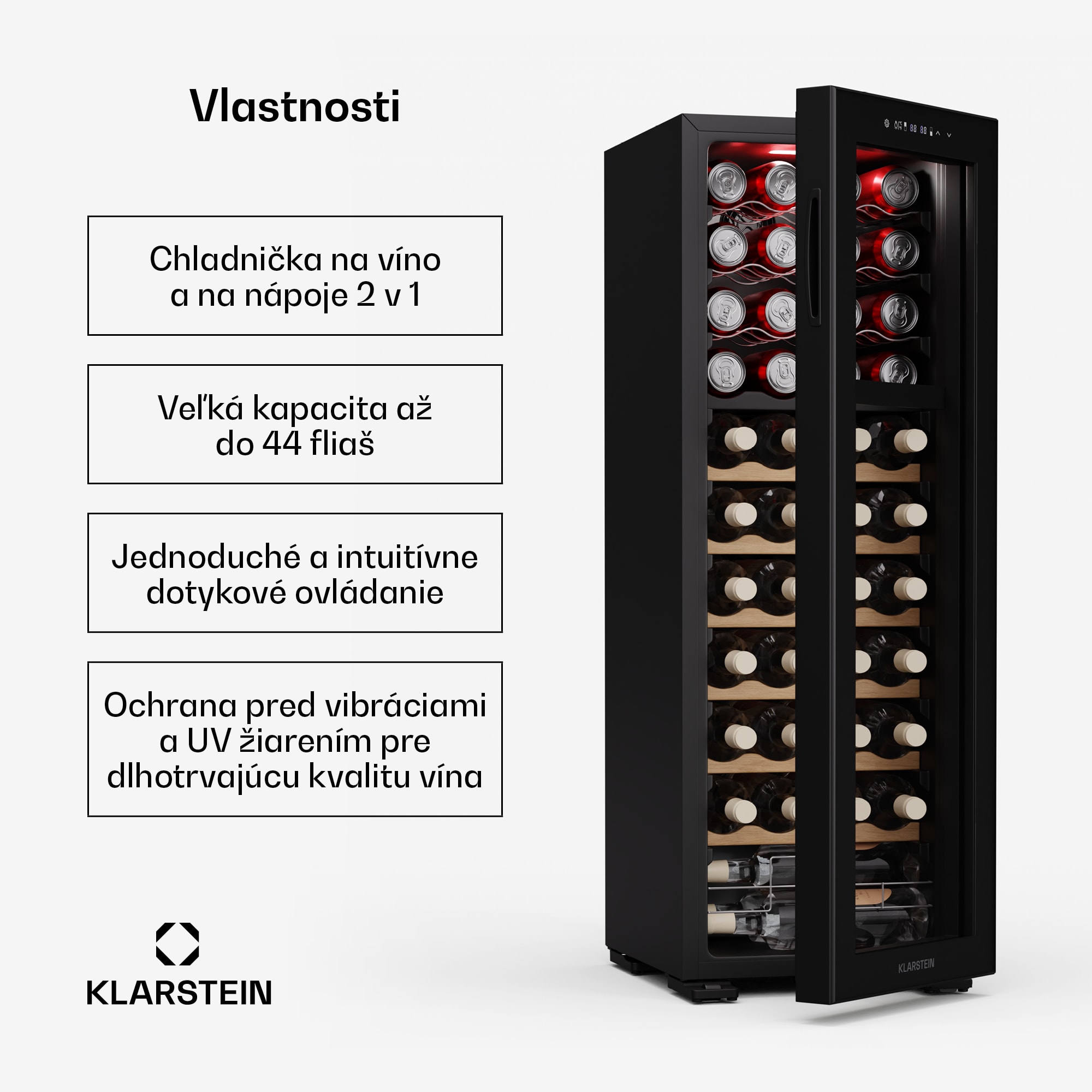 Zažite optimálne skladovanie vašich vín a nápojov s vinotékou a chladničkou na nápoje Klarstein Bovella 44 Duo+. Vďaka oddeleným chladiacim zónam môžete skladovať červené, biele a šumivé vína súčasne pri ideálnej teplote. Chladnička na víno a nápoje Klarstein Bovella 44 Duo+ je všestranným spoločníkom do každej domácnosti. S objemom 121 litrov ponúka priestor až pre 44 fliaš a je ideálna na skladovanie rôznych druhov vína a iných nápojov. Táto dvojzónová vinotéka umožňuje skladovať rôzne druhy vína pri ich optimálnej teplote od 5 do 18 °C. Elegantný dizajn so štýlovým vnútorným LED osvetlením a intuitívnym dotykovým ovládacím panelom z nej robí ozdobu každej kuchyne alebo obývačky. Vďaka funkciám ochrany proti vibráciám a UV žiareniu zostanú vaše vína uchované v tej najlepšej kvalite. Chladnička má tichú prevádzku s hlučnosťou len 43 dB a možno ju flexibilne umiestniť ako voľne stojaci spotrebič.Uistite sa, že je chladnička umiestnená na rovnom povrchu. Police pravidelne čistite mäkkou handričkou a vyhýbajte sa priamemu slnečnému žiareniu.Zažite dokonalé podmienky na skladovanie svojich vín a nápojov. Objednajte si chladničku na víno a nápoje Klarstein Bovella 44 Duo+ 2 v 1 ešte dnes!