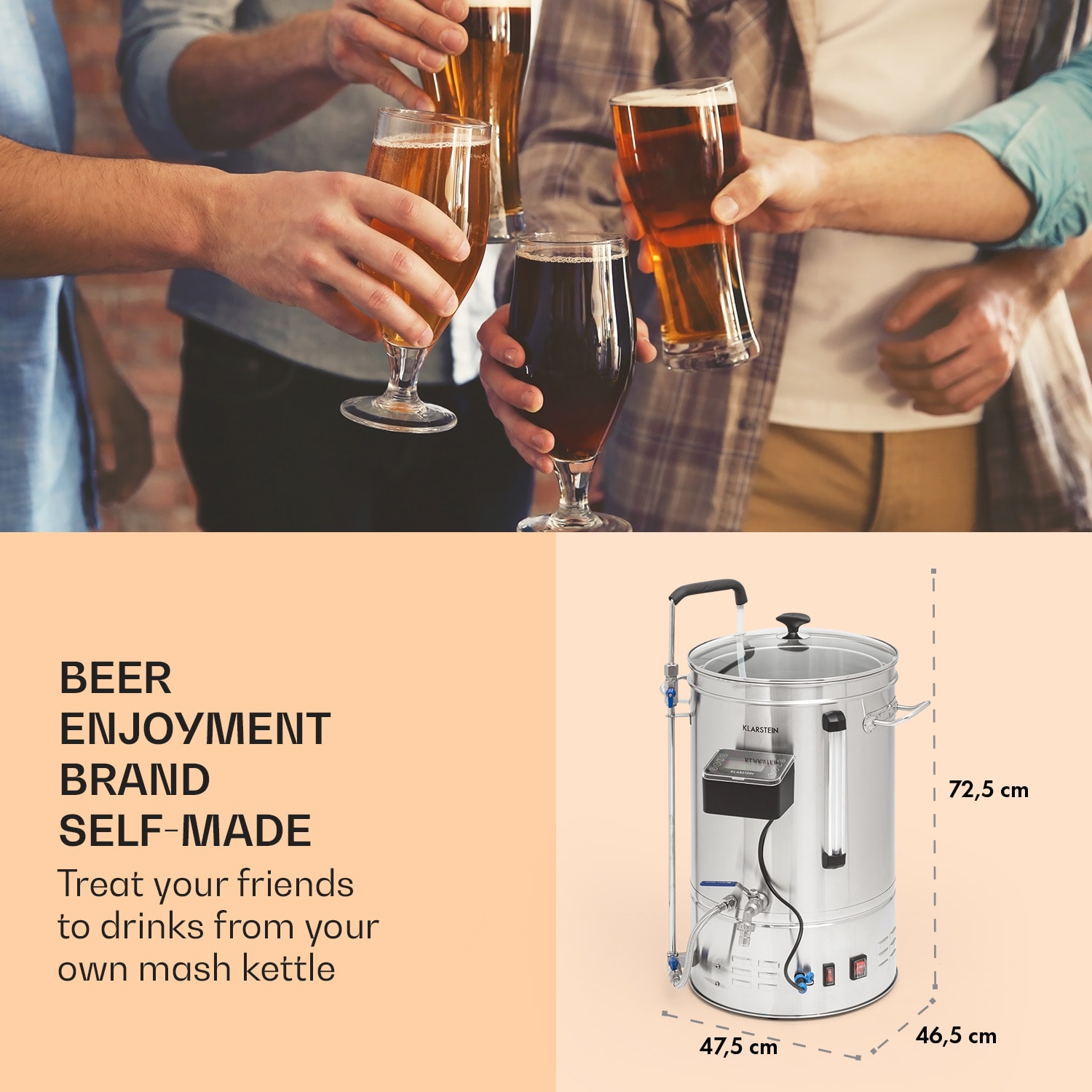 Či už ide o svetlé alebo tmavé, vrchne alebo spodne kvasené, pšeničné alebo plzenské pivo, rmutovací kotol Klarstein Mundschenk je kompletný balík na varenie piva – poskytuje domácemu pivovaru tú správnu originálnu mladinu. Aj amatéri môžu ľahko podávať osviežujúce, chutné domáce pivo s inteligentným varičom piva!Či už ste začiatočník alebo skúsený hobby pivovarník, Klarstein Brauheld Smart 35 varný kotol poskytuje jednoduchý kompletný balík na prípravu varného rmutu. Teplotu, čas varenia a výkon možno presne nastaviť na prehľadnom ovládacom paneli s LC displejom. Náš osvedčený systém MemoryBrew je tu mimoriadne praktický: jednoducho naprogramujte a uložte až 11 krokov varenia. 9 pamäťových miest na recepty umožňuje rozmanité varné procesy. Obzvlášť šikovné: Riešenie Klarstein Brauheld Smart 35 môžete ovládať a monitorovať prostredníctvom aplikácie Klarstein kompletne zo svojho smartfónu. Prostredníctvom aplikácie alebo odnímateľného ovládacieho panela ohrievacie teleso rozohrieva rmut v 100-wattových krokoch až do 2500 W, voliteľne pri 30 až 100 °C. Aby sa zabezpečilo presné dodržanie správneho času varenia pre jednotlivé kroky, je možné nastaviť časovač na minútu od 1 do 99 minút – pre každý z až jedenástich krokov varenia.Patentovaný trojdimenzionálny systém čerpadla pivovarskej jednotky Klarstein Brauheld Smart 35 je mimoriadne praktický: s horizontálnou a vertikálnou cirkuláciou zabezpečuje rovnomerný ohrev rmutu bez pripálenia. Odnímateľná nádoba na zrno so sitkovou vložkou veľmi uľahčuje vyberanie použitých zŕn z predsladiny. Rýchlospojkový systém obehového čerpadla umožňuje odpojiť hadicu čerpadla a vypúšťací kohút v niekoľkých jednoduchých krokoch. Potom sa hotová kaša môže preniesť priamo do fermentačnej nádoby. Všetky časti sú vyrobené z nehrdzavejúcej ocele 304. To znamená, že do piva sa nedostanú žiadne kovové chute a čistenie je mimoriadne jednoduché.Čerstvé pivo z vlastného domáceho pivovaru? Nič nemôže byť jednoduchšie: S rmutovacím kotlom Klarstein Brauheld Smart 35 môže každý amatérsky pivovarník ľahko dosiahnuť správnu pôvodnú mladinu.Upozornenie: V Nemecku je potrebné varenie piva nahlásiť príslušnému hlavnému colnému úradu.