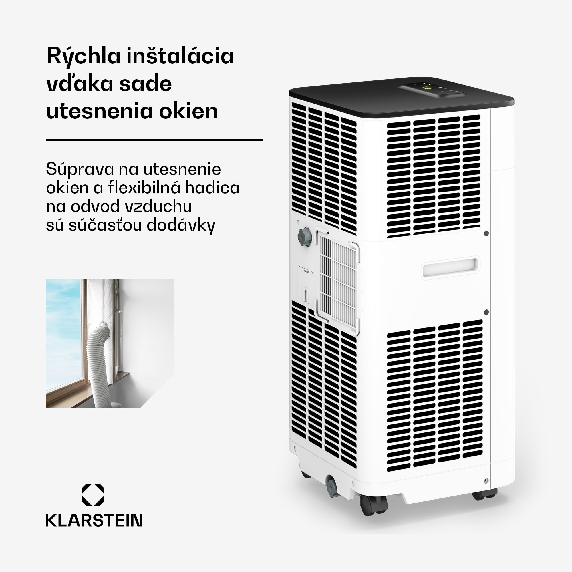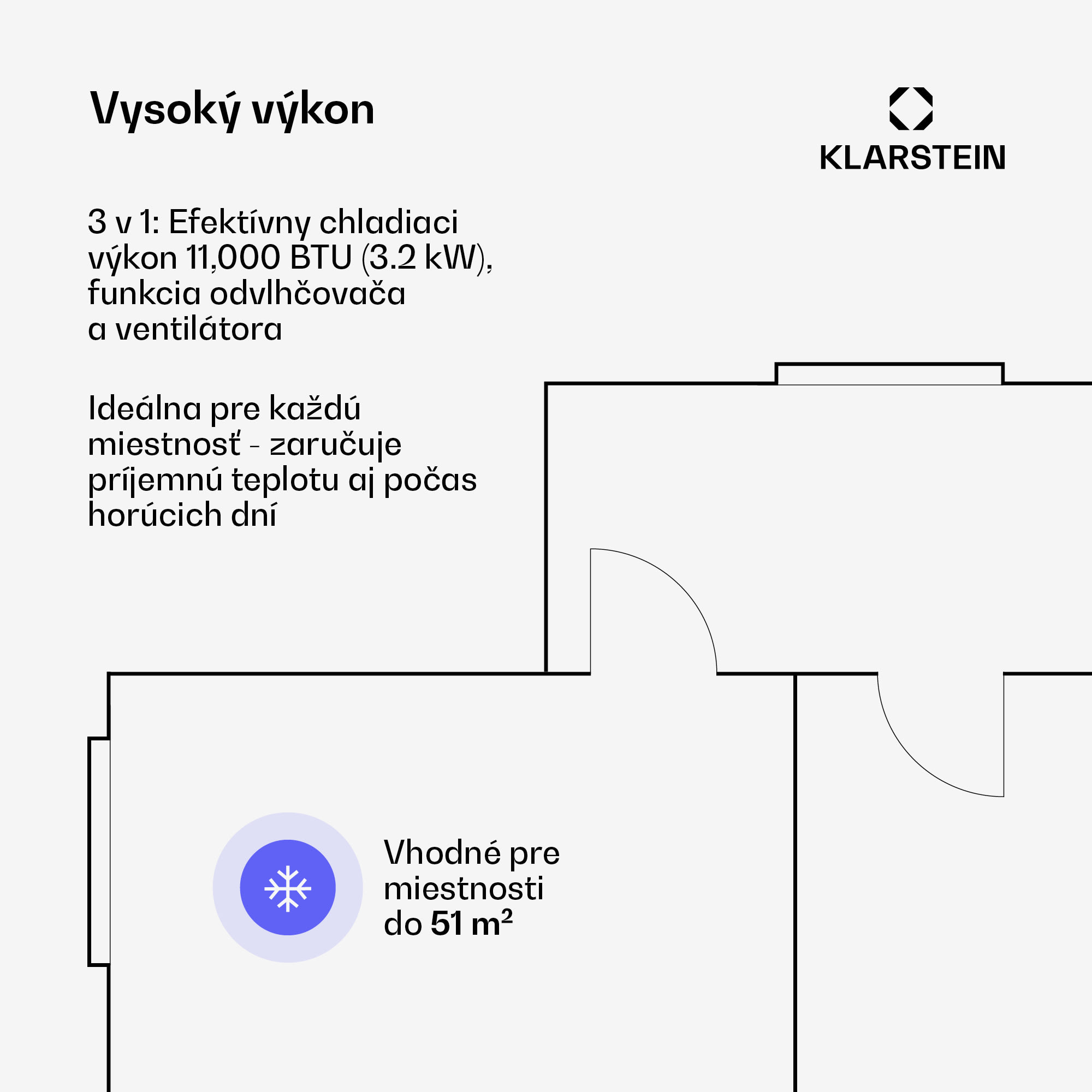 Klarstein Breeze Box mobilná klimatizácia spája vysoký výkon s flexibilitou a energetickou efektívnosťou.Chladí priestory s rozlohou až do 51 štvorcových metrov s výkonom 11000 BTU a tromi stupňami výkonu. Mobilná klimatizácia pritom vždy pracuje efektívne s príkonem len 1,2 kWh za hodinu a energetickou triedou A.Ovládanie je možné diaľkovým ovládačom, cez aplikáciu, priamo na zariadení alebo hlasovým ovládaním a asistentmi Smart Home ako Alexa a Google Home.Umiestnenie je možné voľne stojace a vďaka kolieskam flexibilne prispôsobiteľné. Klimatizácia tak môže byť kedykoľvek individuálne a podľa potreby využívaná.Okrem chladiacej funkcie je zariadenie použiteľné aj ako odvlhčovač a ventilátor. Časovač a integrovaný nočný režim zaručujú vždy optimálnu efektivitu a mimoriadne pohodlné používanie.