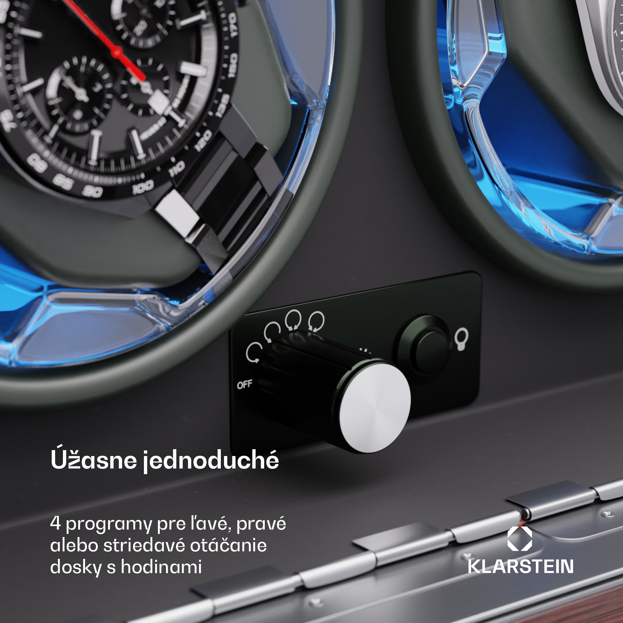 Dokonale tvarované precízne remeselné spracovanie! S naťahovačom hodiniek Klarstein Brienz 2 budú vaši elegantní spoločníci vždy dobre udržiavaní a pripravení na použitie. Automatické hodinky uložené v zariadení sa nepretržite naťahujú pomocou 4 režimov otáčania, ktoré simulujú pohyb zápästia. K starostlivosti o strojček hodiniek prispieva aj rotácia, ktorá účinne pôsobí proti stuhnutiu olejového mazania. Naťahovač hodiniek a stojan na hodinky Brienz 2 má elegantné puzdro dreveného vzhľadu, ktoré štýlovo zapadne do ambientu každej miestnosti. Štýlové integrované modré osvetlenie LED možno nastaviť pomocou jednoduchého a intuitívneho ovládania. Praktický otočný gombík na nastavenie požadovaného režimu sa nachádza vpravo. Vďaka integrovanému vankúšiku z pamäťovej peny možno do naťahovača ľahko umiestniť hodinky s rôznymi veľkosťami remienkov, ako aj dámske i pánske hodinky. Napájanie sa uskutočňuje prostredníctvom USB kábla, ktorý možno použiť s akýmkoľvek napájacím zdrojom USB, a preto je úplne nezávislý od prevládajúceho typu zásuvky. Ďalšou zaujímavosťou tohto modelu je malá priehradka na šperky v hornej časti, ktorá poskytuje bezpečné miesto na prstene, náramky, náhrdelníky a podobné predmety, keď sa práve nenosia.Vďaka svojim skromným rozmerom a hladkému chodu tichého motorčeka s prevádzkovou hlučnosťou nižšou ako 10 dB možno naťahovač hodiniek jednoducho umiestniť priamo na nočný stolík alebo do iných nehlučných zón.Upozorňujeme, že zobrazené hodinky nie sú súčasťou dodávky.