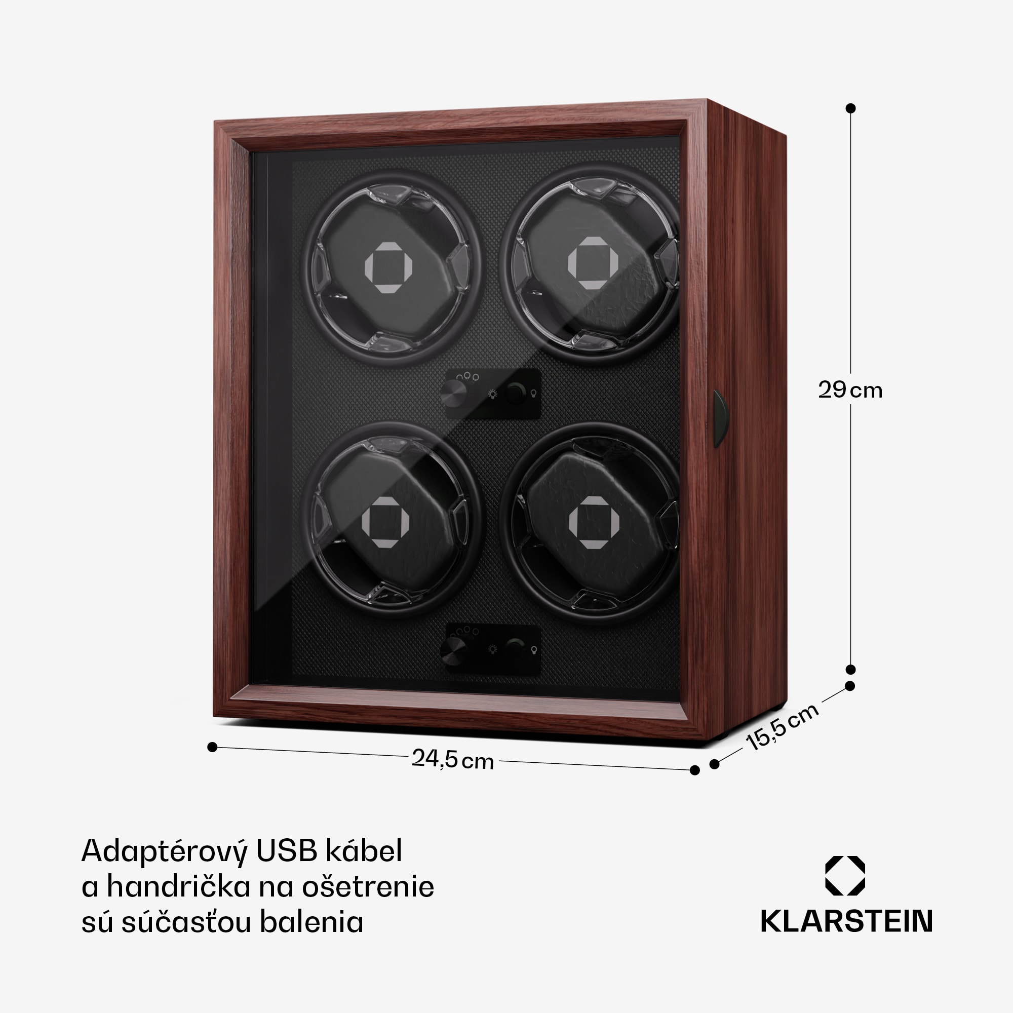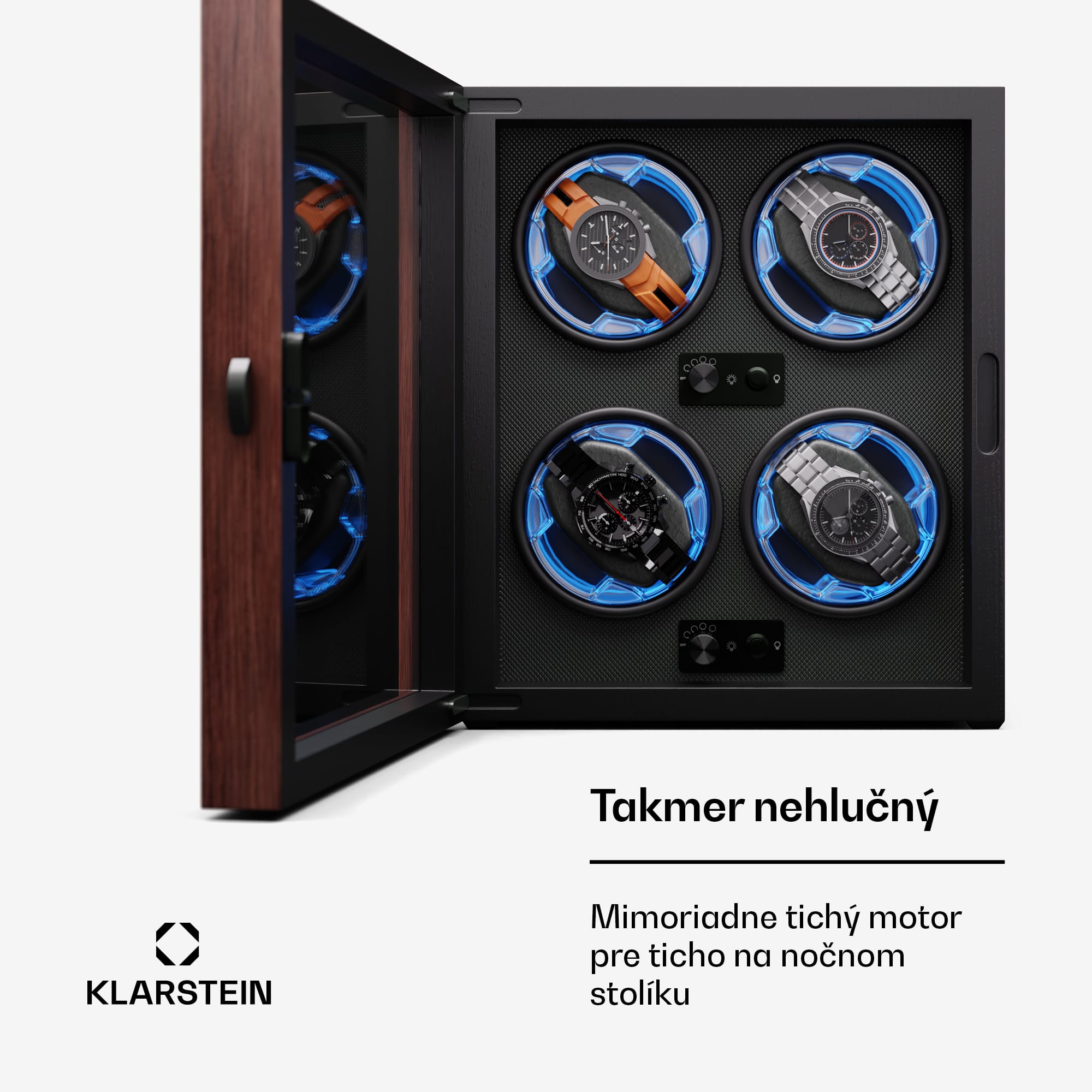 Dokonale tvarované precízne remeselné spracovanie! S naťahovačom hodiniek Klarstein Brienz 4 budú vaši elegantní spoločníci vždy dobre udržiavaní a pripravení na použitie. Automatické hodinky uložené v zariadení sa nepretržite naťahujú pomocou 4 režimov otáčania, ktoré simulujú pohyb zápästia. K starostlivosti o strojček hodiniek prispieva aj rotácia, ktorá účinne pôsobí proti stuhnutiu olejového mazania. Naťahovač hodiniek a stojan na hodinky Brienz 4 má elegantné puzdro dreveného vzhľadu, ktoré štýlovo zapadne do ambientu každej miestnosti. Štýlové integrované modré osvetlenie LED možno nastaviť pomocou jednoduchého a intuitívneho ovládania. Praktický otočný gombík na nastavenie požadovaného režimu sa nachádza vpravo. Vďaka integrovanému vankúšiku z pamäťovej peny možno do naťahovača ľahko umiestniť hodinky s rôznymi veľkosťami remienkov, ako aj dámske i pánske hodinky. Napájanie sa uskutočňuje prostredníctvom USB kábla, ktorý možno použiť s akýmkoľvek napájacím zdrojom USB, a preto je úplne nezávislý od prevládajúceho typu zásuvky.Vďaka svojim skromným rozmerom a hladkému chodu tichého motorčeka s prevádzkovou hlučnosťou nižšou ako 10 dB možno naťahovač hodiniek jednoducho umiestniť priamo na nočný stolík alebo do iných nehlučných zón.Upozorňujeme, že zobrazené hodinky nie sú súčasťou dodávky.