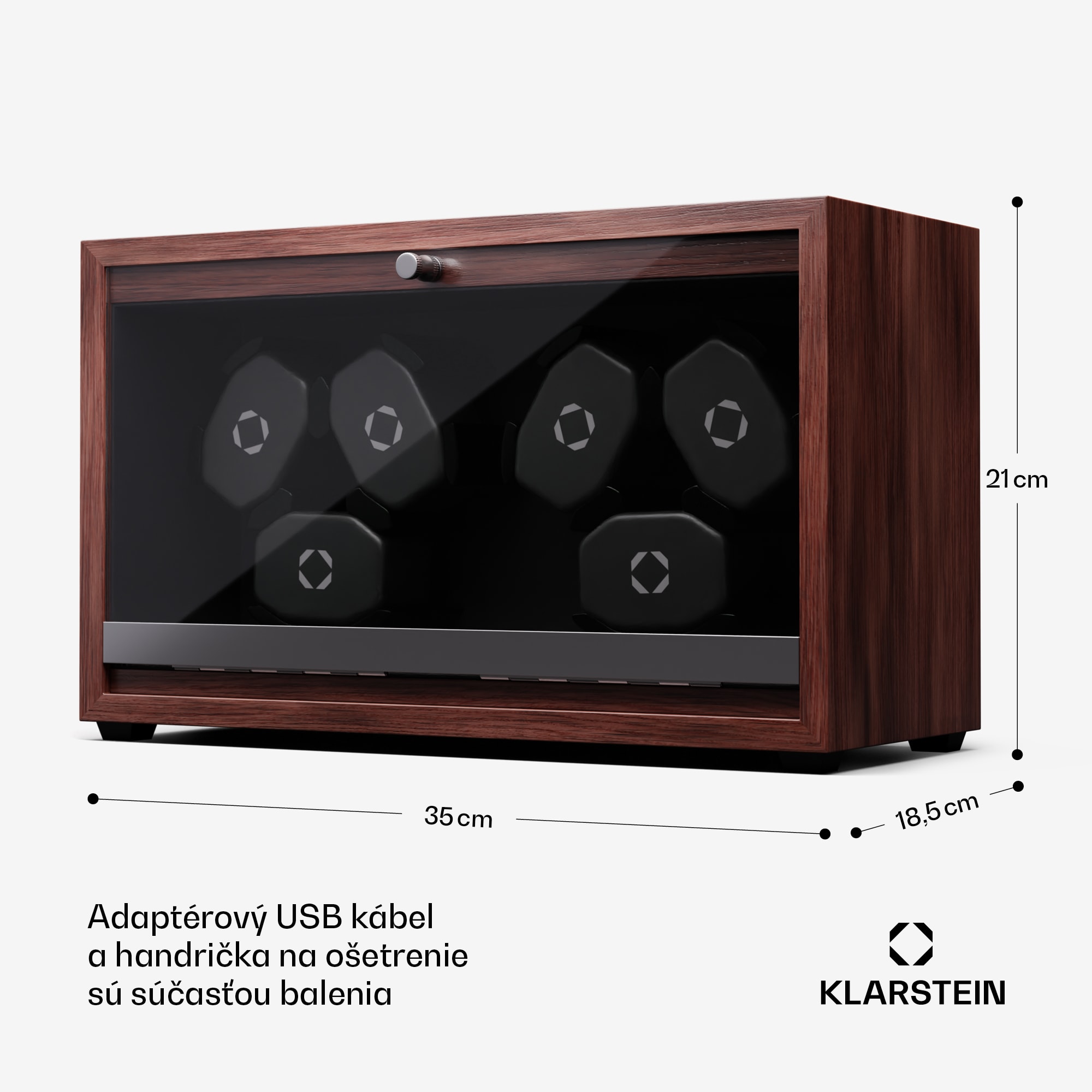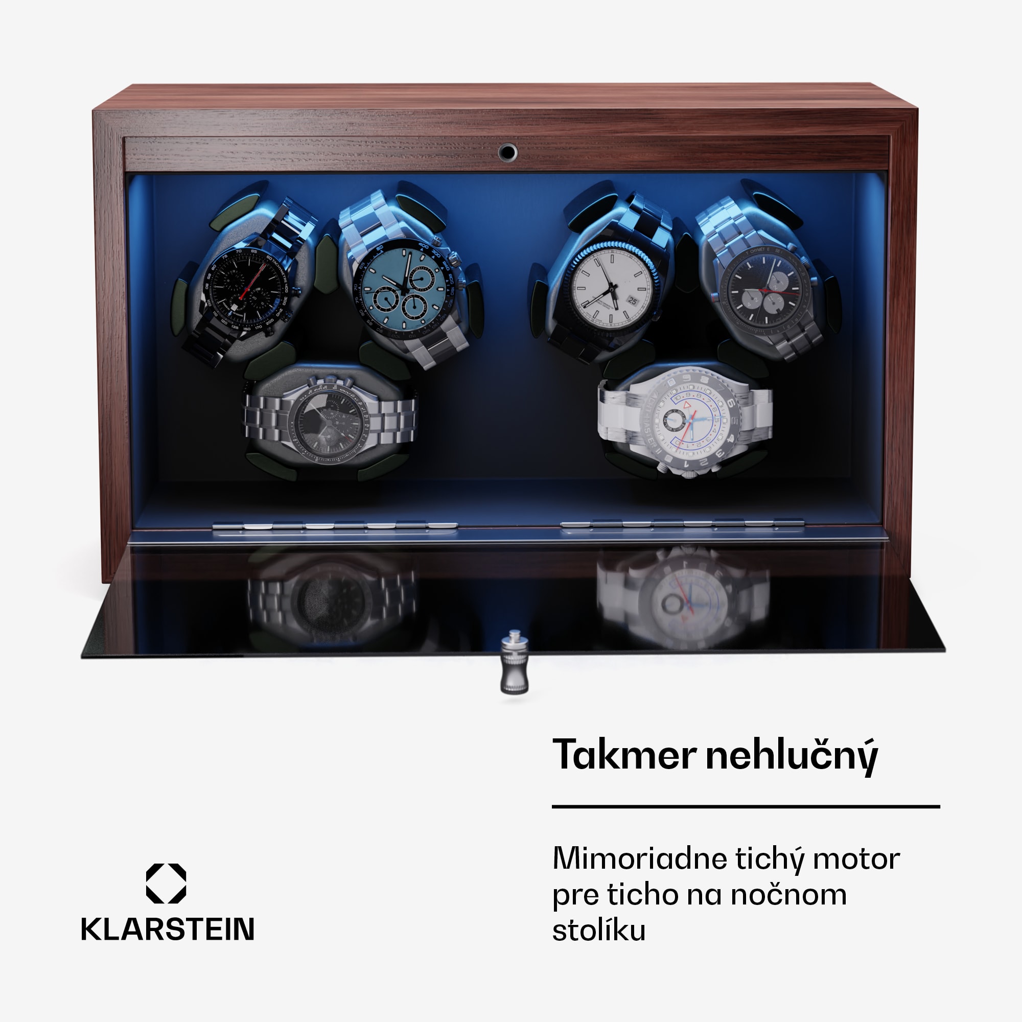 Dokonale tvarované precízne remeselné spracovanie! S naťahovačom hodiniek Klarstein Brienz 6 budú vaši elegantní spoločníci vždy dobre udržiavaní a pripravení na použitie. Automatické hodinky uložené v zariadení sa nepretržite naťahujú pomocou 4 režimov otáčania, ktoré simulujú pohyb zápästia. K starostlivosti o strojček hodiniek prispieva aj rotácia, ktorá účinne pôsobí proti stuhnutiu olejového mazania. Naťahovač hodiniek a stojan na hodinky Brienz 6 má elegantné puzdro dreveného vzhľadu, ktoré štýlovo zapadne do ambientu každej miestnosti. Štýlové integrované modré osvetlenie LED možno nastaviť pomocou jednoduchého a intuitívneho ovládania. Praktický otočný gombík na nastavenie požadovaného režimu sa nachádza vpravo. Vďaka integrovanému vankúšiku z pamäťovej peny možno do naťahovača ľahko umiestniť hodinky s rôznymi veľkosťami remienkov, ako aj dámske i pánske hodinky. Napájanie sa uskutočňuje prostredníctvom USB kábla, ktorý možno použiť s akýmkoľvek napájacím zdrojom USB, a preto je úplne nezávislý od prevládajúceho typu zásuvky.Vďaka svojim skromným rozmerom a hladkému chodu tichého motorčeka s prevádzkovou hlučnosťou nižšou ako 10 dB možno naťahovač hodiniek jednoducho umiestniť priamo na nočný stolík alebo do iných nehlučných zón.Upozorňujeme, že zobrazené hodinky nie sú súčasťou dodávky.