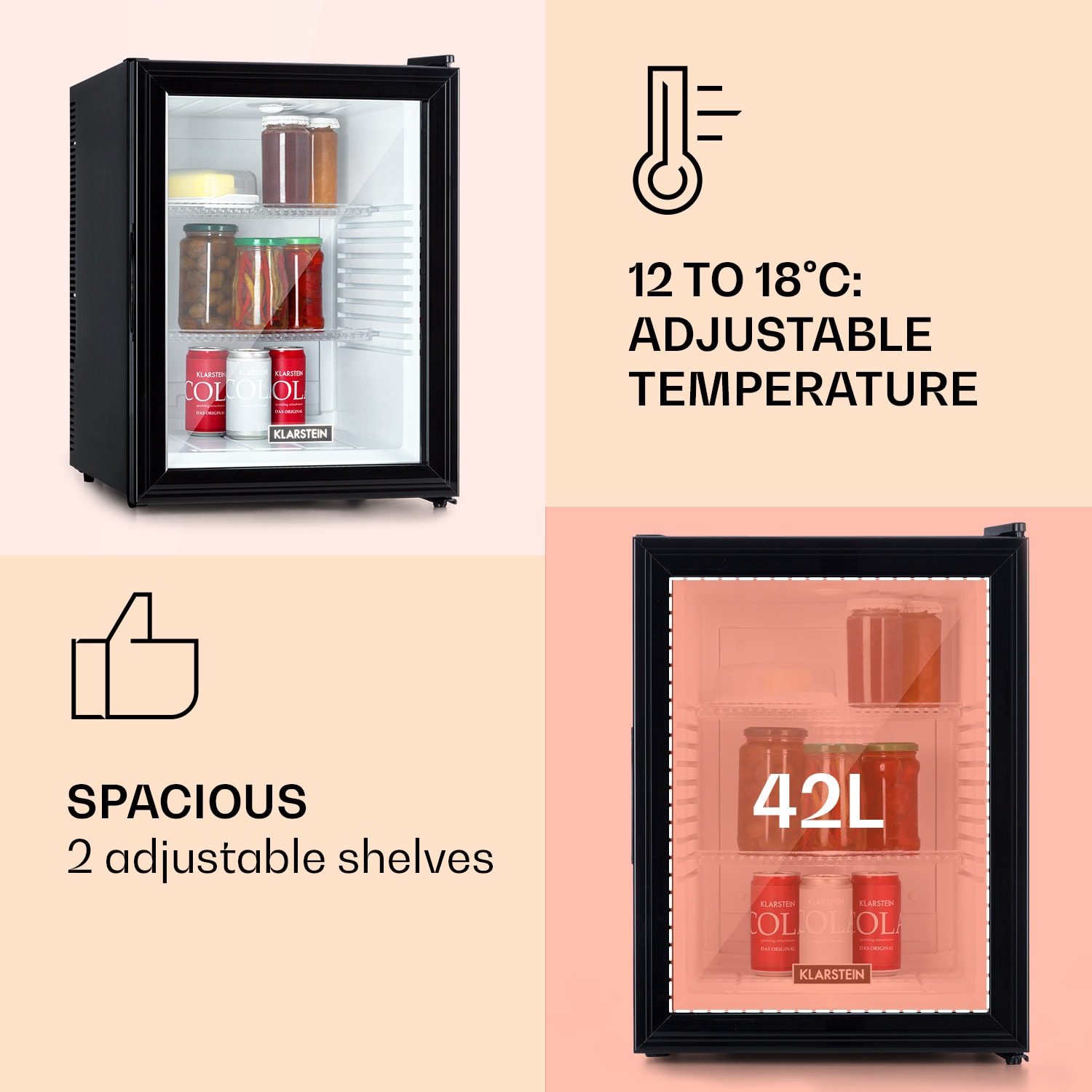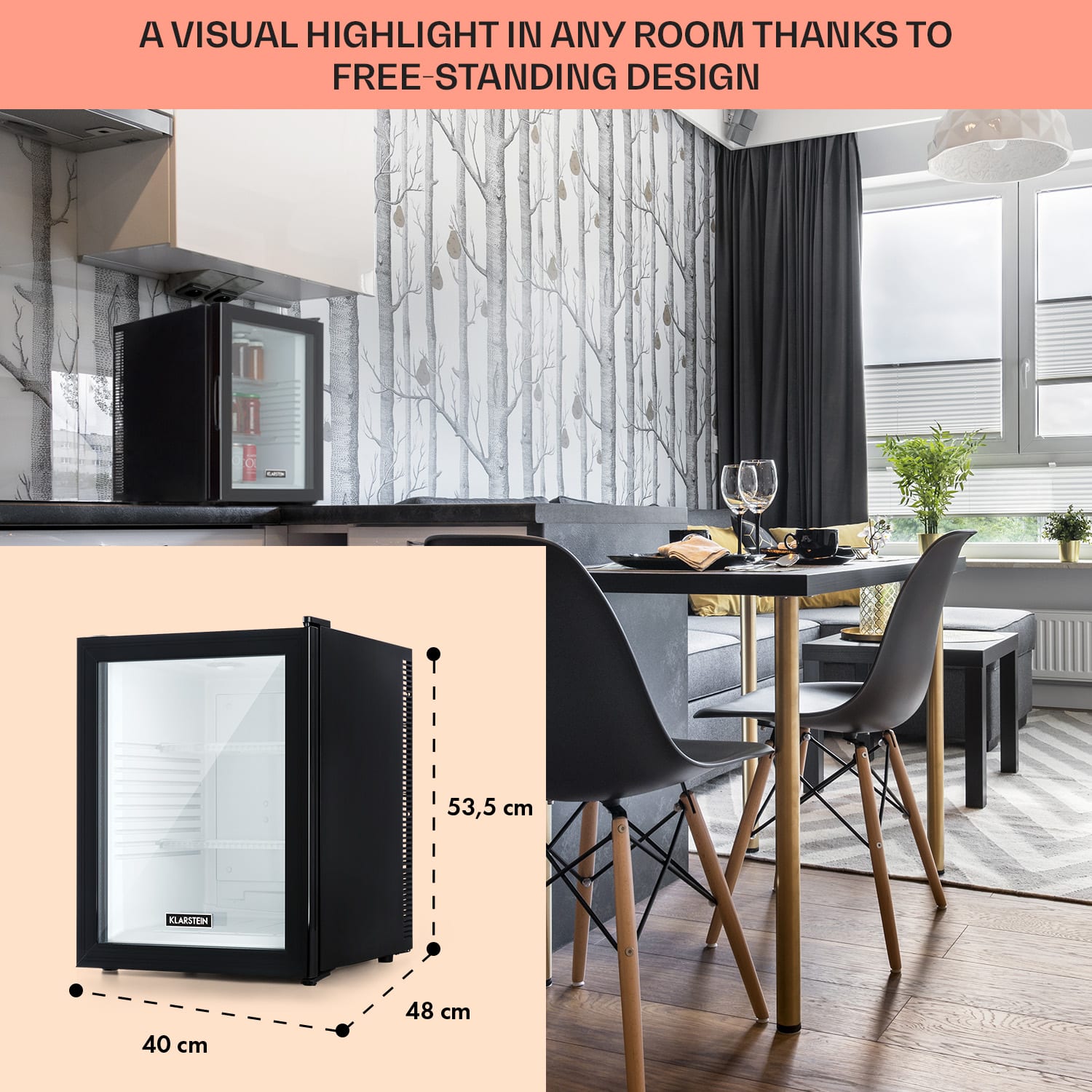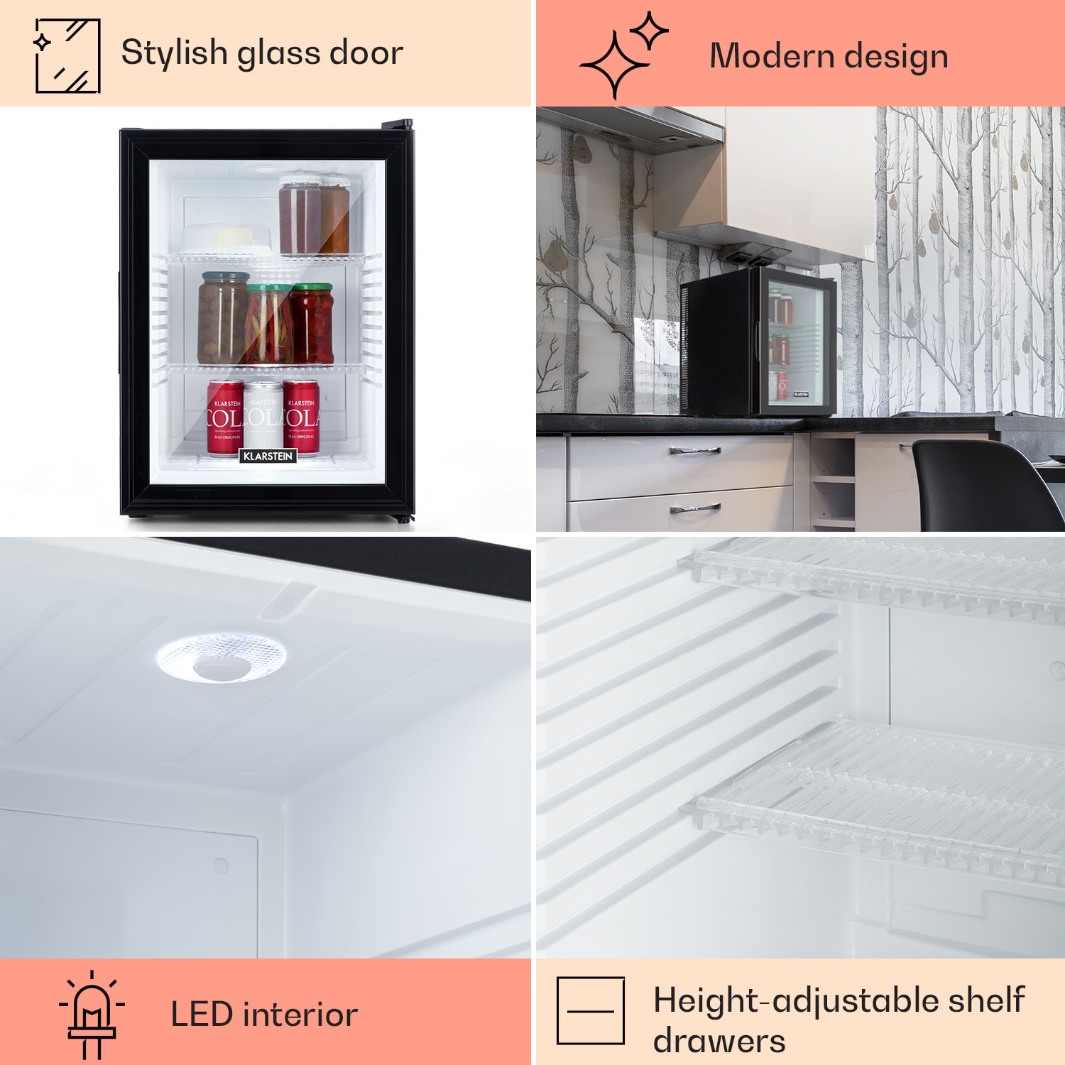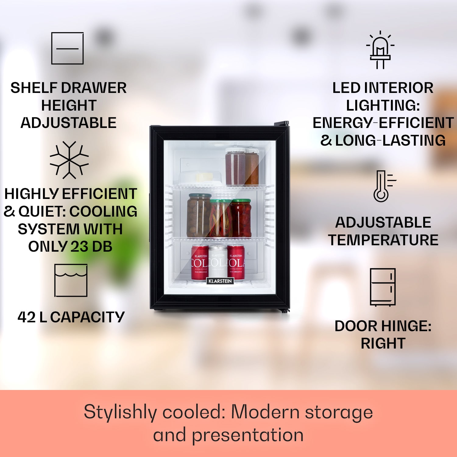 Kompaktná s veľkou úložnou kapacitou: mini-chladnička Klarstein Brooklyn 42 ponúka dostatok priestoru so 42 litrami úžitkového objemu. Na chladenie podľa potreby je možné nastaviť teplotu v rozsahu 12 až 18 °C. Brooklyn 42 pôsobí výnimočným dojmom predovšetkým vďaka senzačnému dizajnu: panoramatické sklenené dvere umožňujú neustály výhľad do jej interiéru. Vnútorné LED svetlo osvetľuje uložené potraviny, zatiaľ čo systém automatického odmrazovania Auto DeFrost minimalizuje tvorbu ľadu v chladničke aj pri častom otváraní dvierok.Prínos pre každú malú domácnosť: Klarstein Brooklyn 42 Minibar.