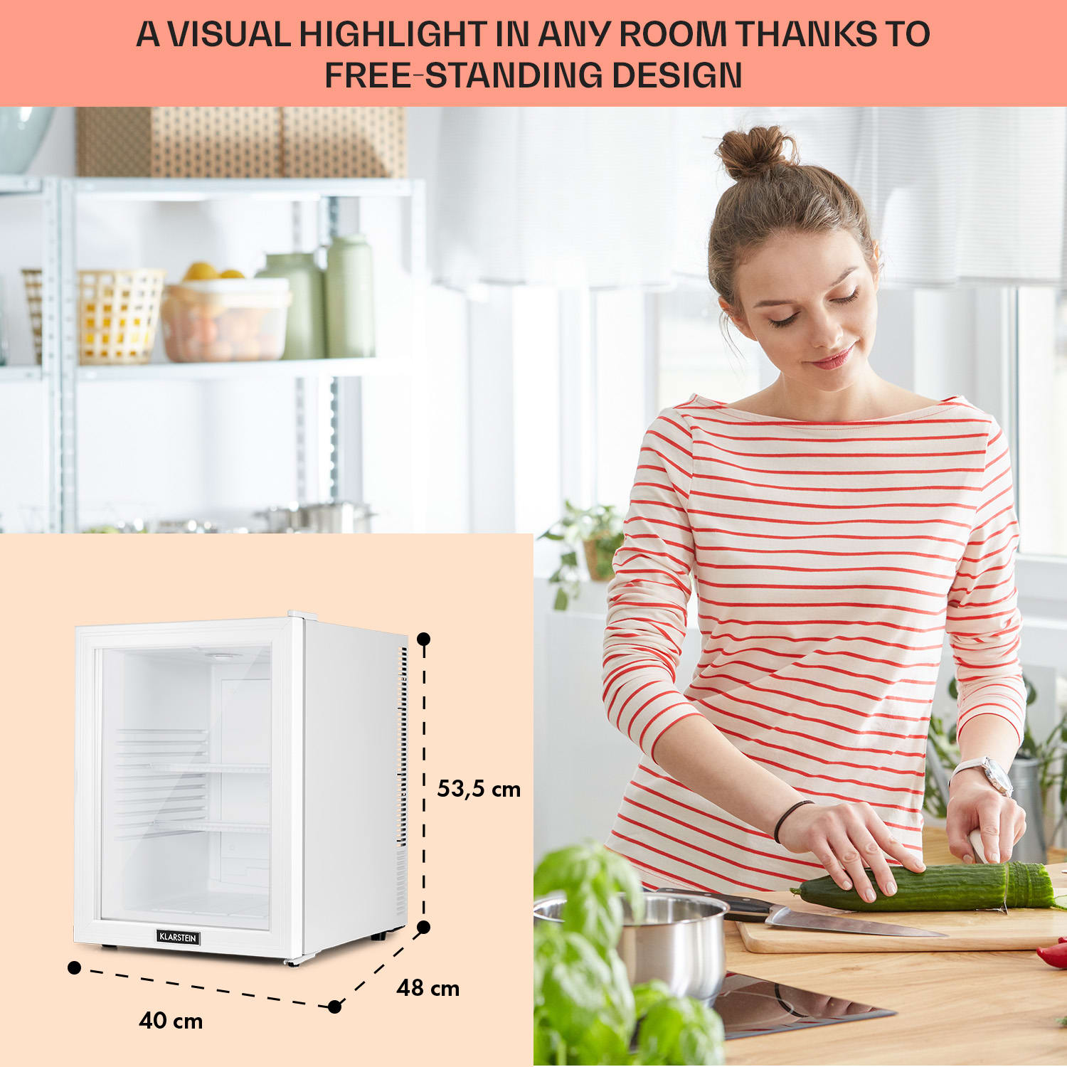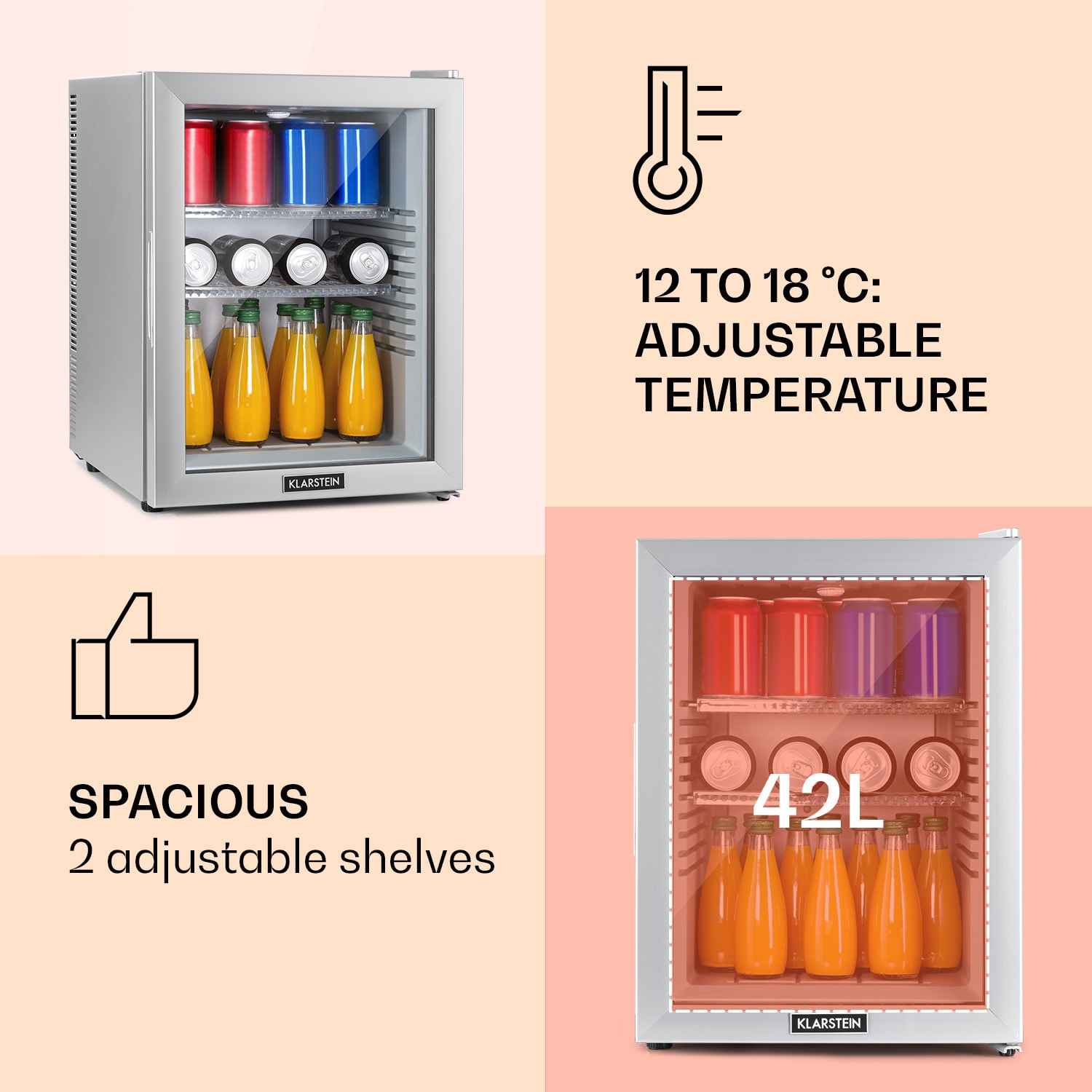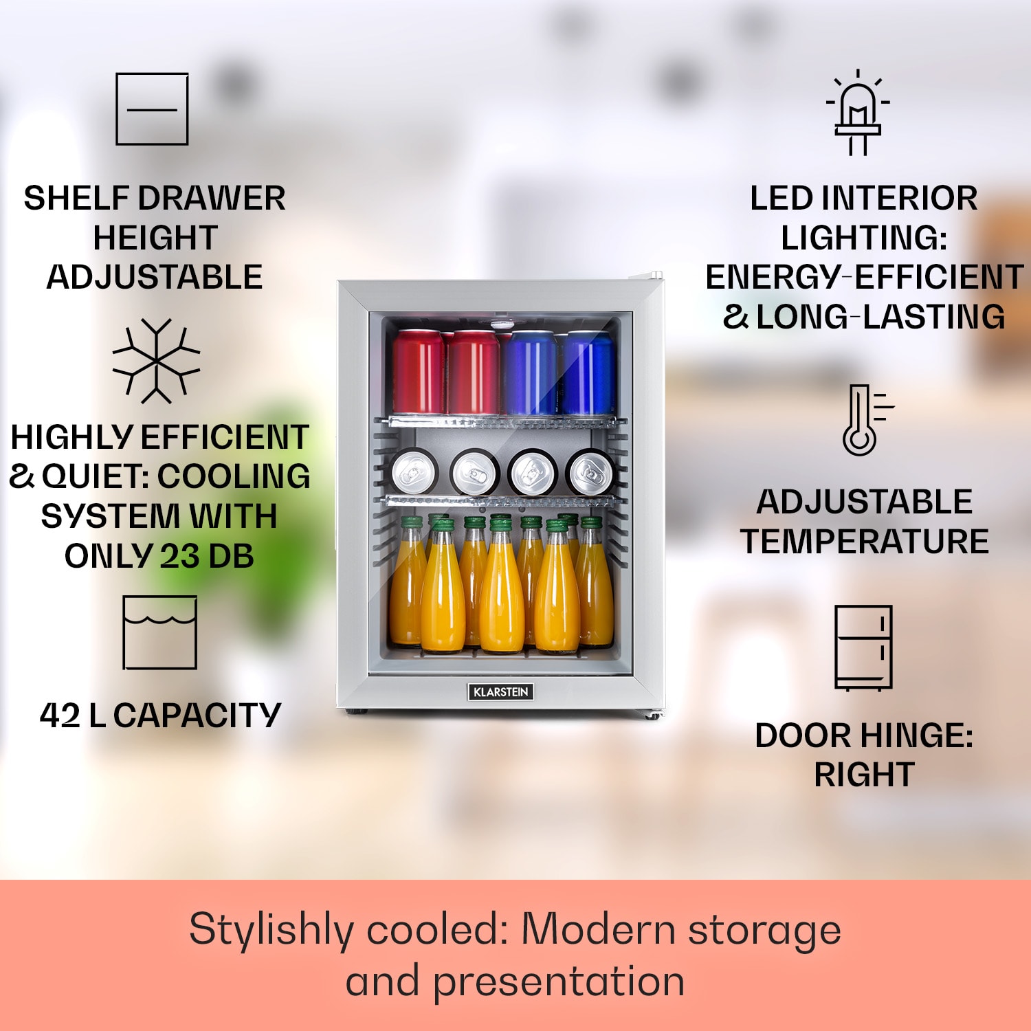Kompaktná s veľkou úložnou kapacitou: mini-chladnička Klarstein Brooklyn 42 ponúka dostatok priestoru so 42 litrami úžitkového objemu. Na chladenie podľa potreby je možné nastaviť teplotu v rozsahu 12 až 18 °C. Brooklyn 42 pôsobí výnimočným dojmom predovšetkým vďaka senzačnému dizajnu: panoramatické sklenené dvere umožňujú neustály výhľad do jej interiéru. Vnútorné LED svetlo osvetľuje uložené potraviny, zatiaľ čo systém automatického odmrazovania Auto DeFrost minimalizuje tvorbu ľadu v chladničke aj pri častom otváraní dvierok.Prínos pre každú malú domácnosť: Klarstein Brooklyn 42 Minibar.