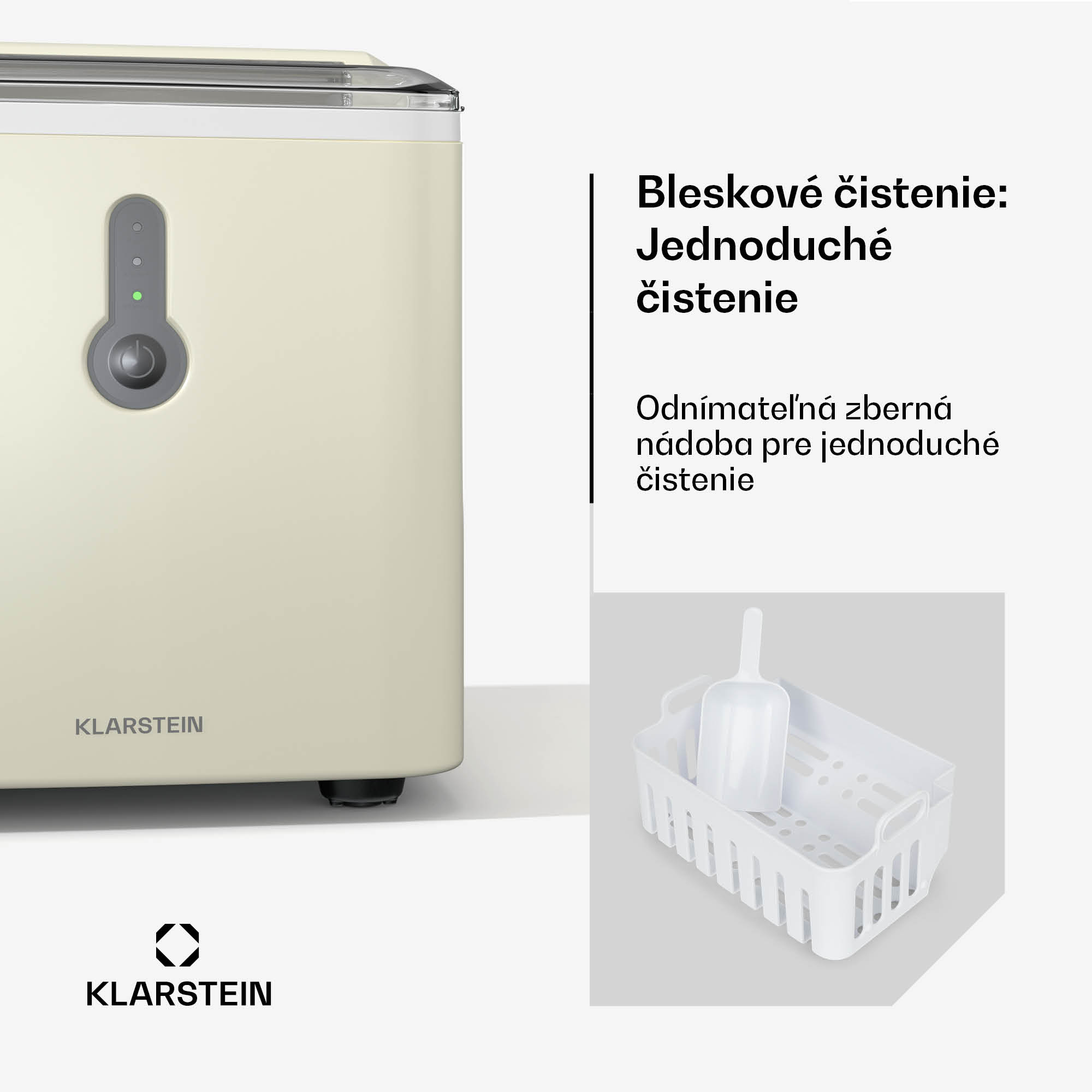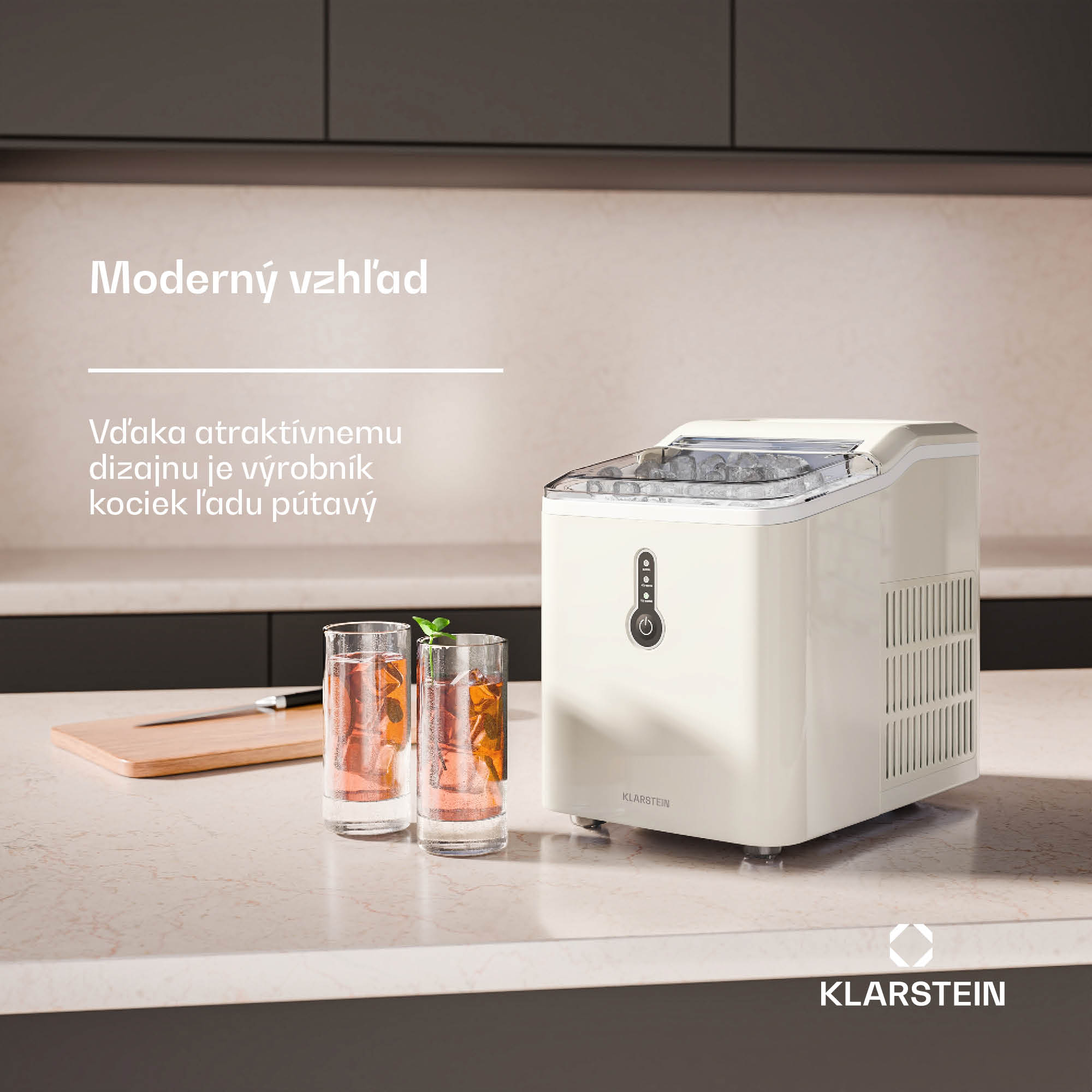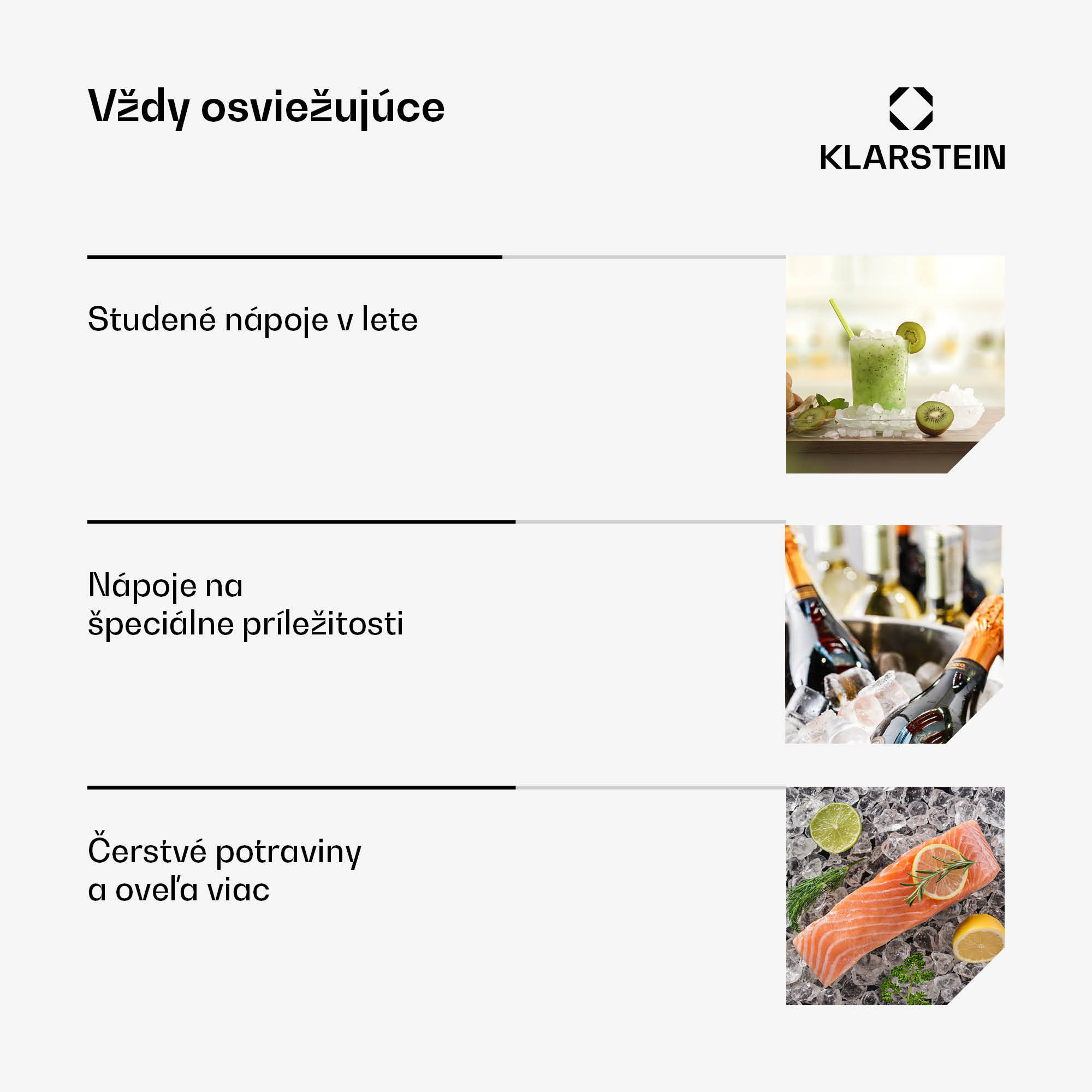 Dobre vychladené jednoducho chutí lepšie: S výrobníkom ľadových kociek Klarstein Chillout môžete vyčarovať kocky ľadu pre svoje nápoje za okamih.Výkonný stroj na výrobu ľadových kociek Chillout vyrobí až 12 kg ľadu denne a je ideálny pre použitie na večierky alebo záhradné párty. Osobitnú pozornosť sme pritom venovali tomu, aby bola obsluha čo najjednoduchšia a nekomplikovaná. Stačí naplniť vodou, zapnúť a už po 8 minútach sa do zberného koša vysype prvých 9 kociek ľadu. Tu nemusíte nič nastavovať, všetko funguje úplne automaticky. LED indikátory vás upozornia na nízku hladinu vody alebo plnú odkvapkávaciu misku. Cez priehľadnú klapku môžete kedykoľvek sledovať, ako kocky ľadu rastú. Súčasťou balenia je malá lopatka na jednoduché vyberanie kociek – alebo môžete celý zberný kôš vybrať priamo z prístroja, napr. na naplnenie ľadovej plochy na čerstvé ryby a podobne. Po použití sa chuťovo neutrálne puzdro ľahko čistí a elegantný dizajn s priehľadným krytom dokonale zapadne do každého prostredia. Vďaka nízkej hmotnosti je výrobník ľadu prenosný a poskytuje plne mobilný zdroj ľadu na bare na každej párty.Čas na lahodné nápoje! S výrobníkom kociek ľadu Klarstein Chillout sa dajú krásne tvarované kocky ľadu vyrobiť už za niekoľko minút.Objednajte si ešte dnes a ochlaďte sa doma!