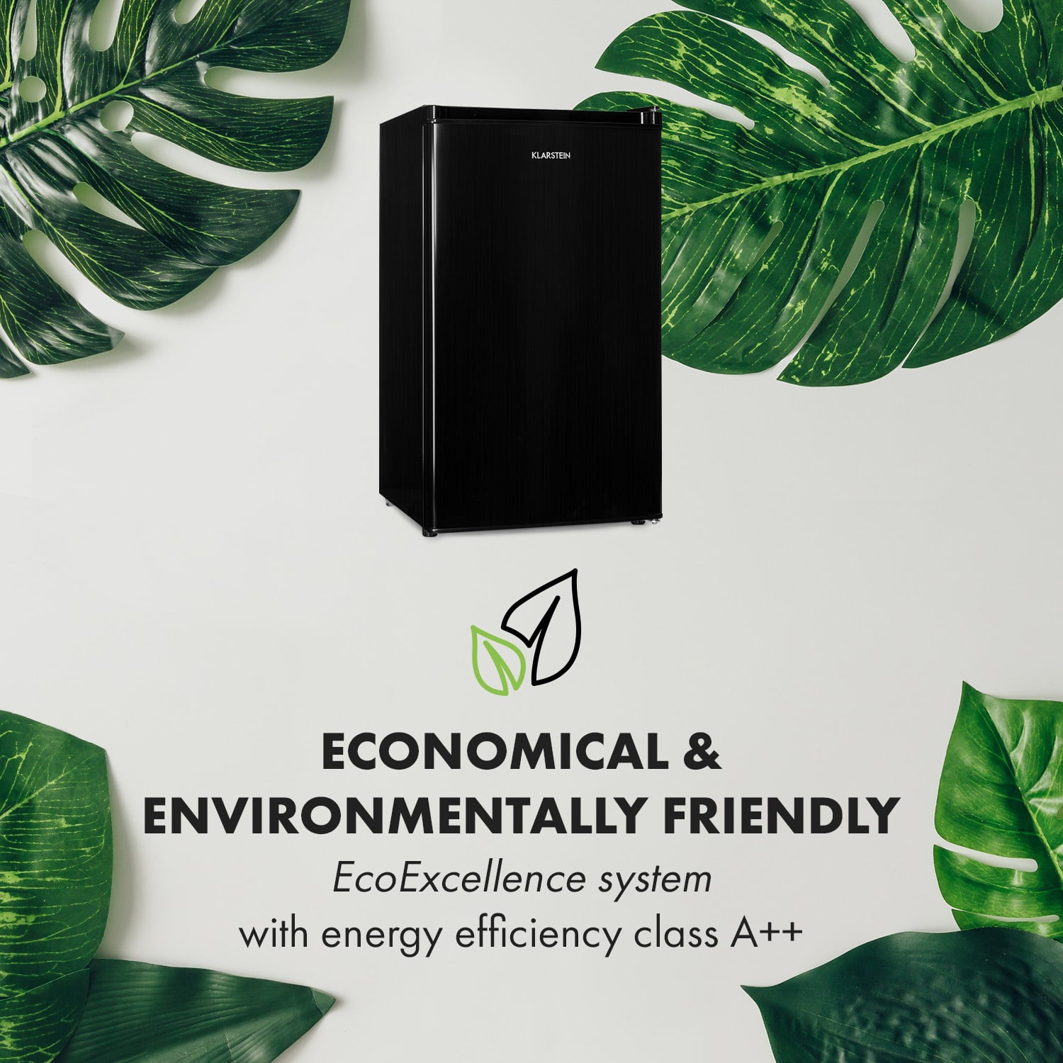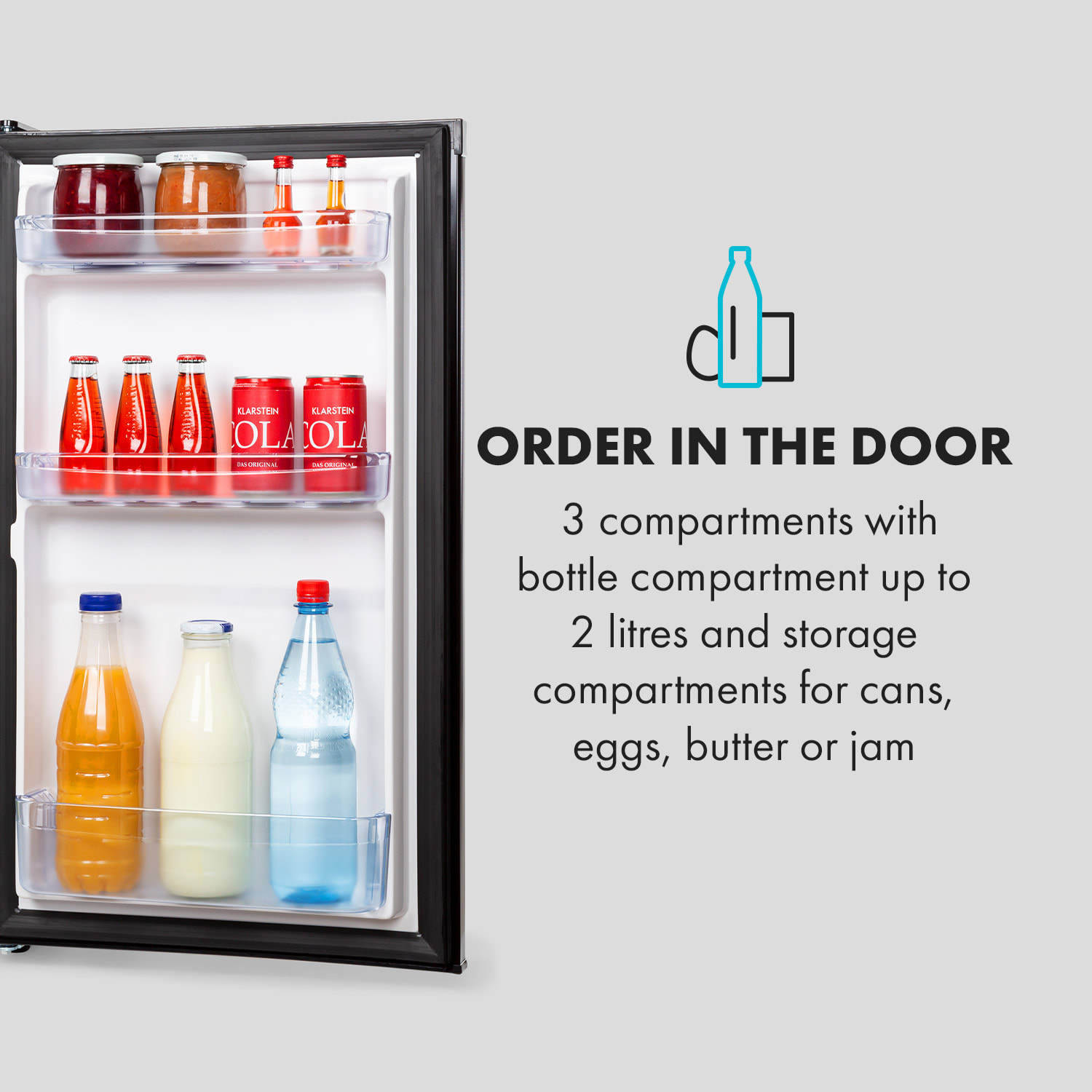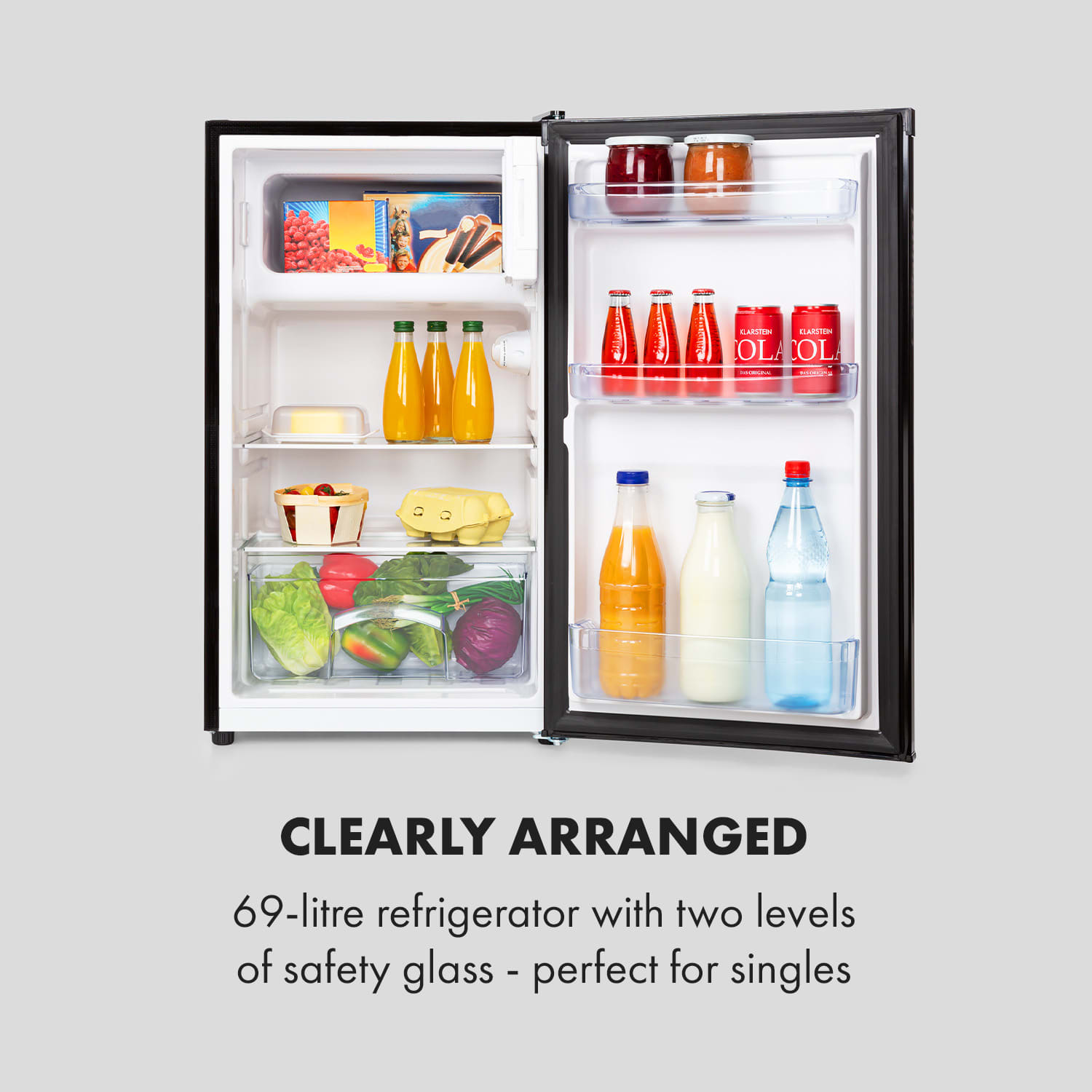 Chladnička s mrazničkou Klarstein Cool Cousin s celkovou kapacitou 81 litrov prináša poriadok a prehľadnosť v čerstvom skladovaní potravín malých domácností.Vybavená dvomi vyťahovacími sklenenými policami a objemom 70 litrov ponúka chladnička dostatok priestoru pre všetky potreby čerstvého jedla jednočlennej až dvojčlennej domácnosti. Fľaše veľkosti do 2 litrov, plechovky a občerstvenie sa uskladňujú v troch odkladacích priestoroch vo dverách, zatiaľ čo čerstvá zelenina je uložená vo vyťahovacom priečinku na zachovanie chrumkavosti. Udržuje uhorky a šalát takmer pri 0 °C podstatne dlhšie čerstvé a chrumkavé ako bežné priehradky na zeleninu. Odnímateľné súčasti uľahčujú čistenie.O ľadovú sviežosť sa postará 3-hviezdičkový mraziaci box vo vnútri zariadenia Klarstein Cool Cousin. Dá sa tu uskladniť mrazená zelenina, hranolky či pizza na doplnenie bežného jedálnička.Chladnička s mrazničkou Klarstein Cool Cousin sa hodí takmer do každého obytného priestoru a štýlu. V ideálnom prípade je vhodná ako moderné prvé zariadenie v domácnostiach jednotlivcov alebo v študentských domácnostiach, v prázdninovom domčeku alebo v párty miestnosti. Chladiacu službu poskytuje s triedou energetickej účinnosti E a s nízkym prevádzkovým hlukom s hodnotou iba 40 dB. Tým chráni nielen peňaženku, ale aj nervy.