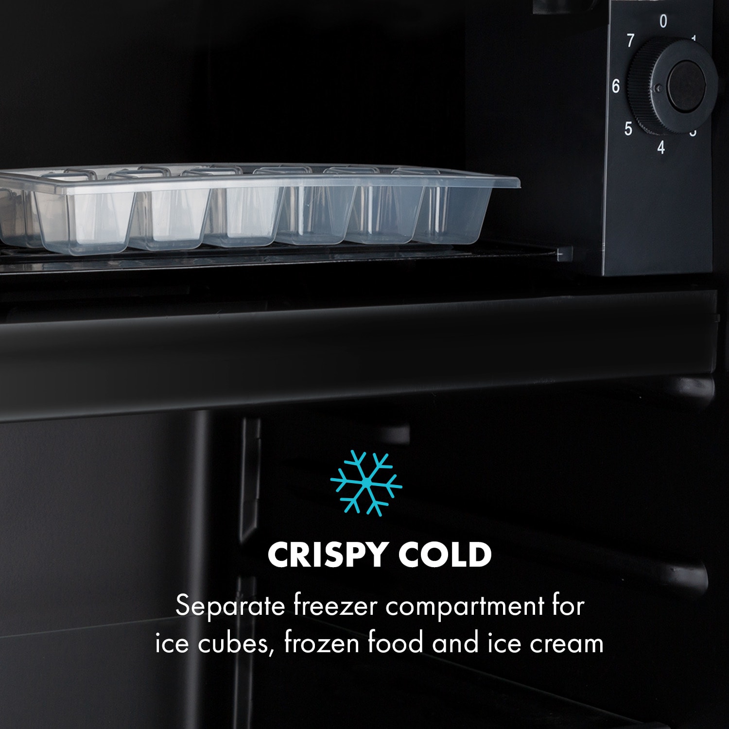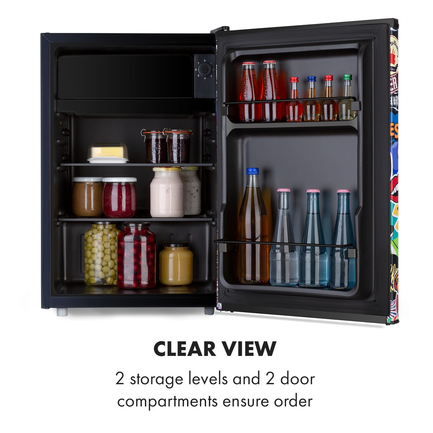 Komiksový superhrdina medzi kompaktnými chladničkami! Chladnička Klarstein Cool Vibe 70+ má objem 72 litrov a 3 úrovne, čo poskytuje dostatok priestoru pre všetky druhy potravín. Dve priehradky vo dverách poskytujú potrebný úložný priestor na fľaše a poháre. V samostatnej mraziacej priehradke v hornej časti sú navyše vždy pripravené kocky ľadu, mrazené potraviny alebo zmrzlina. Táto mini chladnička Klarstein Cool Vibe 70+ zodpovedá svojmu názvu nielen svojím interiérom: jej predná strana je navrhnutá s osviežujúcou potlačou. Cool výroky, emotikony a drzé obrázky – nech sa páči, Cool Vibe 70+ to všetko má!