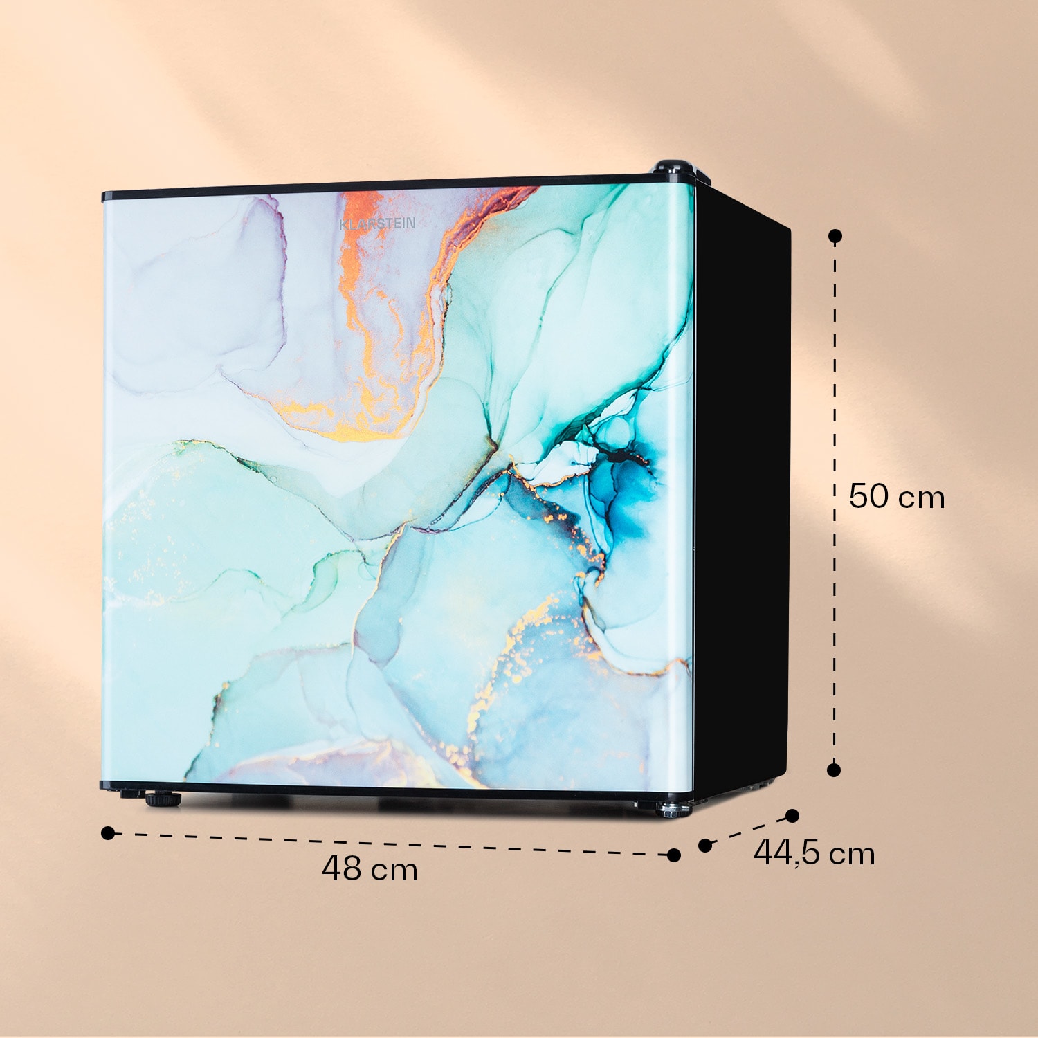Kombinovaná čerstvosť pre Váš domov. Kombinácia chladničky s mrazničkou Klarstein CoolArt spája priestorovú výhodu mini chladničky s malou 1,5 litrovou mrazničkou a dizajnovou prednou stranou, ktorá prináša farebnosť do Vašej kuchyne. So svojim objemom 45 litrov je ideálnou chladničkou pre singles, alebo do hosťovských izieb alebo záhradných domčekov. Vďaka jej tichému chodu s 37 dB neruší ani Vaše myšlienky, ani spánok.Elegantné chladenie do malého priestoru: Kombinácia chladničky s mrazničkou Klarstein CoolArt.