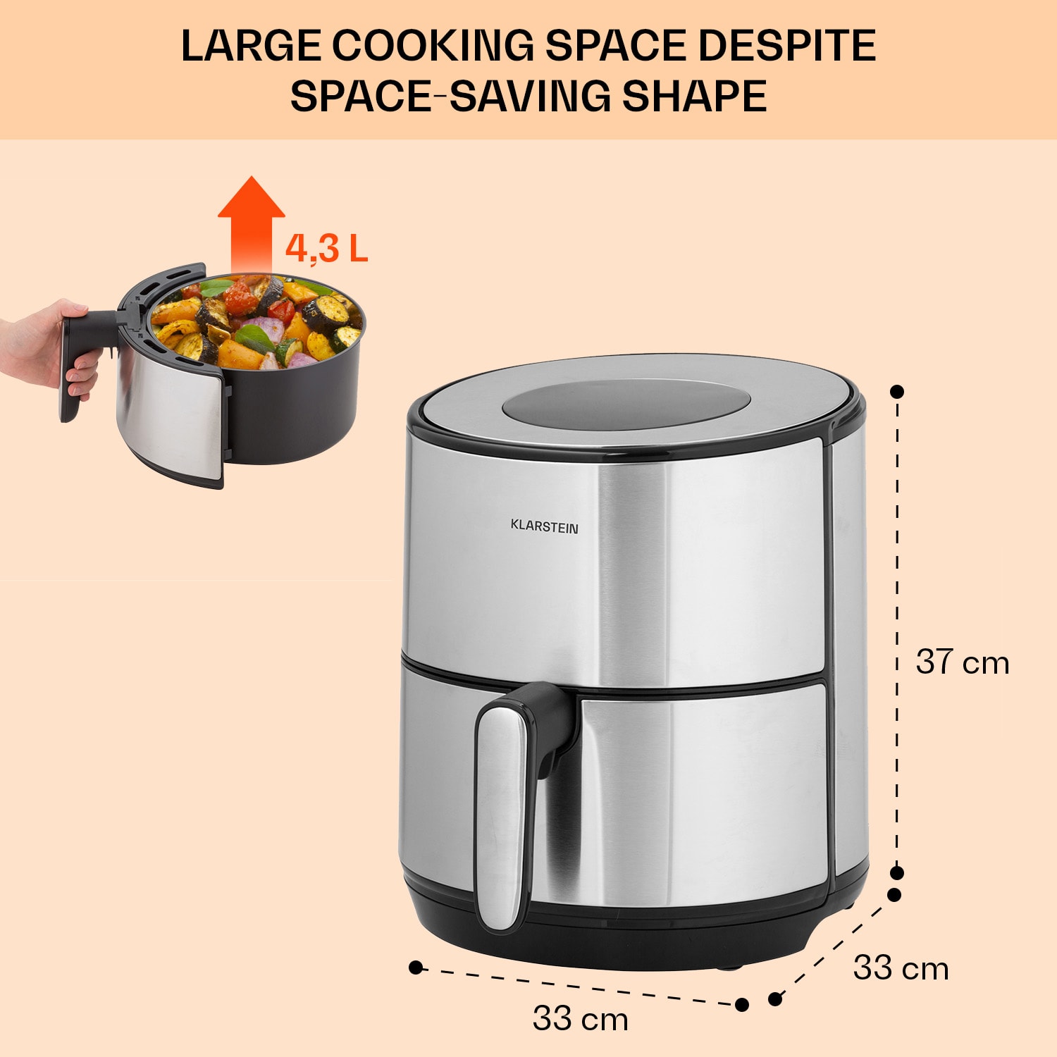 Raz, dva, tri, a je to chrumkavé! Teplovzdušná fritéza Pro-Crisp od Klarstein vám rýchlo a jednoducho pripraví fritované pochúťky, ako sú hranolky, kuracie krídla, krokety a mnoho ďalších, všetko s nízkym obsahom tuku, a teda zdravým spôsobom.Vďaka cirkulujúcemu horúcemu vzduchu fritéza Pro-Crisp frituje, pečie, griluje alebo opeká s výkonom 1500 W a jedlo pripravý šetrne a rýchlo zo všetkých strán. Rozmrazovanie nie je potrebné. Air Fryer s objemom 4,3 litra ponúka extra veľa priestoru na hranolky, kuracie stehná, ryby alebo zeleninu. Teplotu a čas prípravy môžete naprogramovať samostatne alebo použiť jeden z 8 prednastavených programov. Aby ste po jedle všetko rýchlo a jednoducho všetko zvládli, fritovacia nádoba je potiahnutá nepriľnavou vrstvou a dá sa vyčistiť za okamih. AJ nádoba a grilovací rošt sú vhodné do umývačky riadu. Objavte zdravý a chrumkavý spôsob fritovania s teplovzdušnou fritézou Pro-Crisp od Klarstein.