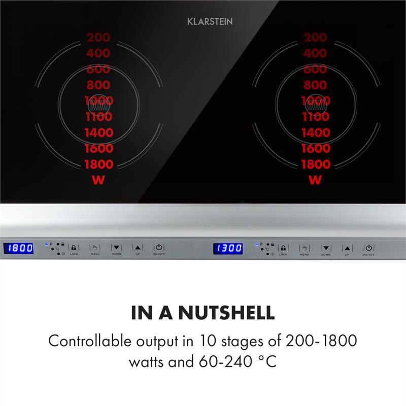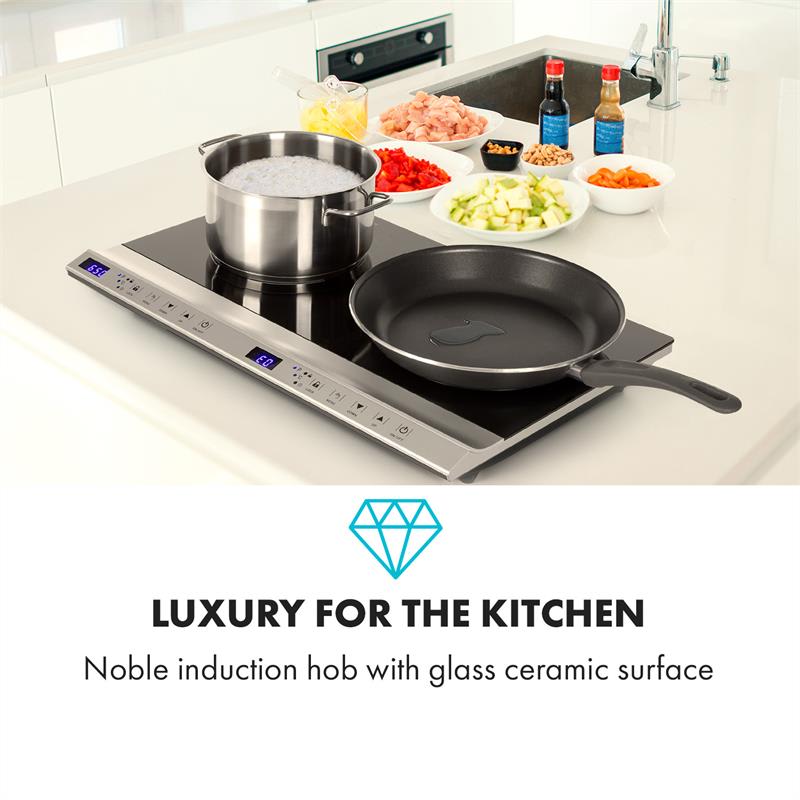 Jednoducho flexibilné varenie: indukčná varná doska Klarstein Cucinata umožňuje optimálne využitie priestoru pri varení. Kombinuje pri tom technické inovácie s elegantným vzhľadom a prináša do kuchynskej linky so svojím skleneným povrchom nový lesk.Indukčná varná doska Cucinata ponúka dve varné platne s celkovým výkonom až 3100 W, ktoré sa rozdeľujú na 1800 W a 1300 W na jednotlivých varných plochách a zohrievajú obsah hrncov a panvíc v špičkových časoch.Obidve varné zóny varnej dosky sa ovládajú nekomplikovane na dotykovom ovládacom paneli s LED displejom. Okrem výkonu a teploty sa dá pre každú varnú plochu naprogramovať časovač automatického vypnutia až do 180 minút. Aby počas varenia všetko prebiehalo hladko, indukčná varná doska Cucinata má širokú škálu poistiek: ochrana proti prehriatiu sa aktivuje, ak je varná platňa príliš horúca. Ak hrniec nie je vhodný, spustí sa automatické vypnutie. Okrem toho môže byť aktivovaná detská poistka, aby sa zabránilo náhodným zmenám nastavení varenia.Opticky zaujme indukčná varná doska Cucinata od spoločnosti Klarstein svojím skleneným povrchom s jednoduchou údržbou a striebornou prednou časťou. Týmto spôsobom sa varná doska jednoducho začlení do každej kuchynskej linky.