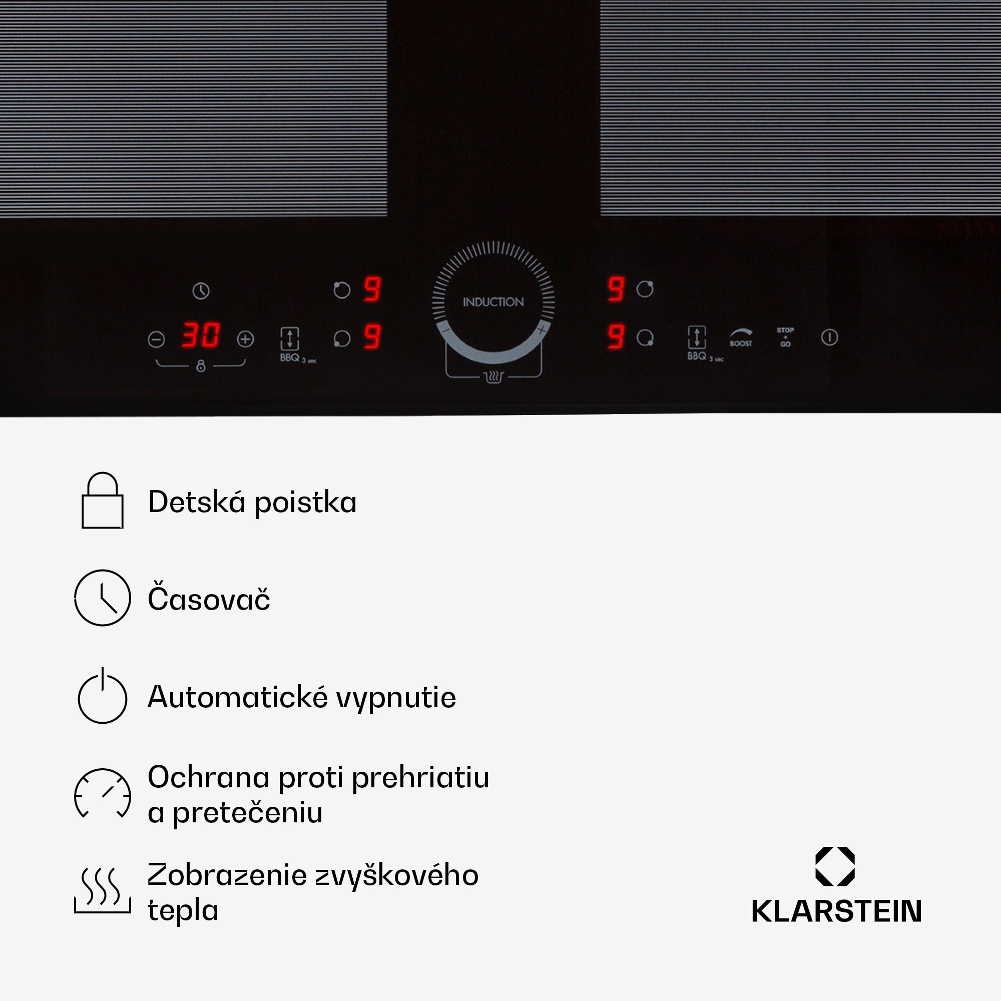 Jednoducho flexibilné varenie: Indukčná varná doska Klarstein Delicatessa 60 umožňuje optimálne využitie priestoru s minimálnou spotrebou energie pri varení. Kombinuje pri tom technické inovácie s luxusným vzhľadom a prináša do kuchynskej linky so svojím sklokeramickým povrchom nový lesk. Vstavaná varná doska Klarstein Delicatessa 60 ponúka štyri varné platne s celkovým výkonom až 7000 W (2 x 2000 W), ktoré sa rozdeľujú na 2 x 2000 W a 2 x 1500 W na jednotlivých varných plochách – vďaka čomu obsah hrncov a panvíc zovrie v špičkových časoch. Pritom sa zjednocujú dve varné zóny do jednej flexi zóny pomocou funkcie VarioHeating: Vďaka funkcii rozpoznania veľkosti hrncov sa s maximálnou flexibilitou prispôsobujú veľkosti hrncov, panvíc alebo kastrólov, umiestnených na vrchu, a môžu byť tiež spoločne použité na rozpálenie veľkého kuchynského riadu. Na jednej strane zariadenie Delicatessa 60 naozaj využíva len energiu, ktorá je vhodná pre daný hrniec, a na druhej strane umožňuje používať takmer akúkoľvek veľkosť hrnca alebo panvice. Výkon všetkých plôch je možné ovládať samostatne a majú k dispozícii funkciu ThermoBoost, ktorá zvyšuje výkon s cieľom rýchleho zohrievania na 2800 W. Sklokeramická varná doska Klarstein Delicatessa 60 sa jednoducho ovláda pomocou integrovaného dotykového panelu SenseControl s Touch-to-slide ovládaním výkonu posunutím prsta po ploche a pomocou digitálneho displeja. Takže ani gombíky a regulátory nenarúšajú povrch kuchynskej linky. Okrem výkonu sa dá naprogramovať aj časovač až na 99 minút pre každú varnú dosku. Časovač buď vypne varnú dosku po uplynutí nastaveného času, alebo vydá akustický signál. Aby počas varenia všetko prebiehalo hladko, vstavaný sporák Delicatessa 60 má širokú škálu poistiek: Ochrana proti prehriatiu s automatickým vypnutím sa stane aktívnou, ak je varná platňa príliš horúca. Indikátor zvyškového tepla princípu EcoThermal Control vás informuje nielen o tom, či sú vypnuté varné plochy stále horúce. Umožňuje tiež varenie pomocou zvyškového tepla na úsporu energie. Funkcia ThermalRecall si pamätá nastavenú teplotu a použije sa, ak by bol proces varenia krátkodobo prerušený a neskôr by sa v ňom malo pokračovať. Okrem toho môže byť aktivovaný detský zámok, aby sa zabránilo náhodným zmenám nastavení varenia. Opticky indukčná varná doska Klarstein Delicatessa 60 presviedča svojím ľahko udržiavateľným sklokeramickým povrchom, ktorý skúsene uvádza indukčný sporák na scénu. Týmto spôsobom sa varná doska hravo začlení do každej kuchyne – či už klasickej, alebo modernej. Materiál, potrebný na inštaláciu do pracovnej dosky, je priamo súčasťou balenia.